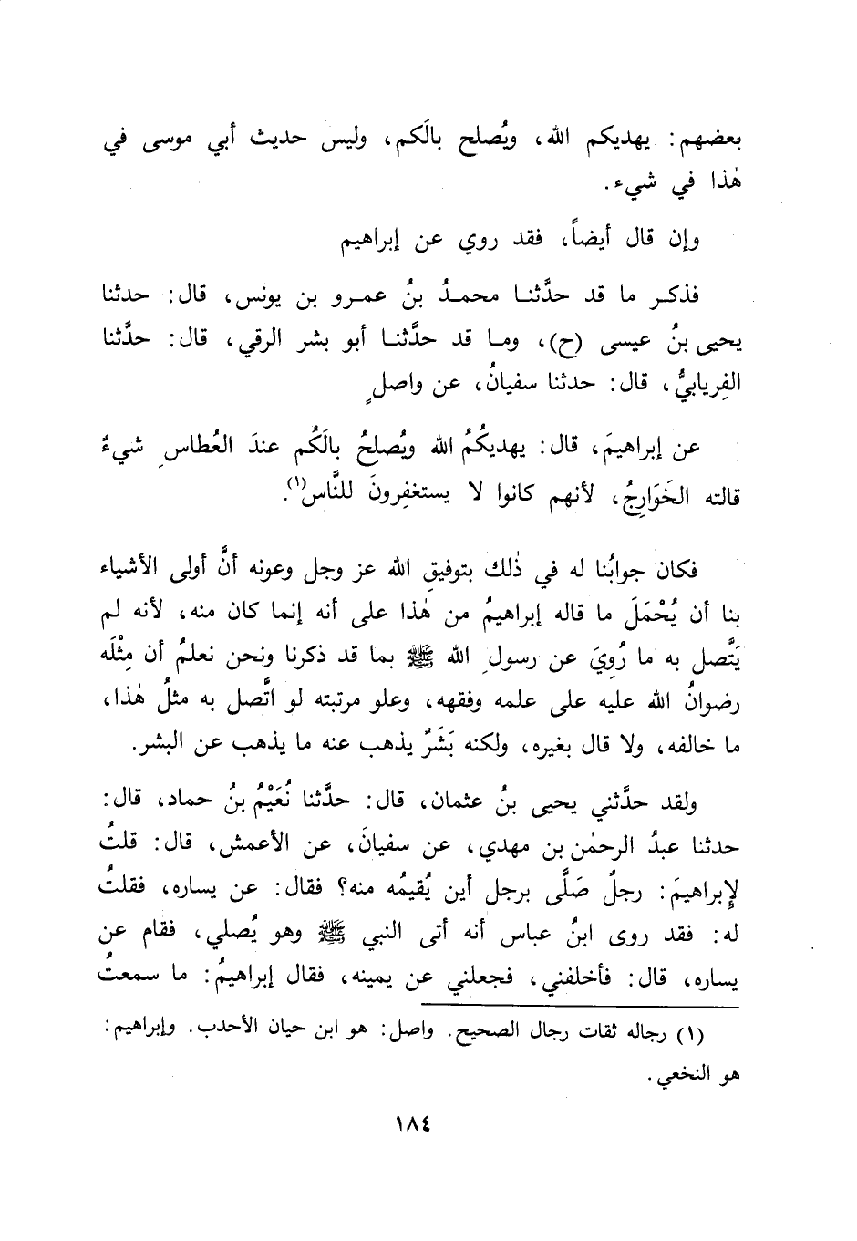 وَلَقَدْ حَدَّثَنِي يَحْيَى بْنُ عُثْمَانَ، قَالَ: حَدَّثَنَا نُعَيْمُ بْنُ حَمَّادٍ، قَالَ: حَدَّثَنَا عَبْدُ الرَّحْمَنِ بْنُ مَهْدِيٍّ، عَنْ سُفْيَانَ، عَنِ الْأَعْمَشِ، قَالَ: قُلْتُ لِإِبْرَاهِيمَ: " رَجُلٌ صَلَّى بِرَجُلٍ أَيْنَ يُقِيمُهُ مِنْهُ؟ فَقَالَ: عَنْ يَسَارِهِ، فَقُلْتُ لَهُ: فَقَدْ رَوَى ابْنُ عَبَّاسٍ: " أَنَّهُ أَتَى النَّبِيَّ صَلَّى اللَّهُ عَلَيْهِ وَسَلَّمَ وَهُوَ يُصَلِّي، فَقَامَ عَنْ يَسَارِهِ، قَالَ: فَأَخْلَفَنِي، فَجَعَلَنِي عَنْ يَمِينِهِ " فَقَالَ إِبْرَاهِيمُ: مَا سَمِعْتُ -[185]- بِهَذَا " أَيْ: فَلَمَّا سَمِعْتُ بِهِ، كَانَ أَوْلَى مِنَ الَّذِي قُلْتُ , وَهَكَذَا يَجِبُ أَنْ يُسْتَعْمَلَ فِيهِ وَفِي أَمْثَالِهِ مِنْ أَهْلِ الْعِلْمِ رِضْوَانُ اللهِ عَلَيْهِمْ وَاللهَ عَزَّ وَجَلَّ نَسْأَلُهُ التَّوْفِيقَ