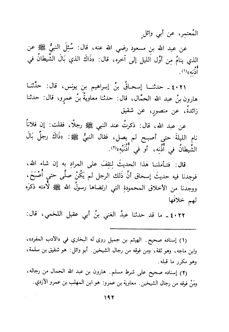 4021 - حَدَّثَنَا إِسْحَاقُ بْنُ إِبْرَاهِيمَ بْنِ يُونُسَ، قَالَ: حَدَّثَنَا هَارُونُ بْنُ عَبْدِ اللهِ الْحَمَّالُ، قَالَ: حَدَّثَنَا مُعَاوِيَةُ بْنُ عَمْرٍو، قَالَ: حَدَّثَنَا زَائِدَةُ، عَنْ مَنْصُورٍ، عَنْ شَقِيقٍ، عَنْ عَبْدِ اللهِ، قَالَ: ذَكَرْتُ عِنْدَ النَّبِيِّ صَلَّى اللَّهُ عَلَيْهِ وَسَلَّمَ رَجُلًا، فَقُلْتُ: إِنَّ فُلَانًا نَامَ اللَّيْلَةَ حَتَّى أَصْبَحَ لَمْ يُصَلِّ، فَقَالَ النَّبِيُّ صَلَّى اللَّهُ عَلَيْهِ وَسَلَّمَ: " ذَاكَ رَجُلٌ بَالَ الشَّيْطَانُ فِي أُذُنِهِ، أَوْ فِي أُذُنَيْهِ " قَالَ: فَتَأَمَّلْنَا هَذَا الْحَدِيثَ لِنَقِفَ عَلَى الْمُرَادِ بِهِ إِنْ شَاءَ اللهُ، فَوَجَدْنَا فِيهِ حَدِيثَ إِسْحَاقَ أَنَّ ذَلِكَ الرَّجُلَ لَمْ يَكُنْ صَلَّى حَتَّى أَصْبَحَ، وَوَجَدْنَا مِنَ الْأَخْلَاقِ الْمَحْمُودَةِ الَّتِي ارْتَضَاهَا رَسُولُ اللهِ صَلَّى اللَّهُ عَلَيْهِ وَسَلَّمَ لِأُمَّتِهِ ذِكْرَهُ لَهُمْ خِلَافَهَا "