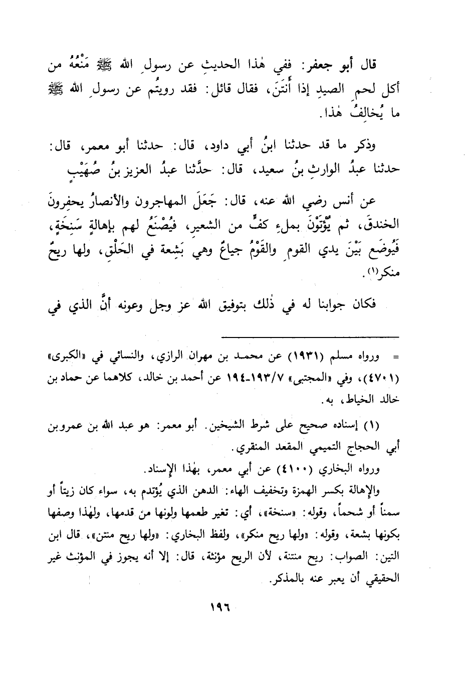 وَذَكَرَ مَا قَدْ حَدَّثَنَا ابْنُ أَبِي دَاوُدَ، قَالَ: حَدَّثَنَا أَبُو مَعْمَرٍ، قَالَ: حَدَّثَنَا عَبْدُ الْوَارِثِ بْنُ سَعِيدٍ، قَالَ: حَدَّثَنَا عَبْدُ الْعَزِيزِ بْنُ صُهَيْبٍ، عَنْ أَنَسٍ رَضِيَ اللهُ عَنْهُ، قَالَ: " جَعَلَ الْمُهَاجِرُونَ وَالْأَنْصَارُ يَحْفِرُونَ الْخَنْدَقَ، ثُمَّ يُؤْتَوْنَ بِمِلْءِ كَفٍّ مِنَ الشَّعِيرِ، فَيُصْنَعُ لَهُمْ بِإِهَالَةٍ سَنِخَةٍ، فَيُوضَعُ بَيْنَ يَدَيِ الْقَوْمِ، وَالْقَوْمُ جِيَاعٌ وَهِيَ بَشِعَةٌ فِي الْحَلْقِ، وَلَهَا رِيحٌ مُنْكَرٌ " فَكَانَ جَوَابَنَا لَهُ فِي ذَلِكَ بِتَوْفِيقِ اللهِ عَزَّ وَجَلَّ وَعَوْنِهِ أَنَّ الَّذِيَ فِي -[197]- هَذَا الْحَدِيثِ غَيْرُ الَّذِي فِي الْحَدِيثِ الْأَوَّلِ؛ لِأَنَّ الَّذِي فِي الْحَدِيثِ الْأَوَّلِ فِي لَحْمِ الْمُذَكَّى الَّذِي قَدْ عَادَ بِالنَّتِنِ الَّذِي حَدَثَ فِيهِ حَتَّى أَعَادَهُ إِلَى الْجِيَفِ مِنَ الْمَيْتَاتِ، وَأَعَادَهُ بِهَا إِلَى الْخَبَائِثِ الَّتِي حَرَّمَهَا بِقَوْلِهِ عَزَّ وَجَلَّ فِي صِفَةِ نَبِيِّهِ، وَهُوَ قَوْلُهُ: {وَيُحِلُّ لَهُمُ الطَّيِّبَاتِ وَيُحَرِّمُ عَلَيْهِمُ الْخَبَائِثَ} [الأعراف: 157] ، وَهَذَا مِنَ الْخَبَائِثِ وَأَمَّا الْإِهَالَةُ، فَلَيْسَ مِنَ الْأَشْيَاءِ الَّتِي حَلَّتْ فِي بَدَنِهَا بِالذَّكَاةِ، وَإِنَّمَا هِيَ مِمَّا سِوَى ذَلِكَ كَالسَّمْنِ وَاللَّبَنِ وَكَمَا أَشْبَهَهُمَا، وَكَانَ حُدُوثُ السَّنَخِ فِيهِ إِنَّمَا هُوَ تَغَيُّرُ طَعْمِهِ لَا فَسَادُهُ فِي نَفْسِهِ كَفَسَادِ اللَّحْمِ الَّذِي ذَكَرْنَاهُ قَبْلَهُ، وَإِنَّمَا حُدُوثِ ذَلِكَ فِيهِ كَحُدُوثِ السَّنَخِ فِي الْأَدْهَانِ الَّتِي يَدَّهِنُ النَّاسُ بِهَا، وَفِي الزَّيْتِ الَّذِي يَأْتَدِمُونَ بِهِ، فَلَيْسَ ذَلِكَ مِمَّا قَدْ يُحَرِّمُ وَاحِدًا مِنْهُمَا عَلَيْهِمْ، كَمَا لَا يَحْرُمُ حُدُوثُ مِثْلِ ذَلِكَ فِي الْمَاءِ الَّذِي يَشْرَبُونَهُ، وَيَتَطَهَّرُونَ بِهِ ذَلِكَ الْمَاءُ عَلَيْهِمْ؛ لِأَنَّ ذَلِكَ عَارِضٌ فِيهِ لَا انْقِلَابَ لَهُ إِلَى نَوْعٍ آخَرَ، كَانْقِلَابِ اللَّحْمِ إِلَى الْفَسَادِ الَّذِي يَنْقَلِبُ إِلَيْهِ، فَيَصِيرُ بِهِ كَالْأَشْيَاءِ الْمَذْمُومَةِ مِنَ الْجِيَفِ وَمِمَّا سِوَاهَا وَاللهَ نَسْأَلُهُ التَّوْفِيقَ