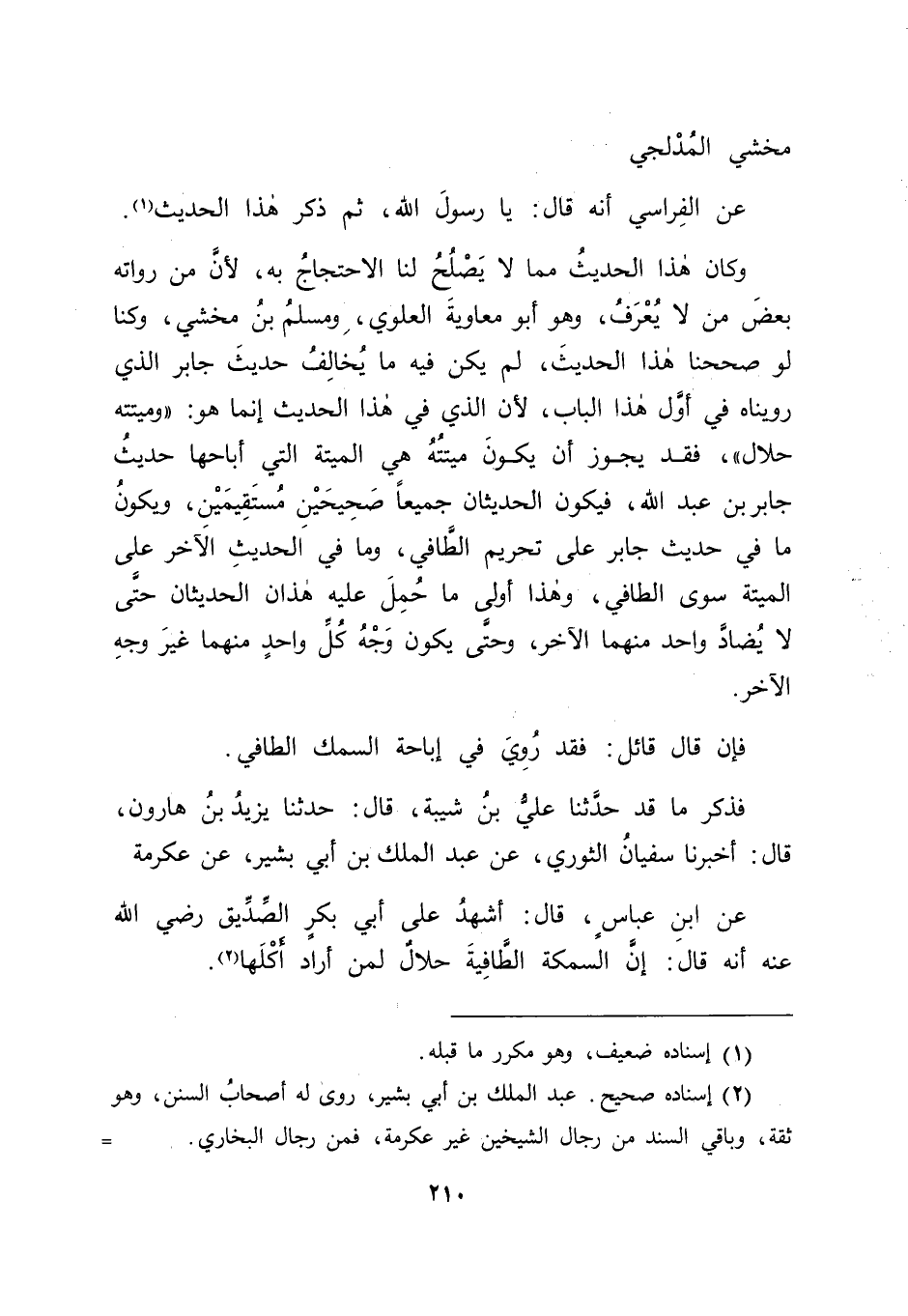 فَذَكَرَ مَا قَدْ حَدَّثَنَا عَلِيُّ بْنُ شَيْبَةَ، قَالَ: حَدَّثَنَا يَزِيدُ بْنُ هَارُونَ، قَالَ: أَخْبَرَنَا سُفْيَانُ الثَّوْرِيُّ، عَنْ عَبْدِ الْمَلِكِ بْنِ أَبِي بَشِيرٍ، عَنْ عِكْرِمَةَ، عَنِ ابْنِ عَبَّاسٍ، قَالَ: أَشْهَدُ عَلَى أَبِي بَكْرٍ الصِّدِّيقِ رَضِيَ اللهُ عَنْهُ أَنَّهُ قَالَ: " إِنَّ السَّمَكَةَ الطَّافِيَةَ حَلَالٌ لِمَنْ أَرَادَ أَكْلَهَا " -[211]- وَمَا قَدْ حَدَّثَنَا سُلَيْمَانُ بْنُ شُعَيْبٍ، قَالَ: حَدَّثَنَا خَالِدُ بْنُ عَبْدِ الرَّحْمَنِ الْخُرَاسَانِيُّ، قَالَ: حَدَّثَنَا سُفْيَانُ الثَّوْرِيُّ، عَنْ عَبْدِ الْمَلِكِ بْنِ أَبِي بَشِيرٍ، عَنْ عِكْرِمَةَ، عَنِ ابْنِ عَبَّاسٍ، عَنْ أَبِي بَكْرٍ مِثْلَهُ