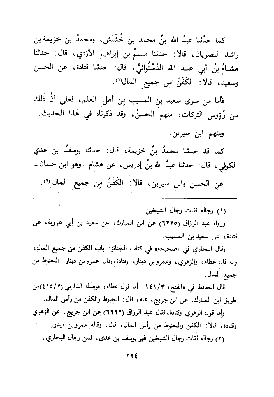 كَمَا حَدَّثَنَا عَبْدُ اللهِ بْنُ مُحَمَّدِ بْنِ خُشَيْشٍ، وَمُحَمَّدُ بْنُ خُزَيْمَةَ بْنِ رَاشِدٍ الْبَصْرِيَّانِ، قَالَا: حَدَّثَنَا مُسْلِمُ بْنُ إِبْرَاهِيمَ الْأَزْدِيُّ، قَالَ: حَدَّثَنَا هِشَامُ بْنُ أَبِي عَبْدِ اللهِ الدَّسْتُوَائِيُّ، قَالَ: حَدَّثَنَا قَتَادَةُ، عَنِ الْحَسَنِ، وَسَعِيدٍ قَالَا: " الْكَفَنُ مِنْ جَمِيعِ الْمَالِ " فَأَمَّا مَنْ سِوَى سَعِيدِ بْنِ الْمُسَيِّبِ مِنْ أَهْلِ الْعِلْمِ، فَعَلَى أَنَّ ذَلِكَ مِنْ رُءُوسِ التَّرِكَاتِ، مِنْهُمُ الْحَسَنُ، وَقَدْ ذَكَرْنَاهُ فِي هَذَا الْحَدِيثِ، وَمِنْهُمُ ابْنُ سِيرِينَ