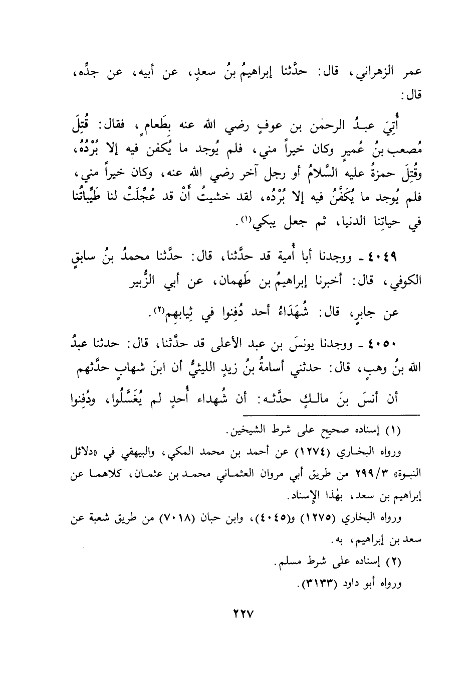 4049 - وَوَجَدْنَا أَبَا أُمَيَّةَ قَدْ حَدَّثَنَا، قَالَ: حَدَّثَنَا مُحَمَّدُ بْنُ سَابِقٍ الْكُوفِيُّ، قَالَ: أَخْبَرَنَا إِبْرَاهِيمُ بْنُ طَهْمَانَ، عَنْ أَبِي الزُّبَيْرِ، عَنْ جَابِرٍ، قَالَ: " شُهَدَاءُ أُحُدٍ دُفِنُوا فِي ثِيَابِهِمْ "