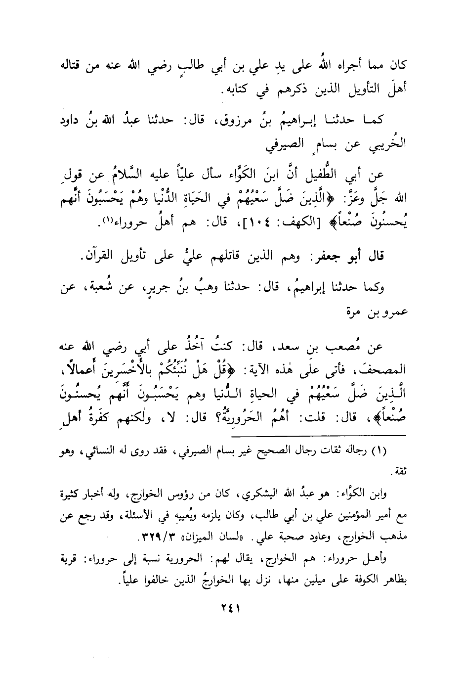 كَمَا حَدَّثَنَا إِبْرَاهِيمُ بْنُ مَرْزُوقٍ، قَالَ: حَدَّثَنَا عَبْدُ اللهِ بْنُ دَاوُدَ الْخُرَيْبِيُّ، عَنْ بَسَّامٍ الصَّيْرَفِيِّ، عَنْ أَبِي الطُّفَيْلِ أَنَّ ابْنَ الْكَوَّاءِ سَأَلَ عَلِيًّا عَلَيْهِ السَّلَامُ عَنْ قَوْلِ اللهِ جَلَّ وَعَزَّ: {الَّذِينَ ضَلَّ سَعْيُهُمْ فِي الْحَيَاةِ الدُّنْيَا وَهُمْ يَحْسَبُونَ أَنَّهُمْ يُحْسِنُونَ صُنْعًا} [الكهف: 104] ، قَالَ: " هُمْ أَهْلُ حَرُورَاءَ " قَالَ أَبُو جَعْفَرٍ: وَهُمُ الَّذِينَ قَاتَلَهُمْ عَلِيٌّ عَلَى تَأْوِيلِ الْقُرْآنِ
