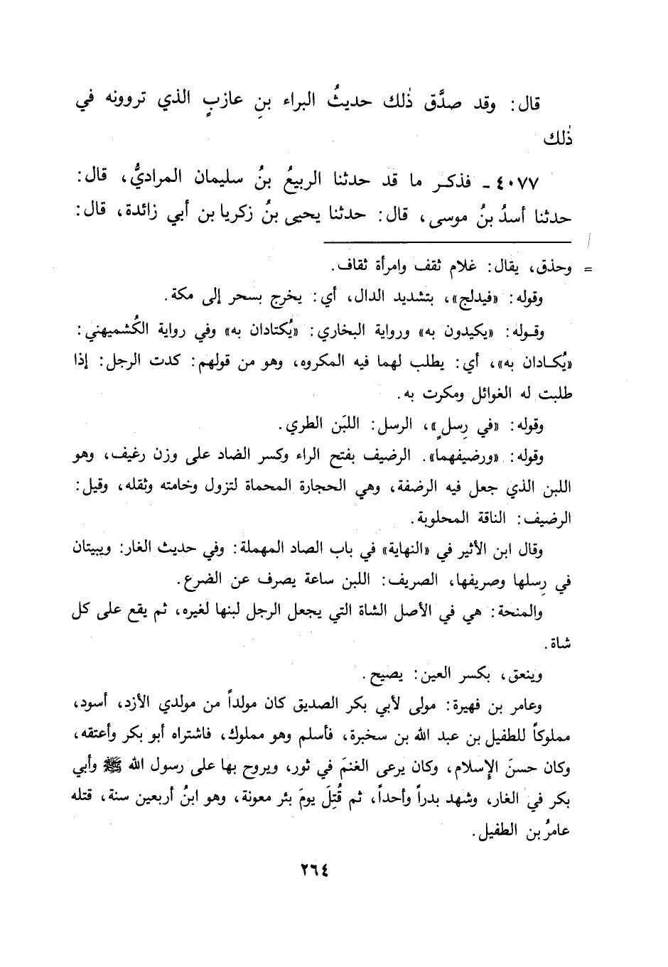 4077 - فَذَكَرَ مَا قَدْ حَدَّثَنَا الرَّبِيعُ بْنُ سُلَيْمَانَ الْمُرَادِيُّ، قَالَ: حَدَّثَنَا أَسَدُ بْنُ مُوسَى، قَالَ: حَدَّثَنَا يَحْيَى بْنُ زَكَرِيَّا بْنِ أَبِي زَائِدَةَ، قَالَ: -[265]- حَدَّثَنِي أَبِي وَغَيْرُهُ، عَنْ أَبِي إِسْحَاقَ، عَنِ الْبَرَاءِ بْنِ عَازِبٍ رَضِيَ اللهُ عَنْهُ، قَالَ: " جَاءَ أَبُو بَكْرٍ رَضِيَ اللهُ عَنْهُ فَاشْتَرَى مِنْ عَازِبٍ رَحْلًا بِثَلَاثَةَ عَشَرَ دِرْهَمًا، فَقَالَ أَبُو بَكْرٍ لِعَازِبٍ: قُلْ لِلْبَرَاءِ، فَلْيَحْمِلْهُ إِلَى رَحْلِي، فَقَالَ: لَا، حَتَّى تُحَدِّثَنِي كَيْفَ أَنْتَ وَرَسُولُ اللهِ صَلَّى اللَّهُ عَلَيْهِ وَسَلَّمَ حِينَ خَرَجْتُمَا وَالْمُشْرِكُونَ يَطْلُبُونَكُمْ فَقَالَ أَبُو بَكْرٍ: " خَرَجْنَا مِنْ مَكَّةَ بِلَيْلٍ وَقَدْ أَخَذَ الْقَوْمُ عَلَيْنَا بِالرَّصَدِ، فَاخْتَبَأْنَا يَوْمَنَا وَلَيْلَتَنَا وَيَوْمَنَا حَتَّى قَامَ قَائِمُ الظَّهِيرَةِ، فَرَمَيْتُ بِبَصَرِي هَلْ أَرَى مِنْ ظِلٍّ نَأْوِي إِلَيْهِ، فَوَقَعَتْ إِلَيْنَا صَخْرَةٌ، فَانْطَلَقْنَا إِلَيْهَا وَلَهَا شَيْءٌ مِنْ ظِلٍّ، فَنَزَلْنَا فَنَظَرْتُ بَقِيَّةَ ظِلِّهَا فَسَوَّيْتُهُ، وَأَخَذْتُ فَرْوَةً كَانَتْ مَعِي، فَوَطَّأْتُ بِهَا لِرَسُولِ اللهِ صَلَّى اللَّهُ عَلَيْهِ وَسَلَّمَ، ثُمَّ قُلْتُ: يَا رَسُولَ اللهِ، اضْطَجِعْ حَتَّى أَنْفُضَ مَا حَوْلَكَ، وَإِذَا غُلَامٌ رَاعٍ قَدْ أَقْبَلَ فِي غَنَمٍ لَهُ يُرِيدُ مِنَ الصَّخْرَةِ مِثْلَ الَّذِي أَرَدْنَا، فَقُلْتُ: لِمَنْ أَنْتَ يَا غُلَامُ؟ فَقَالَ: لِرَجُلٍ مِنْ قُرَيْشٍ وَسَمَّاهُ فَعَرَفْتُهُ، فَقُلْتُ: فَهَلْ فِي غَنَمِكَ مِنْ لَبَنٍ؟ قَالَ: نَعَمْ، فَقُلْتُ: هَلْ أَنْتَ حَالِبٌ لَنَا؟ قَالَ: نَعَمْ، فَأَعْطَيْتُهُ إِنَاءً كَانَ مَعِي، فَأَخَذَ لِيَحْلُبَ، فَقُلْتُ: انْفُضْ ضَرْعَ الشَّاةِ مِنَ الْغُبَارِ، ثُمَّ أَمَرْتُهُ أَنْ يَنْفُضَ كَفَّيْهِ، فَقَالَ هَكَذَا، وَضَرَبَ إِحْدَى كَفَّيْهِ عَلَى الْأُخْرَى، ثُمَّ حَلَبَ لِي كُثْبَةً مِنْ لَبَنٍ، وَقَدْ رَوَيْتُ مَعِي لِرَسُولِ اللهِ صَلَّى اللَّهُ عَلَيْهِ وَسَلَّمَ إِدَاوَةً مِنْ مَاءٍ عَلَى فِيهَا خِرْقَةٌ، فَصَبَبْتُ عَلَى اللَّبَنِ حَتَّى وَجَدْتُ بَرْدَ الْمَاءِ مِنْ تَحْتِ الْإِنَاءِ، فَأَتَيْتُ بِهِ رَسُولَ اللهِ صَلَّى اللَّهُ عَلَيْهِ وَسَلَّمَ فَوَافَقْتُهُ قَدِ اسْتَيْقَظَ، فَقُلْتُ: اشْرَبْ يَا رَسُولَ اللهِ، فَشَرِبَ، قَالَ: قُلْتُ: قَدْ آنَ الرَّحِيلُ، فَارْتَحَلْنَا وَالْقَوْمُ يَطْلُبُونَنَا، فَلَمْ يُدْرِكْنَا غَيْرُ سُرَاقَةَ بْنِ مَالِكِ بْنِ جُعْشُمٍ عَلَى فَرَسٍ لَهُ، فَقُلْتُ: هَذَا الطَّلَبُ قَدْ لَحِقَنَا يَا رَسُولَ اللهِ، قَالَ: " لَا تَحْزَنْ إِنَّ اللهَ مَعَنَا " فَلَمَّا دَنَا مِنْهُ قَيْدَ رُمْحَيْنِ أَوْ ثَلَاثَةٍ، قُلْتُ: -[266]- هَذَا الطَّلَبُ قَدْ لَحِقَنَا، وَبَكَيْتُ، فَقَالَ: " مَا يُبْكِيكَ؟ " فَقُلْتُ: وَاللهِ مَا عَلَى نَفْسِي أَبْكِي، وَلَكِنِّي إِنَّمَا أَبْكِي عَلَيْكَ يَا رَسُولَ اللهِ، فَدَعَا عَلَيْهِ رَسُولُ اللهِ صَلَّى اللَّهُ عَلَيْهِ وَسَلَّمَ، فَقَالَ: " اللهُمَّ اكْفِنَاهُ بِمَا شِئْتَ " فَسَاخَتْ فَرَسُهُ فِي الْأَرْضِ إِلَى بَطْنِهَا، فَوَثَبَ عَنْهَا، ثُمَّ قَالَ: يَا مُحَمَّدُ قَدْ عَلِمْتُ أَنَّ هَذَا عَمَلُكَ، فَادْعُ اللهَ عَزَّ وَجَلَّ أَنْ يُنَجِّيَنِي مِمَّا أَنَا فِيهِ، فَوَاللهِ لَأُعَمِّيَنَّ عَلَى مَنْ وَرَائِي مِنَ الطَّلَبِ، وَهَذِهِ كِنَانَتِي، فَخُذْ سَهْمًا مِنْهَا، فَإِنَّكَ سَتَمُرُّ عَلَى غَنَمِي وَإِبِلِي بِمَكَانِ كَذَا وَكَذَا، فَخُذْ مِنْهَا حَاجَتَكَ، فَقَالَ رَسُولُ اللهِ صَلَّى اللَّهُ عَلَيْهِ وَسَلَّمَ: " لَا حَاجَةَ لَنَا فِي إِبِلِكَ " وَدَعَا لَهُ 