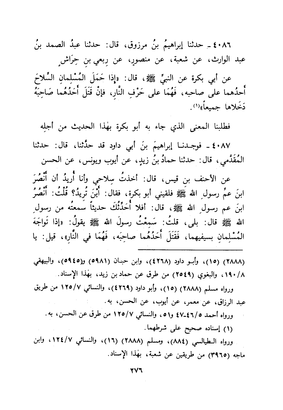 4087 - فَوَجَدْنَا إِبْرَاهِيمَ بْنَ أَبِي دَاوُدَ قَدْ حَدَّثَنَا، قَالَ: حَدَّثَنَا الْمُقَدَّمِيُّ، قَالَ: حَدَّثَنَا حَمَّادُ بْنُ زَيْدٍ، عَنْ أَيُّوبَ، وَيُونُسَ، عَنِ الْحَسَنِ، عَنِ الْأَحْنَفِ بْنِ قَيْسٍ، قَالَ: " أَخَذْتُ سِلَاحِي وَأَنَا أُرِيدُ أَنْ أَنْصُرَ ابْنَ عَمِّ رَسُولِ اللهِ صَلَّى اللَّهُ عَلَيْهِ وَسَلَّمَ فَلَقِيَنِي أَبُو بَكْرَةَ، فَقَالَ: أَيْنَ تُرِيدُ؟ قُلْتُ: أَنْصُرُ ابْنَ عَمِّ رَسُولِ اللهِ صَلَّى اللَّهُ عَلَيْهِ وَسَلَّمَ، قَالَ: أَفَلَا أُحَدِّثُكَ حَدِيثًا سَمِعْتُهُ مِنْ رَسُولِ اللهِ صَلَّى اللَّهُ عَلَيْهِ وَسَلَّمَ؟ قَالَ: بَلَى، قَلْتُ: سَمِعْتُ رَسُولَ اللهِ صَلَّى اللَّهُ عَلَيْهِ وَسَلَّمَ يَقُولُ: " إِذَا تَوَاجَهَ الْمُسْلِمَانِ بِسَيْفَيْهِمَا، فَقَتَلَ أَحَدُهُمَا صَاحِبَهُ، فَهُمَا فِي النَّارِ " قِيلَ: يَا -[277]- رَسُولَ اللهِ هَذَا الْقَاتِلُ، فَمَا بَالُ الْمَقْتُولِ؟ قَالَ: " إِنَّهُ قَدْ أَرَادَ يَقْتُلُ صَاحِبَهُ " فَتَأَمَّلْنَا هَذَا الْحَدِيثَ، فَاحْتَمَلَ أَنْ يَكُونَ عَلِيٌّ رَضِيَ اللهُ عَنْهُ لَمَّا كَانَ رَسُولُ اللهِ صَلَّى اللَّهُ عَلَيْهِ وَسَلَّمَ أَعْلَمَ أَنَّهُ يُقَاتِلُ عَلَى تَأْوِيلِ الْقُرْآنِ كَمَا قَاتَلَ هُوَ صَلَّى اللَّهُ عَلَيْهِ وَسَلَّمَ عَلَى تَنْزِيلِهِ، عُلِمَ بِذَلِكَ أَنَّ ذَلِكَ لَا يَكُونُ مِنْهُ إِلَّا وَهُوَ خَلِيفَةٌ -[278]- لِرَسُولِ اللهِ صَلَّى اللَّهُ عَلَيْهِ وَسَلَّمَ فِيهِ، فَطَلَبَ الْمَنْزِلَةَ الَّتِي يَلْحَقُ بِهَا قِتَالَ مَنْ وَعَدَهُ رَسُولُ اللهِ صَلَّى اللَّهُ عَلَيْهِ وَسَلَّمَ أَنَّهُ يُقَاتِلُهُ، وَأَنْ يَكُونَ طَلْحَةُ وَالزُّبَيْرُ رَضِيَ اللهُ عَنْهُمَا لَمْ يَكُونَا وَقَفَا عَلَى ذَلِكَ مِنْ رَسُولِ اللهِ صَلَّى اللَّهُ عَلَيْهِ وَسَلَّمَ لِعَلِيٍّ رَضِيَ اللهُ عَنْهُ، وَأَنَّ عَلِيًّا لَمْ يَكُنْ عِنْدَهُمَا أَوْلَى بِوِلَايَةِ أَمْرِ هَذِهِ الْأُمَّةِ مِنْ كُلِّ وَاحِدٍ مِنْهُمَا، وَعَلِمَا أَنَّهُمَا لَا بُدَّ لِلنَّاسِ مِمَّنْ يَتَوَلَّى أُمُورَهُمْ لِيُقَاتِلَ عَدُوَّهُمْ مِنْ وَرَائِهِمْ، وَيَقُومَ بِمَا لَا يَقُومُ بِهِ إِلَّا أَئِمَّتُهُمْ مِنْ صَلَوَاتِهِمْ، وَمِنْ وَضْعِ زَكَوَاتِهِمْ فِيمَا يَجِبُ وَضْعُهَا فِيهِ، وَمِنَ الْحَجِّ بِهِمْ، وَمِنْ قَسْمِ فَيْئِهِمْ بَيْنَهُمْ، وَمِنْ إِقَامَةِ الْأَشْيَاءِ سِوَى ذَلِكَ مِنْ أُمُورِ دِينِهِمْ مِمَّا لَا يَقُومُ بِهِ إِلَّا أَئِمَّتُهُمْ، فَقَاتَلَاهُ لِذَلِكَ، وَكَانَ مَعَهُ مِنْ رَسُولِ اللهِ صَلَّى اللَّهُ عَلَيْهِ وَسَلَّمَ تَوْقِيفٌ فِي ذَلِكَ أَوْلَى مِمَّنْ لَيْسَ مَعَهُ مِثْلُ ذَلِكَ، وَإِنَّمَا مَعَهُ مَا يُؤَدِّيهِ إِلَيْهِ تَحَرِّيهِ وَاجْتِهَادُهُ، وَإِنَّمَا كَانَا هُمَا الْمَفْرُوضَانِ عَلَيْهِمَا فِيمَا كَانَا بِسَبِيلِهِ، فَقَاتَلَ كُلُّ فَرِيقٍ مِنْ عَلِيٍّ رَضِيَ اللهُ عَنْهُ وَمِنْهُمَا رِضْوَانُ اللهِ عَلَيْهِمَا عَلَى مَا لَهُ الْقِتَالُ عَلَيْهِ وَكَانَ مَنْ قَاتَلَ مَعَ كُلِّ فَرِيقٍ مِنْ ذَيْنِكَ الْفَرِيقَيْنِ عَلَى مَا يُقَاتِلُ عَلَيْهِ ذَلِكَ الْفَرِيقُ غَيْرَ مَلُومٍ عَلَى ذَلِكَ، بَلْ هُوَ مَحْمُودٌ عَلَيْهِ، وَكَانَ الَّذِي كَانَ مِنْ أَبِي بَكْرَةَ إِلَى الْأَحْنَفِ بْنِ قَيْسٍ لَا عَلَى سَبِيلِ النَّهْيِ لَهُ عَمَّا هُمْ بِهِ، وَلَكِنَّهُ نَبَّهَهُ عَلَى أَنَّ مَا يُرِيدُهُ مِمَّا أَدَّاهُ اجْتِهَادُ الَّذِي قَصَدَ إِلَى الْقِتَالِ مَعَهُ إِلَيْهِ بِغَيْرِ وُقُوفٍ مِنْهُ عَلَى مَا كَانَ مِنْ رَسُولِ اللهِ صَلَّى اللَّهُ عَلَيْهِ وَسَلَّمَ إِلَى عَلِيٍّ رَضِيَ اللهُ عَنْهُ مِمَّا دَعَا النَّاسَ إِلَيْهِ وَقَاتَلَهُمْ عَلَيْهِ مِمَّا هُوَ فَوْقَ الِاجْتِهَا