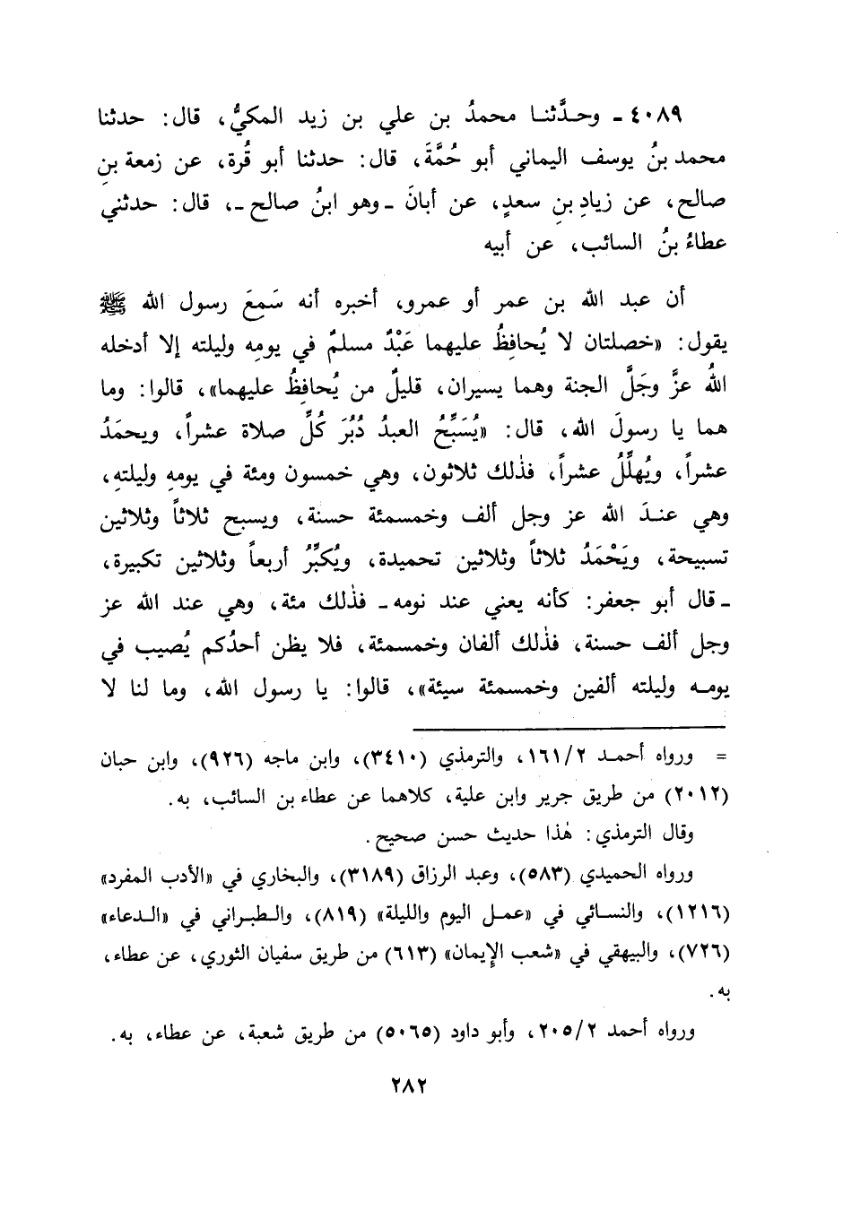 4089 - وَحَدَّثَنَا مُحَمَّدُ بْنُ عَلِيِّ بْنِ زَيْدٍ الْمَكِّيُّ، قَالَ: حَدَّثَنَا مُحَمَّدُ بْنُ يُوسُفَ الْيَمَانِيُّ أَبُو حُمَّةَ، قَالَ: حَدَّثَنَا أَبُو قُرَّةَ، عَنْ زَمْعَةَ بْنِ صَالِحٍ، عَنْ زِيَادِ بْنِ سَعْدٍ، عَنْ أَبَانَ وَهُوَ ابْنُ صَالِحٍ، قَالَ: حَدَّثَنِي عَطَاءُ بْنُ السَّائِبِ، عَنْ أَبِيهِ، أَنَّ عَبْدَ اللهِ بْنَ عُمَرَ أَوْ عَمْرٍو أَخْبَرَهُ أَنَّهُ سَمِعَ رَسُولَ اللهِ صَلَّى اللَّهُ عَلَيْهِ وَسَلَّمَ يَقُولُ: " خَصْلَتَانِ لَا يُحَافِظُ عَلَيْهِمَا عَبْدٌ مُسْلِمٌ فِي يَوْمِهِ وَلَيْلَتِهِ إِلَّا أَدْخَلَهُ اللهُ عَزَّ وَجَلَّ الْجَنَّةَ وَهُمَا يَسِيرَانِ، قَلِيلٌ مَنْ يُحَافِظُ عَلَيْهِمَا " قَالُوا: وَمَا هُمَا يَا رَسُولَ اللهِ؟ قَالَ: " يُسَبِّحُ الْعَبْدُ دُبُرَ كُلِّ صَلَاةٍ عَشْرًا، وَيَحْمَدُ عَشْرًا، وَيُهَلِّلُ عَشْرًا، فَذَلِكَ ثَلَاثُونَ، وَهِيَ خَمْسُونَ وَمِائَةٌ فِي يَوْمِهِ وَلَيْلَتِهِ، وَهِيَ عِنْدَ اللهِ عَزَّ وَجَلَّ أَلْفٌ وَخَمْسُمِائَةِ حَسَنَةٍ، وَيُسَبِّحُ ثَلَاثًا وَثَلَاثِينَ تَسْبِيحَةً، وَيَحْمَدُ ثَلَاثًا وَثَلَاثِينَ تَحْمِيدَةً، وَيُكَبِّرُ أَرْبَعًا وَثَلَاثِينَ تَكْبِيرَةً، قَالَ أَبُو جَعْفَرٍ: كَأَنَّهُ يَعْنِي عِنْدَ نَوْمِهِ، فَذَلِكَ مِائَةٌ، وَهِيَ عِنْدَ اللهِ عَزَّ وَجَلَّ أَلْفُ حَسَنَةٍ، فَذَلِكَ أَلْفَانِ وَخَمْسُمِائَةٍ، فَلَا يَظُنُّ أَحَدُكُمْ يُصِيبُ فِي يَوْمِهِ وَلَيْلَتِهِ أَلْفَيْنِ وَخَمْسَمِائَةِ سَيِّئَةٍ " قَالُوا: يَا رَسُولَ اللهِ، وَمَا لَنَا لَا -[283]- نُحَافِظُ عَلَى ذَلِكَ، قَالَ: " إِنَّ أَحَدَكُمْ إِذَا أَتَى صَلَاتَهُ أَتَى الشَّيْطَانُ، فَذَكَّرَهُ حَوَائِجَهُ، فَيَقُومُ قَبْلَ أَنْ يَقُولَهَا، وَإِذَا أَوَى إِلَى فِرَاشِهِ، أَتَاهُ فَأَلْهَاهُ حَتَّى يَنَامَ "