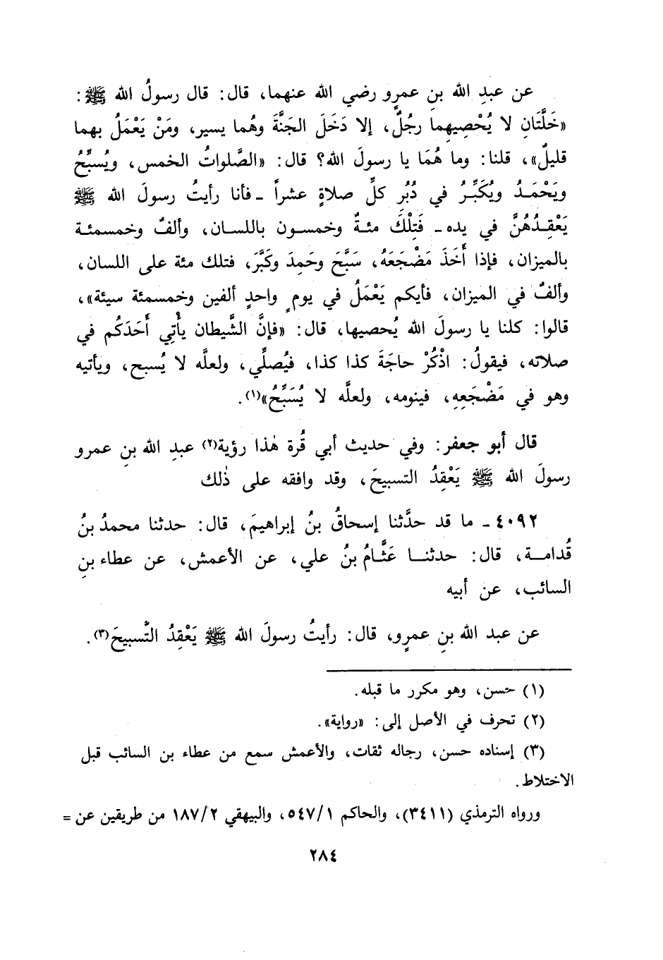 4092 - مَا قَدْ حَدَّثَنَا إِسْحَاقُ بْنُ إِبْرَاهِيمَ، قَالَ: حَدَّثَنَا مُحَمَّدُ بْنُ قُدَامَةَ، قَالَ: حَدَّثَنَا عَثَّامُ بْنُ عَلِيٍّ، عَنِ الْأَعْمَشِ، عَنْ عَطَاءِ بْنِ السَّائِبِ، عَنْ أَبِيهِ، عَنْ عَبْدِ اللهِ بْنِ عَمْرٍو، قَالَ: " رَأَيْتُ رَسُولَ اللهِ صَلَّى اللَّهُ عَلَيْهِ وَسَلَّمَ يَعْقِدُ التَّسْبِيحَ " -[285]-