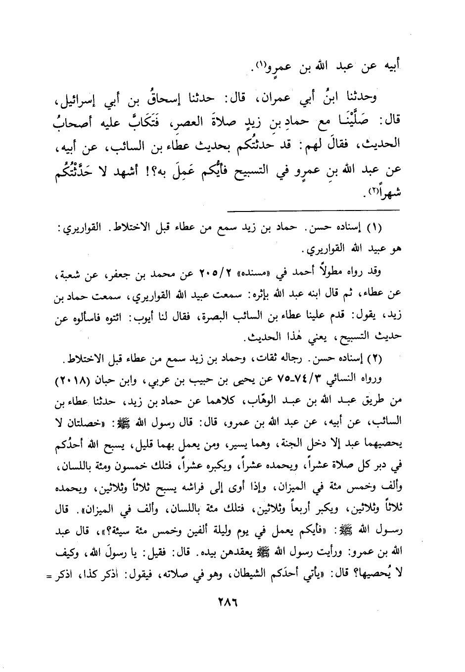 وَحَدَّثَنَا ابْنُ أَبِي عِمْرَانَ، قَالَ: حَدَّثَنَا إِسْحَاقُ بْنُ أَبِي إِسْرَائِيلَ، قَالَ: صَلَّيْنَا مَعَ حَمَّادِ بْنِ زَيْدٍ صَلَاةَ الْعَصْرِ، فَتَكَابَّ عَلَيْهِ أَصْحَابُ الْحَدِيثِ، فَقَالَ لَهُمْ: " قَدْ حَدَّثْتُكُمْ بِحَدِيثِ عَطَاءِ بْنِ السَّائِبِ، عَنْ أَبِيهِ، عَنْ عَبْدِ اللهِ بْنِ عَمْرٍو فِي التَّسْبِيحِ، فَأَيُّكُمْ عَمِلَ بِهِ؟ أَشْهَدُ لَا حَدَّثْتُكُمْ شَهْرًا "