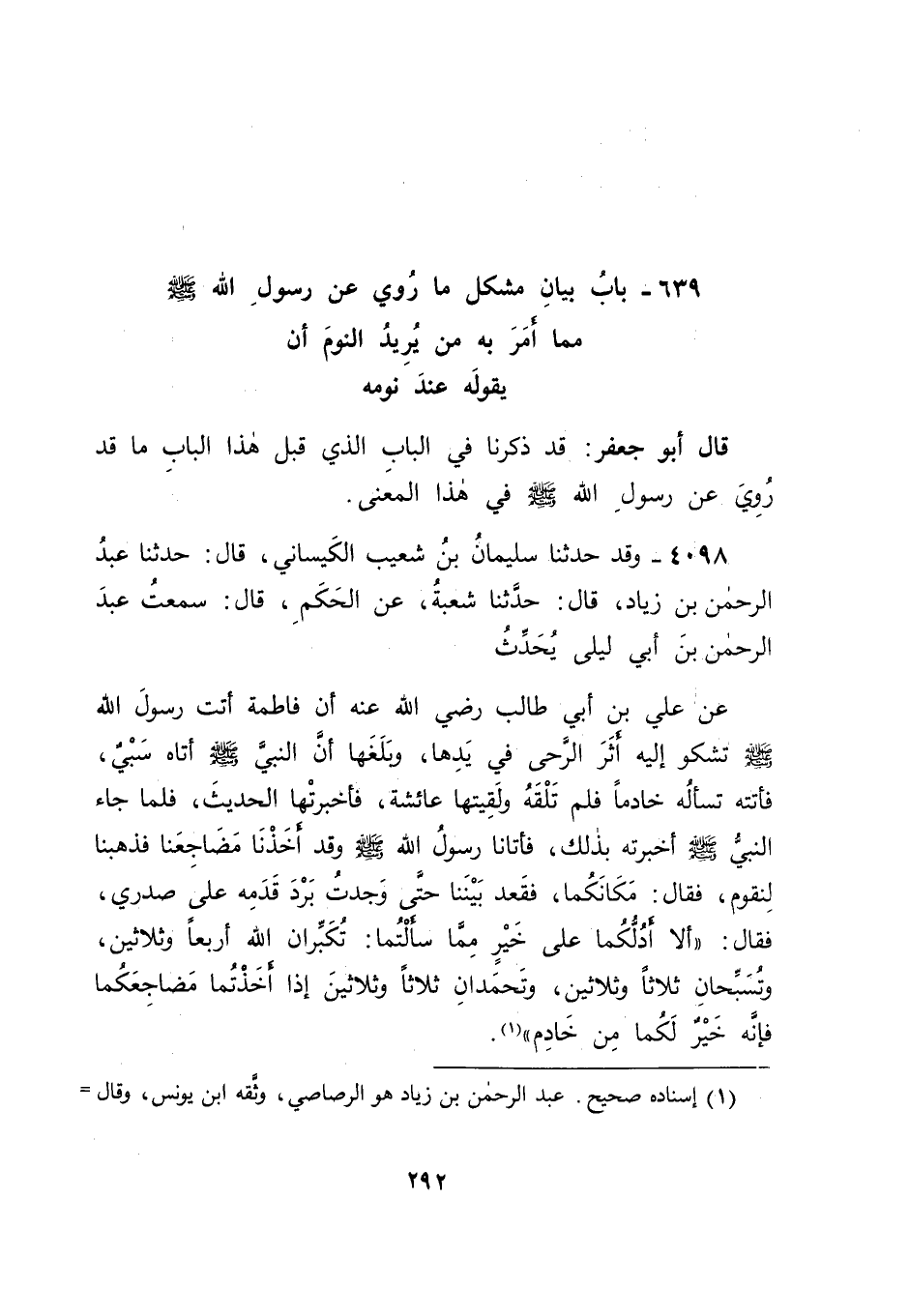 4098 - وَقَدْ حَدَّثَنَا سُلَيْمَانُ بْنُ شُعَيْبٍ الْكَيْسَانِيُّ، قَالَ: حَدَّثَنَا عَبْدُ الرَّحْمَنِ بْنُ زِيَادٍ، قَالَ: حَدَّثَنَا شُعْبَةُ، عَنِ الْحَكَمِ، قَالَ: سَمِعْتُ عَبْدَ الرَّحْمَنِ بْنَ أَبِي لَيْلَى، يُحَدِّثُ عَنْ عَلِيِّ بْنِ أَبِي طَالِبٍ رَضِيَ اللهُ عَنْهُ أَنَّ فَاطِمَةَ أَتَتْ رَسُولَ اللهِ صَلَّى اللَّهُ عَلَيْهِ وَسَلَّمَ تَشْكُو إِلَيْهِ أَثَرَ الرَّحَى فِي يَدِهَا، وَبَلَغَهَا أَنَّ النَّبِيَّ صَلَّى اللَّهُ عَلَيْهِ وَسَلَّمَ أَتَاهُ سَبْيٌ، فَأَتَتْهُ تَسْأَلُهُ خَادِمًا فَلَمْ تَلْقَهُ وَلَقِيَتْهَا عَائِشَةُ، فَأَخْبَرَتْهَا الْحَدِيثَ، فَلَمَّا جَاءَ النَّبِيُّ صَلَّى اللَّهُ عَلَيْهِ وَسَلَّمَ أَخْبَرَتْهُ بِذَلِكَ، فَأَتَانَا رَسُولُ اللهِ صَلَّى اللَّهُ عَلَيْهِ وَسَلَّمَ وَقَدْ أَخَذْنَا مَضَاجِعَنَا فَذَهَبْنَا لِنَقُومَ، فَقَالَ: " مَكَانَكُمَا " فَقَعَدَ بَيْنَنَا حَتَّى وَجَدْتُ بَرْدَ قَدَمِهِ عَلَى صَدْرِي، فَقَالَ: " أَلَا أَدُلُّكُمَا عَلَى خَيْرٍ مِمَّا سَأَلْتُمَا: تُكَبِّرَانِ اللهَ أَرْبَعًا وَثَلَاثِينَ، وَتُسَبِّحَانِ ثَلَاثًا وَثَلَاثِينَ، وَتَحْمَدَانِ ثَلَاثًا وَثَلَاثِينَ إِذَا أَخَذْتُمَا مَضَاجِعَكُمَا فَإِنَّهُ خَيْرٌ لَكُمَا مِنْ خَادِمٍ " -[293]-