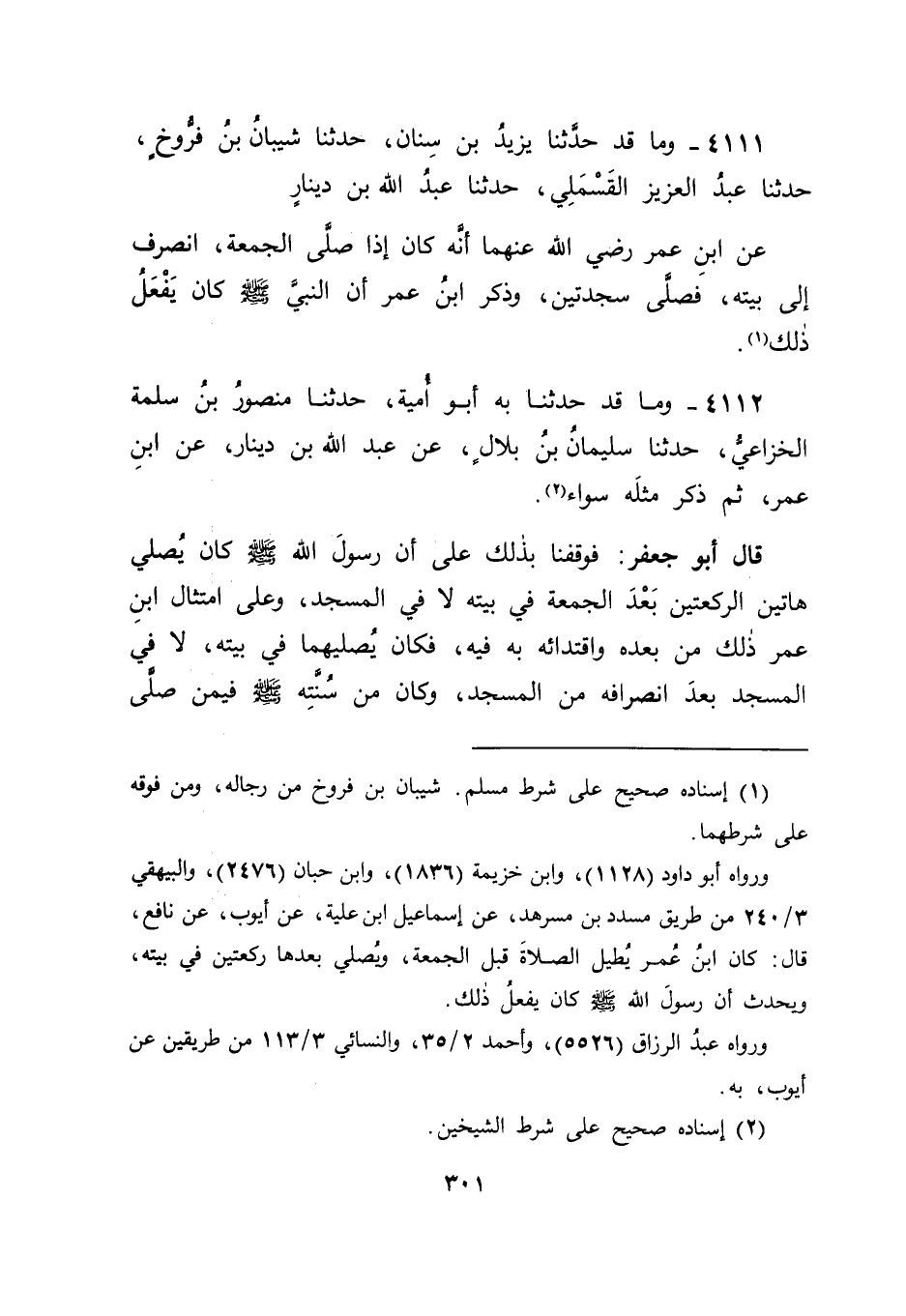 4111 - وَمَا قَدْ حَدَّثَنَا يَزِيدُ بْنُ سِنَانٍ، حَدَّثَنَا شَيْبَانُ بْنُ فَرُّوخٍ، حَدَّثَنَا عَبْدُ الْعَزِيزِ الْقَسْمَلِيُّ، حَدَّثَنَا عَبْدُ اللهِ بْنُ دِينَارٍ، عَنِ ابْنِ عُمَرَ رَضِيَ اللهُ عَنْهُمَا أَنَّهُ كَانَ إِذَا صَلَّى الْجُمُعَةَ انْصَرَفَ إِلَى بَيْتِهِ فَصَلَّى سَجْدَتَيْنِ، وَذَكَرَ ابْنُ عُمَرَ أَنَّ النَّبِيَّ صَلَّى اللَّهُ عَلَيْهِ وَسَلَّمَ كَانَ يَفْعَلُ ذَلِكَ
