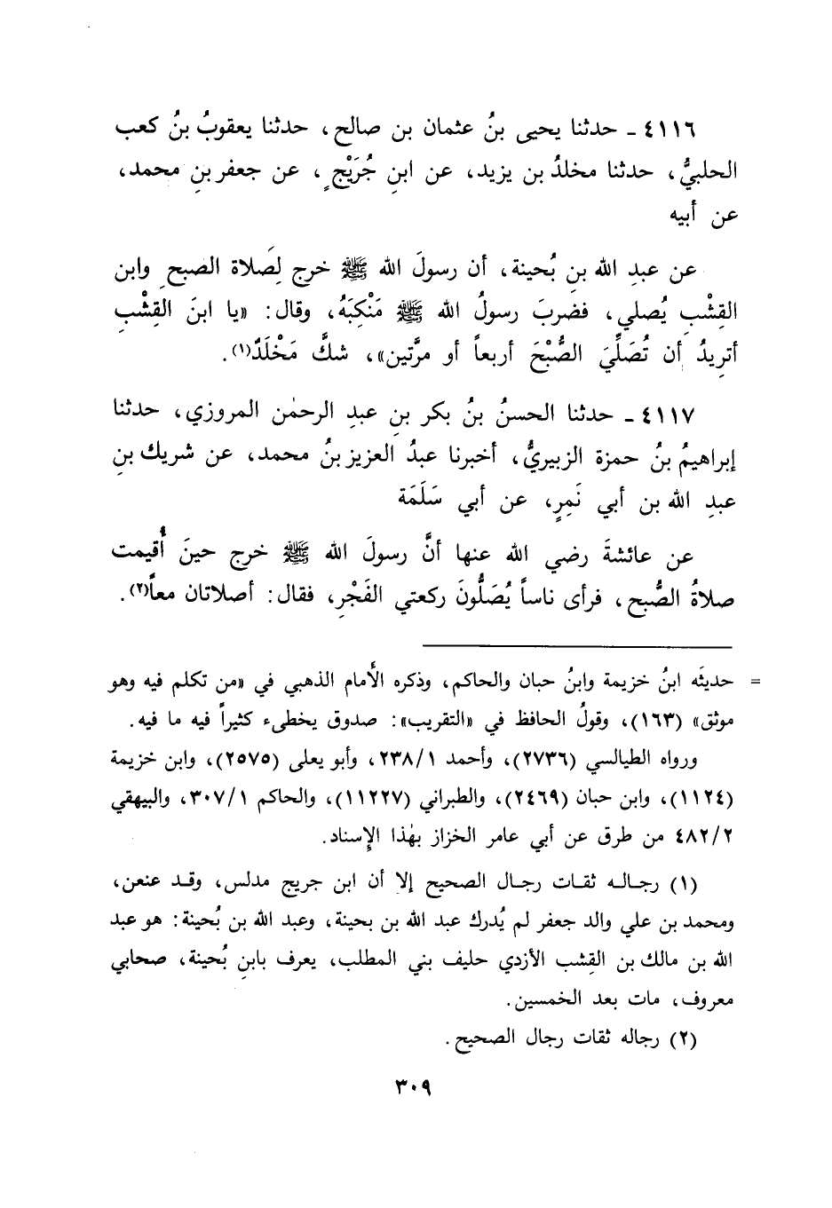 4116 - حَدَّثَنَا يَحْيَى بْنُ عُثْمَانَ بْنِ صَالِحٍ، حَدَّثَنَا يَعْقُوبُ بْنُ كَعْبٍ الْحَلَبِيُّ، حَدَّثَنَا مَخْلَدُ بْنُ يَزِيدَ، عَنِ ابْنِ جُرَيْجٍ، عَنْ جَعْفَرِ بْنِ مُحَمَّدٍ، عَنْ أَبِيهِ، عَنْ عَبْدِ اللهِ بْنِ بُحَيْنَةَ، أَنَّ رَسُولَ اللهِ صَلَّى اللَّهُ عَلَيْهِ وَسَلَّمَ خَرَجَ لِصَلَاةِ الصُّبْحِ وَابْنُ الْقِشْبِ يُصَلِّي، فَضَرَبَ رَسُولُ اللهِ صَلَّى اللَّهُ عَلَيْهِ وَسَلَّمَ مَنْكِبَهُ، وَقَالَ: " يَا ابْنَ الْقِشْبِ، أَتُرِيدُ أَنْ تُصَلِّيَ الصُّبْحَ أَرْبَعًا، أَوْ مَرَّتَيْنِ " شَكَّ مَخْلَدٌ
