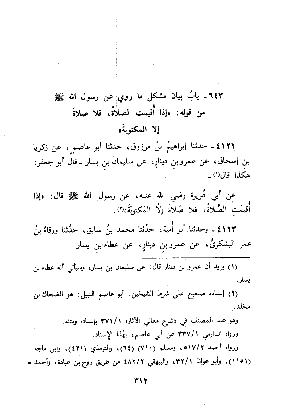4122 - حَدَّثَنَا إِبْرَاهِيمُ بْنُ مَرْزُوقٍ، حَدَّثَنَا أَبُو عَاصِمٍ، عَنْ زَكَرِيَّا بْنِ إِسْحَاقَ، عَنْ عَمْرِو بْنِ دِينَارٍ، عَنْ سُلَيْمَانَ بْنِ يَسَارٍ، قَالَ أَبُو جَعْفَرٍ: هَكَذَا قَالَ: عَنْ أَبِي هُرَيْرَةَ رَضِيَ اللهُ عَنْهُ، عَنْ رَسُولِ اللهِ صَلَّى اللَّهُ عَلَيْهِ وَسَلَّمَ قَالَ: " إِذَا أُقِيمَتِ الصَّلَاةُ، فَلَا صَلَاةَ إِلَّا الْمَكْتُوبَةَ "