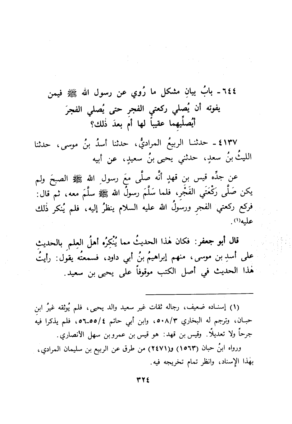 4137 - حَدَّثَنَا الرَّبِيعُ الْمُرَادِيُّ، حَدَّثَنَا أَسَدُ بْنُ مُوسَى، حَدَّثَنَا اللَّيْثُ بْنُ سَعْدٍ، حَدَّثَنِي يَحْيَى بْنُ سَعِيدٍ، عَنْ أَبِيهِ، عَنْ جَدِّهِ قَيْسِ بْنِ قَهْدٍ: " أَنَّهُ صَلَّى مَعَ رَسُولِ اللهِ صَلَّى اللَّهُ عَلَيْهِ وَسَلَّمَ الصُّبْحَ وَلَمْ يَكُنْ صَلَّى رَكْعَتَيِ الْفَجْرِ، فَلَمَّا سَلَّمَ رَسُولُ اللهِ صَلَّى اللَّهُ عَلَيْهِ وَسَلَّمَ سَلَّمَ مَعَهُ، ثُمَّ قَالَ: فَرَكَعَ رَكْعَتَيِ الْفَجْرِ وَرَسُولُ اللهِ عَلَيْهِ السَّلَامُ يَنْظُرُ إِلَيْهِ، فَلَمْ يُنْكِرْ ذَلِكَ عَلَيْهِ " قَالَ أَبُو جَعْفَرٍ: فَكَانَ هَذَا الْحَدِيثُ مِمَّا يُنْكِرُهُ أَهْلُ الْعِلْمِ بِالْحَدِيثِ عَلَى أَسَدِ بْنِ مُوسَى، مِنْهُمْ إِبْرَاهِيمُ بْنُ أَبِي دَاوُدَ، فَسَمِعْتُهُ يَقُولُ: رَأَيْتُ هَذَا الْحَدِيثَ فِي أَصْلِ الْكُتُبِ مَوْقُوفًا عَلَى يَحْيَى بْنِ سَعِيدٍ -[325]- وَمِمَّا يُنْكِرُهُ أَهْلُ الْأَنْسَابِ أَيْضًا، وَيَزْعُمُونَ أَنَّ يَحْيَى بْنَ سَعِيدٍ أَيْضًا لَيْسَ قَيْسٌ جَدُّهُ قَيْسَ بْنَ قَهْدٍ، وَإِنَّمَا هُوَ قَيْسُ بْنُ عَمْرِو بْنِ سَهْلٍ، مِنْهُمْ مُحَمَّدُ بْنُ عِيسَى بْنِ فُلَيْحٍ سَمِعْتُهُ يَقُولُ: وَكَانَ مَوْضِعُهُ مِنْ هَذِهِ الْأَشْيَاءِ أَجَلَّ مَوْضِعٍ: يَحْيَى بْنُ سَعِيدٍ إِنَّمَا جَدُّهُ قَيْسُ بْنُ عَمْرِو بْنِ سَهْلٍ لَيْسَ قَيْسَ بْنَ قَهْدٍ، وَقَدْ ذَكَرَ ذَلِكَ مُحَمَّدُ بْنُ إِسْحَاقَ فِي أَنْسَابِ الْأَنْصَارِ