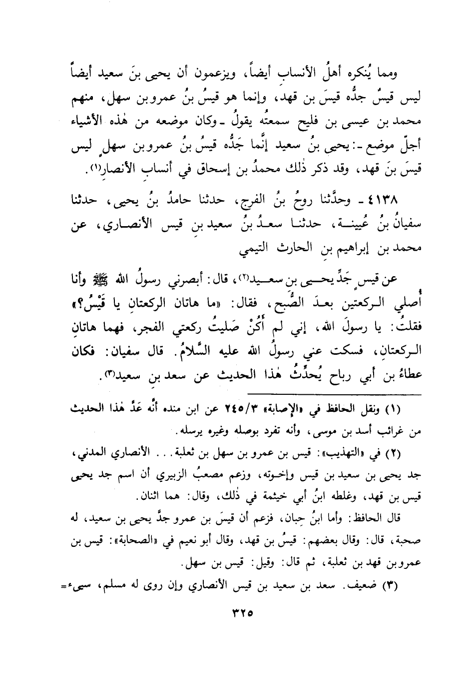 4138 - وَحَدَّثَنَا رَوْحُ بْنُ الْفَرَجِ، حَدَّثَنَا حَامِدُ بْنُ يَحْيَى، حَدَّثَنَا سُفْيَانُ بْنُ عُيَيْنَةَ، حَدَّثَنَا سَعْدُ بْنُ سَعِيدِ بْنِ قَيْسٍ الْأَنْصَارِيُّ، عَنْ مُحَمَّدِ بْنِ إِبْرَاهِيمَ بْنِ الْحَارِثِ التَّيْمِيِّ، عَنْ قَيْسٍ جَدِّ يَحْيَى بْنِ سَعِيدٍ، قَالَ: " أَبْصَرَنِي رَسُولُ اللهِ صَلَّى اللَّهُ عَلَيْهِ وَسَلَّمَ وَأَنَا أُصَلِّي الرَّكْعَتَيْنِ بَعْدَ الصُّبْحِ، فَقَالَ: " مَا هَاتَانِ الرَّكْعَتَانِ يَا قَيْسُ؟ " فَقُلْتُ: يَا رَسُولَ اللهِ، إِنِّي لَمْ أَكُنْ صَلَّيْتُ رَكْعَتَيِ الْفَجْرِ، فَهُمَا هَاتَانِ الرَّكْعَتَانِ، فَسَكَتَ عَنِّي رَسُولُ اللهِ عَلَيْهِ السَّلَامُ قَالَ سُفْيَانُ: فَكَانَ عَطَاءُ بْنُ أَبِي رَبَاحٍ يُحَدِّثُ هَذَا الْحَدِيثَ عَنْ سَعْدِ بْنِ سَعِيدٍ -[326]-