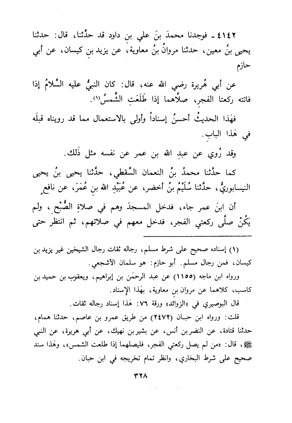 4142 - فَوَجَدْنَا مُحَمَّدَ بْنَ عَلِيِّ بْنِ دَاوُدَ قَدْ حَدَّثَنَا، قَالَ: حَدَّثَنَا يَحْيَى بْنُ مَعِينٍ، حَدَّثَنَا مَرْوَانُ بْنُ مُعَاوِيَةَ، عَنْ يَزِيدَ بْنِ كَيْسَانَ، عَنْ أَبِي حَازِمٍ، عَنْ أَبِي هُرَيْرَةَ رَضِيَ اللهُ عَنْهُ، قَالَ: " كَانَ النَّبِيُّ عَلَيْهِ السَّلَامُ إِذَا فَاتَتْهُ رَكْعَتَا الْفَجْرِ، صَلَّاهُمَا إِذَا طَلَعَتِ الشَّمْسُ " فَهَذَا الْحَدِيثُ أَحْسَنُ إِسْنَادًا وَأَوْلَى بِالِاسْتِعْمَالِ مِمَّا قَدْ رَوَيْنَاهُ قَبْلَهُ فِي هَذَا الْبَابِ وَقَدْ رُوِيَ عَنْ عَبْدِ اللهِ بْنِ عُمَرَ عَنْ نَفْسِهِ مِثْلُ ذَلِكَ