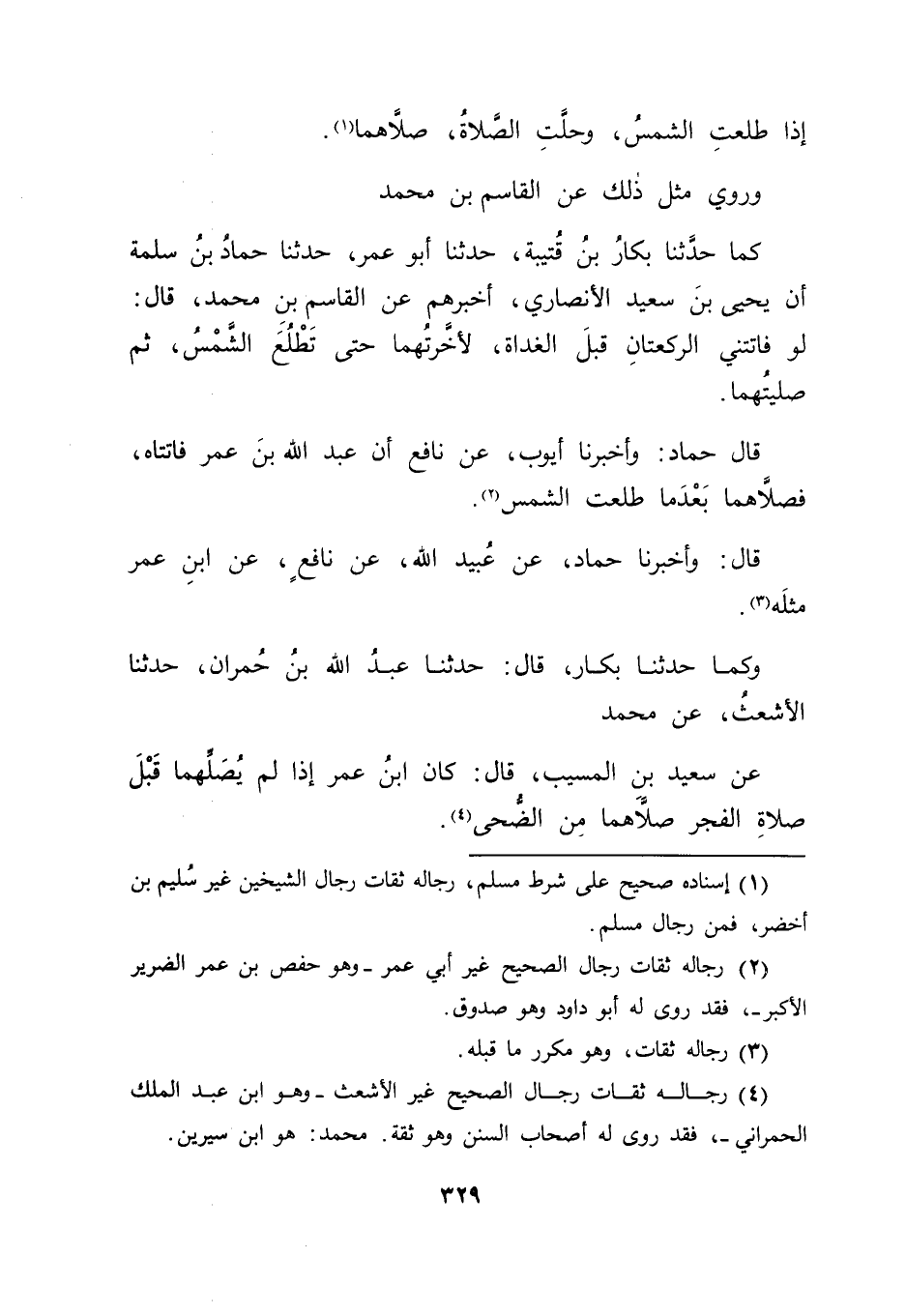 كَمَا حَدَّثَنَا بَكَّارُ بْنُ قُتَيْبَةَ، حَدَّثَنَا أَبُو عُمَرَ، حَدَّثَنَا حَمَّادُ بْنُ سَلَمَةَ أَنَّ يَحْيَى بْنَ سَعِيدٍ الْأَنْصَارِيَّ أَخْبَرَهُمْ، عَنِ الْقَاسِمِ بْنِ مُحَمَّدٍ، قَالَ: " لَوْ فَاتَتْنِي الرَّكْعَتَانِ قَبْلَ الْغَدَاةِ، لَأَخَّرْتُهُمَا حَتَّى تَطْلُعَ الشَّمْسُ، ثُمَّ صَلَّيْتُهُمَا "