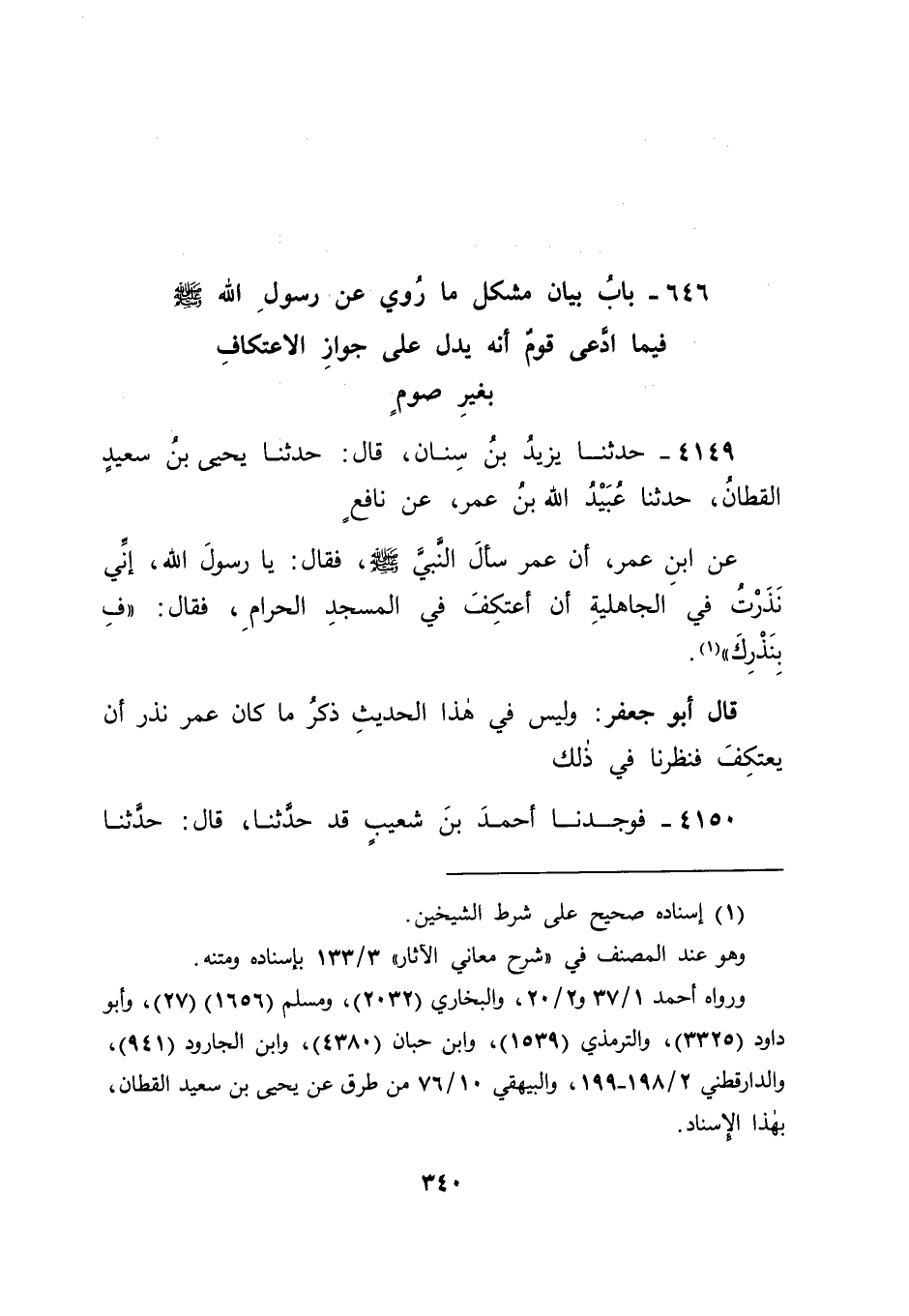4150 - فَوَجَدْنَا أَحْمَدَ بْنَ شُعَيْبٍ قَدْ حَدَّثَنَا، قَالَ: حَدَّثَنَا -[341]- يَعْقُوبُ بْنُ إِبْرَاهِيمَ الدَّوْرَقِيُّ، حَدَّثَنَا يَحْيَى بْنُ سَعِيدٍ، ثُمَّ ذَكَرَ بِإِسْنَادِهِ مِثْلَهُ إِلَّا أَنَّهُ قَالَ: نَذَرْتُ أَنْ أَعْتَكِفَ لَيْلَةً