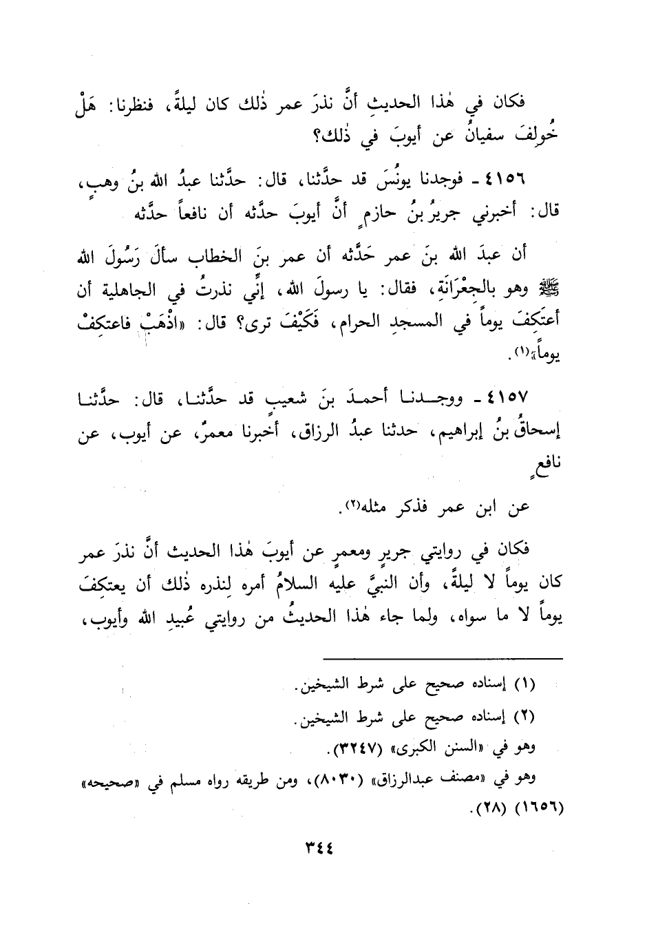 4156 - فَوَجَدْنَا يُونُسَ قَدْ حَدَّثَنَا، قَالَ: حَدَّثَنَا عَبْدُ اللهِ بْنُ وَهْبٍ، قَالَ: أَخْبَرَنِي جَرِيرُ بْنُ حَازِمٍ، أَنَّ أَيُّوبَ، حَدَّثَهُ أَنَّ نَافِعًا حَدَّثَهُ أَنَّ عَبْدَ اللهِ بْنَ عُمَرَ حَدَّثَهُ أَنَّ عُمَرَ بْنَ الْخَطَّابِ سَأَلَ رَسُولَ اللهِ صَلَّى اللَّهُ عَلَيْهِ وَسَلَّمَ وَهُوَ بِالْجِعْرَانَةِ، فَقَالَ: يَا رَسُولَ اللهِ، إِنِّي نَذَرْتُ فِي الْجَاهِلِيَّةِ أَنْ أَعْتَكِفَ يَوْمًا فِي الْمَسْجِدِ الْحَرَامِ، فَكَيْفَ تَرَى؟ قَالَ: " اذْهَبْ فَاعْتَكِفْ يَوْمًا "
