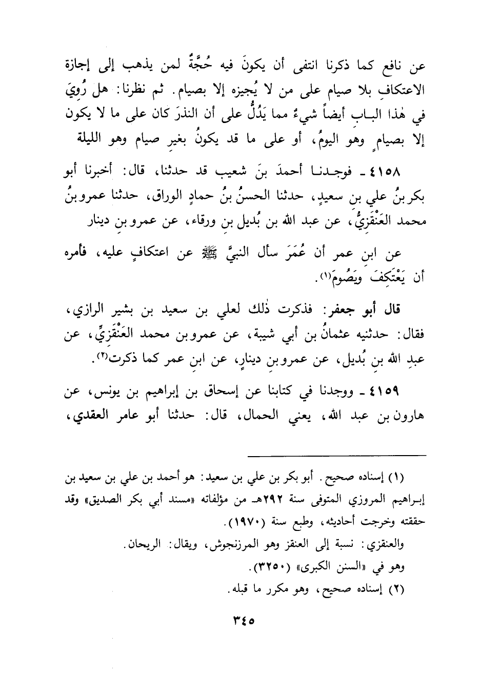 4158 - فَوَجَدْنَا أَحْمَدَ بْنَ شُعَيْبٍ قَدْ حَدَّثَنَا، قَالَ: أَخْبَرَنَا أَبُو بَكْرِ بْنُ عَلِيِّ بْنِ سَعِيدٍ، حَدَّثَنَا الْحَسَنُ بْنُ حَمَّادٍ الْوَرَّاقُ، حَدَّثَنَا عَمْرُو بْنُ مُحَمَّدٍ الْعَنْقَزِيُّ، عَنْ عَبْدِ اللهِ بْنِ بُدَيْلِ بْنِ وَرْقَاءَ، عَنْ عَمْرِو بْنِ دِينَارٍ، عَنِ ابْنِ عُمَرَ، أَنَّ عُمَرَ سَأَلَ النَّبِيَّ صَلَّى اللَّهُ عَلَيْهِ وَسَلَّمَ عَنِ اعْتِكَافٍ عَلَيْهِ، فَأَمَرَهُ أَنْ يَعْتَكِفَ وَيَصُومَ " قَالَ أَبُو جَعْفَرٍ: فَذَكَرْتُ ذَلِكَ لِعَلِيِّ بْنِ سَعِيدِ بْنِ بَشِيرٍ الرَّازِيِّ، فَقَالَ: حَدَّثَنِيهِ عُثْمَانُ بْنُ أَبِي شَيْبَةَ، عَنْ عَمْرِو بْنِ مُحَمَّدٍ الْعَنْقَزِيِّ، عَنْ عَبْدِ اللهِ بْنِ بُدَيْلٍ، عَنْ عَمْرِو بْنِ دِينَارٍ، عَنِ ابْنِ عُمَرَ كَمَا ذَكَرْتَ