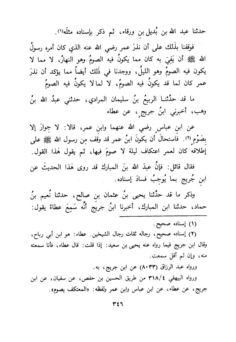 وَذَكَرَ مَا قَدْ حَدَّثَنَا يَحْيَى بْنُ عُثْمَانَ بْنِ صَالِحٍ، حَدَّثَنَا نُعَيْمُ بْنُ حَمَّادٍ، حَدَّثَنَا ابْنُ الْمُبَارَكِ، أَخْبَرَنَا ابْنُ جُرَيْجٍ أَنَّهُ سَمِعَ عَطَاءً يَقُولُ: -[347]- أَخْبَرَنَا ابْنُ جُرَيْجٍ، أَنَّهُ سَمِعَ عَطَاءً يَقُولُ: أَخْبَرَنَا بَعْضُ أَصْحَابِنَا، عَنِ ابْنِ عُمَرَ وَابْنِ عَبَّاسٍ أَنَّهُمَا كَانَا يَقُولَانِ: " لَا جِوَارَ إِلَّا بِصِيَامٍ "، قُلْتُ: أَثَبَتَ عَنْهُمَا؟ قَالَ: نَعَمْ " فَكَانَ جَوَابَنَا لَهُ فِي ذَلِكَ: أَنَّهُ لَيْسَ فِي مَا ذُكِرَ مَا يَجِبُ بِهِ فَسَادُ إِسْنَادِ هَذَا الْحَدِيثِ؛ لِأَنَّ فِيهِ إِخْبَارَ عَطَاءٍ أَنَّ الَّذِيَ حَدَّثَهُ بِهِ مِنْ أَصْحَابِهِ عَنِ ابْنِ عُمَرَ، وَابْنِ عَبَّاسٍ ثَبْتٌ، وَذَلِكَ مِمَّا يُغْنِي عَنْ تَسْمِيَتِهِ إِيَّاهُ ثُمَّ نَظَرْنَا فِيمَنْ رُوِيَ عَنْهُ مِنْ هَذَا شَيْءٌ مِنْ أَصْحَابِ رَسُولِ اللهِ صَلَّى اللَّهُ عَلَيْهِ وَسَلَّمَ