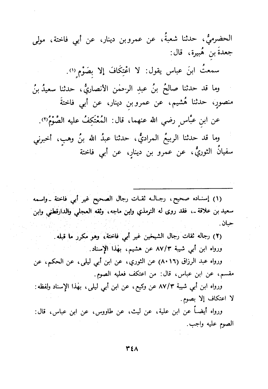 وَمَا قَدْ حَدَّثَنَا صَالِحُ بْنُ عَبْدِ الرَّحْمَنِ الْأَنْصَارِيُّ، حَدَّثَنَا سَعِيدُ بْنُ مَنْصُورٍ، حَدَّثَنَا هُشَيْمٌ، عَنْ عَمْرِو بْنِ دِينَارٍ، عَنْ أَبِي فَاخِتَةَ، عَنِ ابْنِ عَبَّاسٍ رَضِيَ اللهُ عَنْهُمَا، قَالَ: " الْمُعْتَكِفُ عَلَيْهِ الصَّوْمُ "