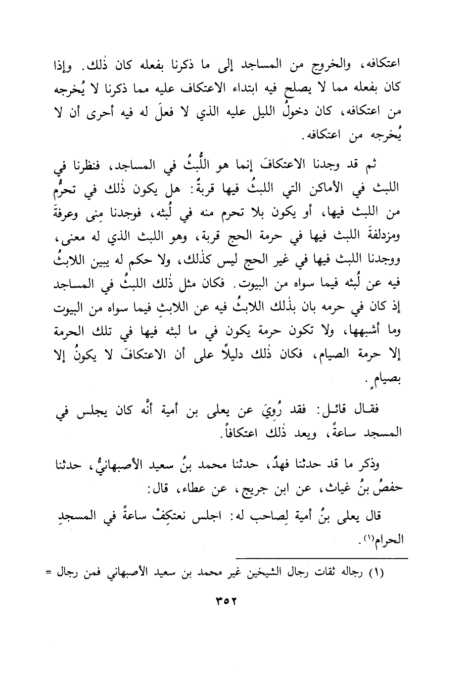 وَذَكَرَ مَا قَدْ حَدَّثَنَا فَهْدٌ، حَدَّثَنَا مُحَمَّدُ بْنُ سَعِيدٍ الْأَصْبَهَانِيُّ، حَدَّثَنَا حَفْصُ بْنُ غِيَاثٍ، عَنِ ابْنِ جُرَيْجٍ، عَنْ عَطَاءٍ، قَالَ: قَالَ يَعْلَى بْنُ أُمَيَّةَ لِصَاحِبٍ لَهُ: " اجْلِسْ نَعْتَكِفْ سَاعَةً فِي الْمَسْجِدِ الْحَرَامِ "
