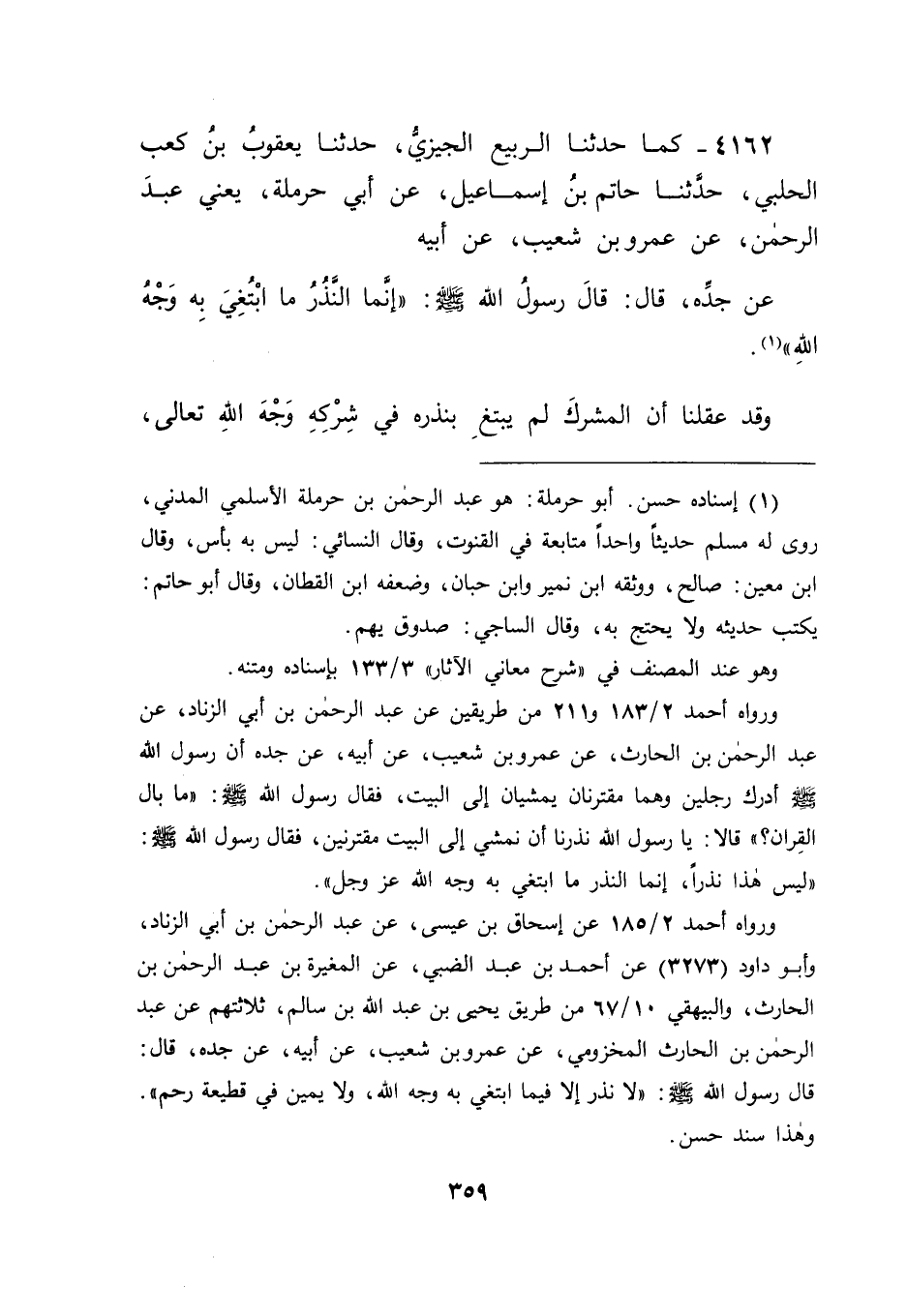 4162 - كَمَا حَدَّثَنَا الرَّبِيعُ الْجِيزِيُّ، حَدَّثَنَا يَعْقُوبُ بْنُ كَعْبٍ الْحَلَبِيُّ، حَدَّثَنَا حَاتِمُ بْنُ إِسْمَاعِيلَ، عَنْ أَبِي حَرْمَلَةَ يَعْنِي عَبْدَ الرَّحْمَنِ، عَنْ عَمْرِو بْنِ شُعَيْبٍ، عَنْ أَبِيهِ، عَنْ جَدِّهِ، قَالَ: قَالَ رَسُولُ اللهِ صَلَّى اللَّهُ عَلَيْهِ وَسَلَّمَ: " إِنَّمَا النَّذْرُ مَا ابْتُغِيَ بِهِ وَجْهُ اللهِ " وَقَدْ عَقَلْنَا أَنَّ الْمُشْرِكَ لَمْ يَبْتَغِ بِنَذْرِهِ فِي شِرْكِهِ وَجْهَ اللهِ تَعَالَى، -[360]- فَدَلَّ ذَلِكَ أَنَّهُ لَا مَعْنَى لِنَذْرِهِ وَقَدْ شَدَّ ذَلِكَ أَيْضًا مَا رُوِيَ عَنْ رَسُولِ اللهِ صَلَّى اللَّهُ عَلَيْهِ وَسَلَّمَ