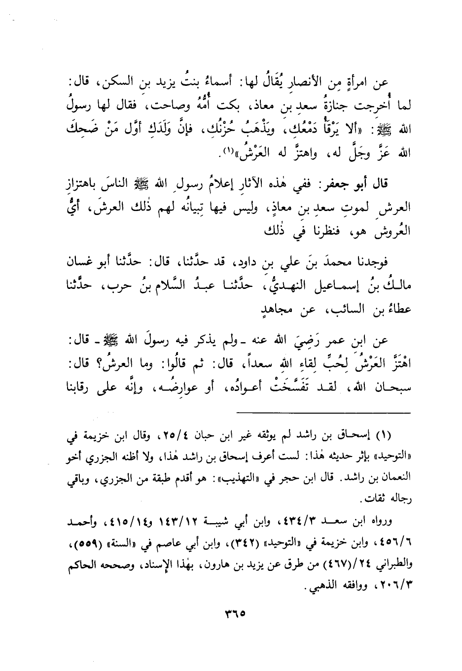 فَوَجَدْنَا مُحَمَّدَ بْنَ عَلِيِّ بْنِ دَاوُدَ، قَدْ حَدَّثَنَا، قَالَ: حَدَّثَنَا أَبُو غَسَّانَ مَالِكُ بْنُ إِسْمَاعِيلَ النَّهْدِيُّ، حَدَّثَنَا عَبْدُ السَّلَامِ بْنُ حَرْبٍ، حَدَّثَنَا عَطَاءُ بْنُ السَّائِبِ، عَنْ مُجَاهِدٍ، عَنِ ابْنِ عُمَرَ رَضِيَ اللهُ عَنْهُ وَلَمْ يَذْكُرْ فِيهِ رَسُولَ اللهِ صَلَّى اللَّهُ عَلَيْهِ وَسَلَّمَ قَالَ: " اهْتَزَّ الْعَرْشُ لِحُبِّ لِقَاءِ اللهِ سَعْدًا " قَالَ: ثُمَّ قَالُوا: وَمَا الْعَرْشُ؟ قَالَ: سُبْحَانَ اللهِ، لَقَدْ تَفَسَّخَتْ أَعْوَادُهُ، أَوْ عَوَارِضُهُ، وَإِنَّهُ عَلَى رِقَابِنَا -[366]- وَأَكْتَافِنَا، وَكَانَ آخِرُ مَنْ خَرَجَ مِنْ قَبْرِهِ النَّبِيُّ صَلَّى اللَّهُ عَلَيْهِ وَسَلَّمَ، قَالَ: " إِنَّ سَعْدًا ضُغِطَ فِي قَبْرِهِ ضَغْطَةً، فَسَأَلْتُ اللهَ تَعَالَى أَنْ يُخَفِّفَ عَنْهُ " وَقَرَأَ: {وَرَفَعَ أَبَوَيْهِ عَلَى الْعَرْشِ} [يوسف: 100] قَالَ: السَّرِيرُ "