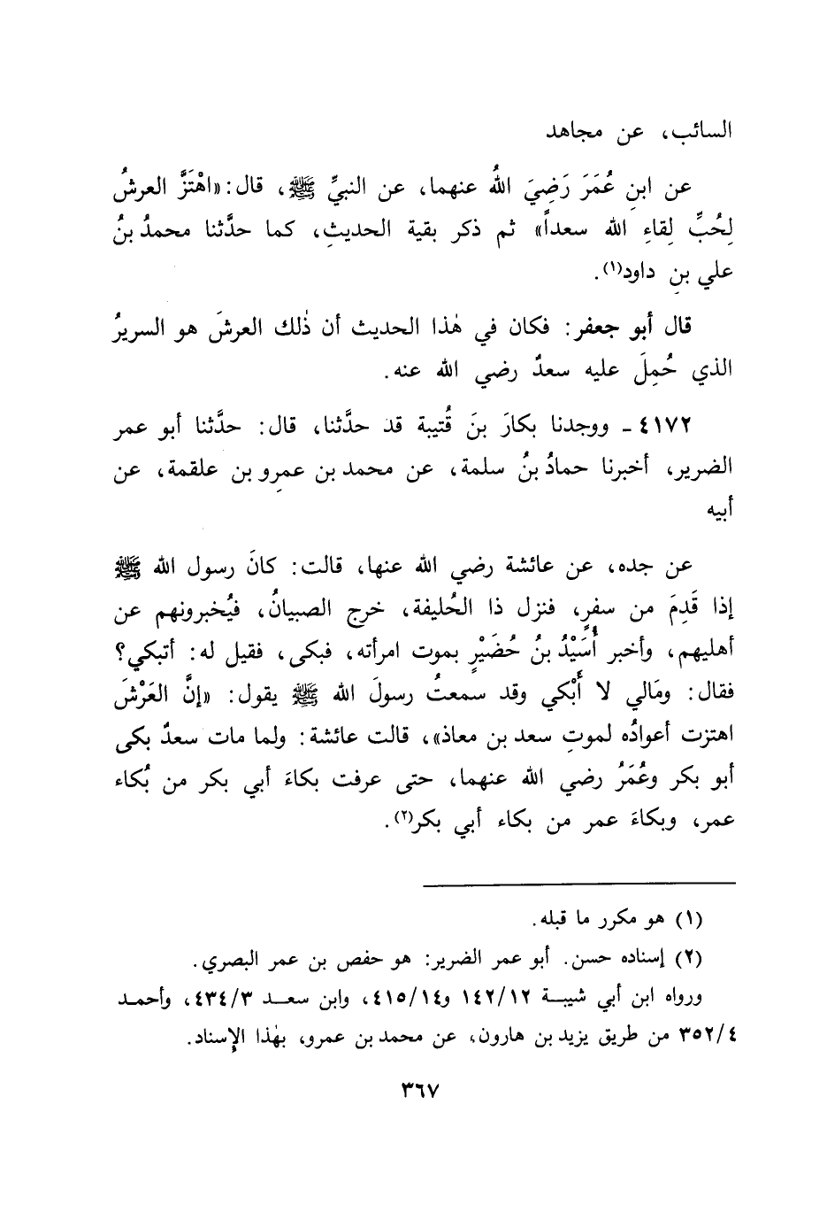 4172 - وَوَجَدْنَا بَكَّارَ بْنَ قُتَيْبَةَ قَدْ حَدَّثَنَا، قَالَ: حَدَّثَنَا أَبُو عُمَرَ الضَّرِيرُ، أَخْبَرَنَا حَمَّادُ بْنُ سَلَمَةَ، عَنْ مُحَمَّدِ بْنِ عَمْرِو بْنِ عَلْقَمَةَ، عَنْ أَبِيهِ، عَنْ جَدِّهِ، عَنْ عَائِشَةَ رَضِيَ اللهُ عَنْهَا، قَالَتْ: كَانَ رَسُولُ اللهِ صَلَّى اللَّهُ عَلَيْهِ وَسَلَّمَ إِذَا قَدِمَ مِنْ سَفَرٍ، فَنَزَلَ ذَا الْحُلَيْفَةِ، خَرَجَ الصِّبْيَانُ، فَيُخْبِرُونَهُمْ عَنْ أَهْلِيهِمْ، وَأُخْبِرَ أُسَيْدُ بْنُ حُضَيْرٍ بِمَوْتِ امْرَأَتِهِ، فَبَكَى، فَقِيلَ لَهُ: أَتَبْكِي؟ فَقَالَ: وَمَا لِي لَا أَبْكِي وَقَدْ سَمِعْتُ رَسُولَ اللهِ صَلَّى اللَّهُ عَلَيْهِ وَسَلَّمَ يَقُولُ: " إِنَّ الْعَرْشَ اهْتَزَّتْ أَعْوَادُهُ لِمَوْتِ سَعْدِ بْنِ مُعَاذٍ " قَالَتْ عَائِشَةُ: وَلَمَّا مَاتَ سَعْدٌ بَكَى أَبُو بَكْرٍ وَعُمَرُ رَضِيَ اللهُ عَنْهُمَا، حَتَّى عَرَفْتُ بُكَاءَ أَبِي بَكْرٍ مِنْ بُكَاءِ عُمَرَ، وَبُكَاءَ عُمَرَ مِنْ بُكَاءِ أَبِي بَكْرٍ " -[368]- قَالَ أَبُو جَعْفَرٍ: فَكَانَ فِي هَذَيْنِ الْحَدِيثَيْنِ أَنَّ الْعَرْشَ الْمُرَادَ فِي الْأَحَادِيثِ الْأُوَلِ هُوَ السَّرِيرُ الَّذِي حُمِلَ عَلَيْهِ سَعْدُ بْنُ مُعَاذٍ، فَنَظَرْنَا فِي ذَلِكَ، وَهَلْ خُولِفَ مَنْ قَالَ ذَلِكَ فِيمَا قَالَهُ مِنْهُ أَمْ لَا؟