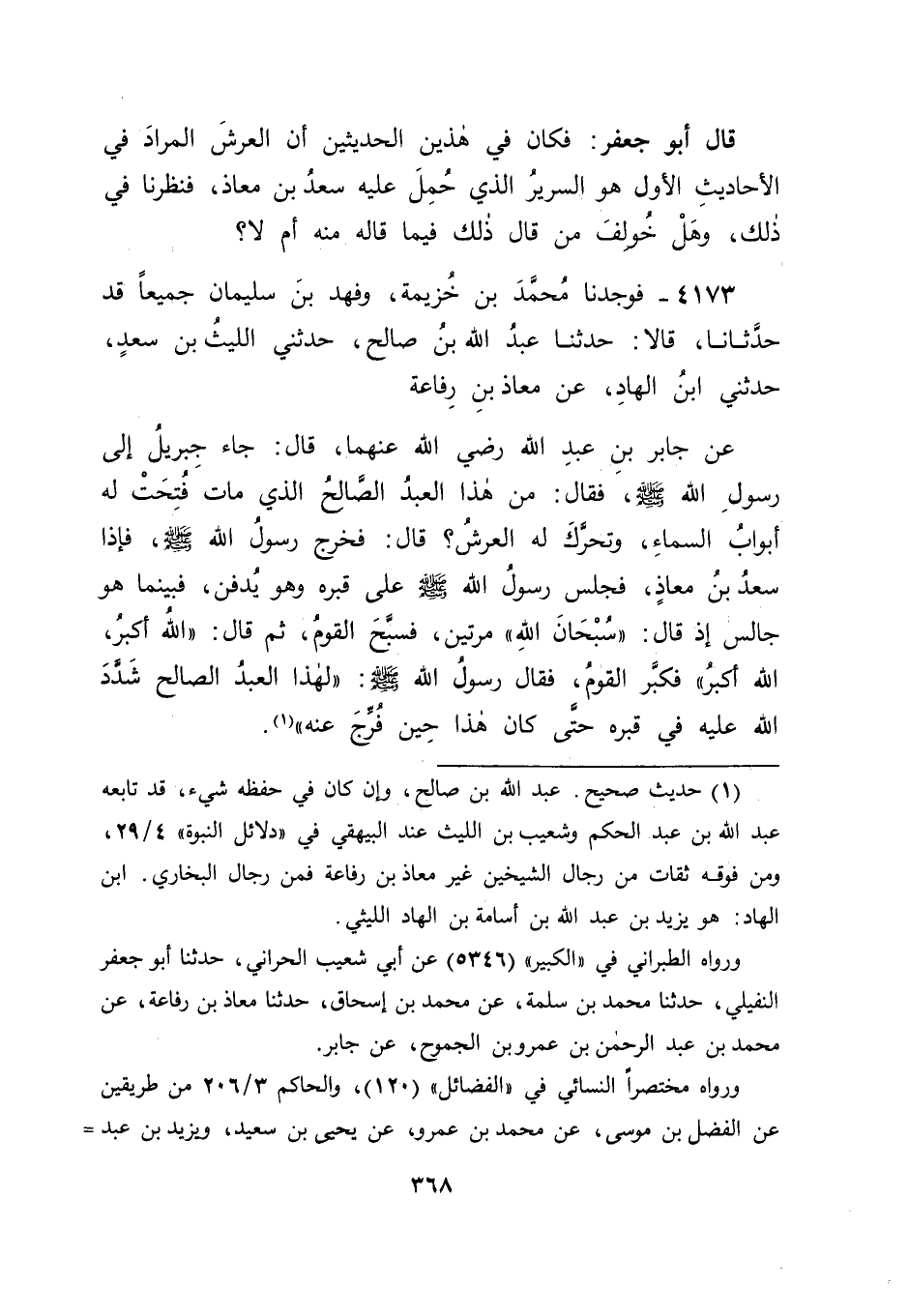 4173 - فَوَجَدْنَا مُحَمَّدَ بْنَ خُزَيْمَةَ، وَفَهْدَ بْنَ سُلَيْمَانَ جَمِيعًا قَدْ حَدَّثَانَا، قَالَا: حَدَّثَنَا عَبْدُ اللهِ بْنُ صَالِحٍ، حَدَّثَنِي اللَّيْثُ بْنُ سَعْدٍ، حَدَّثَنِي ابْنُ الْهَادِ، عَنْ مُعَاذِ بْنِ رِفَاعَةَ، عَنْ جَابِرِ بْنِ عَبْدِ اللهِ رَضِيَ اللهُ عَنْهُمَا، قَالَ: جَاءَ جِبْرِيلُ إِلَى رَسُولِ اللهِ صَلَّى اللَّهُ عَلَيْهِ وَسَلَّمَ، فَقَالَ: مَنْ هَذَا الْعَبْدُ الصَّالِحُ الَّذِي مَاتَ؟ فُتِحَتْ لَهُ أَبْوَابُ السَّمَاءِ، وَتَحَرَّكَ لَهُ الْعَرْشُ، قَالَ: فَخَرَجَ رَسُولُ اللهِ صَلَّى اللَّهُ عَلَيْهِ وَسَلَّمَ، فَإِذَا سَعْدُ بْنُ مُعَاذٍ، فَجَلَسَ رَسُولُ اللهِ صَلَّى اللَّهُ عَلَيْهِ وَسَلَّمَ عَلَى قَبْرِهِ وَهُوَ يُدْفَنُ، فَبَيْنَمَا هُوَ جَالِسٌ إِذْ قَالَ: " سُبْحَانَ اللهِ " مَرَّتَيْنِ، فَسَبَّحَ الْقَوْمُ، ثُمَّ قَالَ: " اللهُ أَكْبَرُ، اللهُ أَكْبَرُ " فَكَبَّرَ الْقَوْمُ، فَقَالَ رَسُولُ اللهِ صَلَّى اللَّهُ عَلَيْهِ وَسَلَّمَ: " لَهَذَا الْعَبْدُ الصَّالِحُ شَدَّدَ اللهُ عَلَيْهِ فِي قَبْرِهِ حَتَّى كَانَ هَذَا حِينَ فُرِّجَ عَنْهُ " -[369]- قَالَ أَبُو جَعْفَرٍ: فَكَانَ فِي هَذَا الْحَدِيثِ مَا قَدْ دَلَّ عَلَى أَنَّ الْعَرْشَ الْمَذْكُورَ فِي الْأَحَادِيثِ الْأُوَلِ لَيْسَ هُوَ السَّرِيرَ الَّذِي حُمِلَ عَلَيْهِ سَعْدٌ؛ لِأَنَّ فِي هَذَا الْحَدِيثِ سُؤَالَ جِبْرِيلَ رَسُولَ اللهِ صَلَّى اللَّهُ عَلَيْهِ وَسَلَّمَ عَنِ الْعَبْدِ الصَّالِحِ الَّذِي مَاتَ، فَفُتِحَتْ لَهُ أَبْوَابُ السَّمَاءِ، وَتَحَرَّكَ لَهُ الْعَرْشُ، وَخُرُوجُ رَسُولِ اللهِ صَلَّى اللَّهُ عَلَيْهِ وَسَلَّمَ عِنْدَ ذَلِكَ لِيَعْلَمَ مِنْ هُوَ حَتَّى عَلِمَ أَنَّهُ سَعْدُ بْنُ مُعَاذٍ، فَكَانَ فِي ذَلِكَ مَا قَدْ دَلَّ عَلَى أَنَّ الْعَرْشَ الْمَذْكُورَ فِي الْأَحَادِيثِ الْأُوَلِ هُوَ غَيْرُ السَّرِيرِ الَّذِي حُمِلَ عَلَيْهِ سَعْدٌ إِذْ كَانَ سَعْدٌ رَضِيَ اللهُ عَنْهُ لَمْ يَكُنْ حُمِلَ عَلَى السَّرِيرِ الَّذِي حُمِلَ عَلَيْهِ إِلَى قَبْرِهِ إِلَى ذَلِكَ الْوَقْتِ، وَإِنَّمَا حُمِلَ عَلَيْهِ بَعْدَ ذَلِكَ
