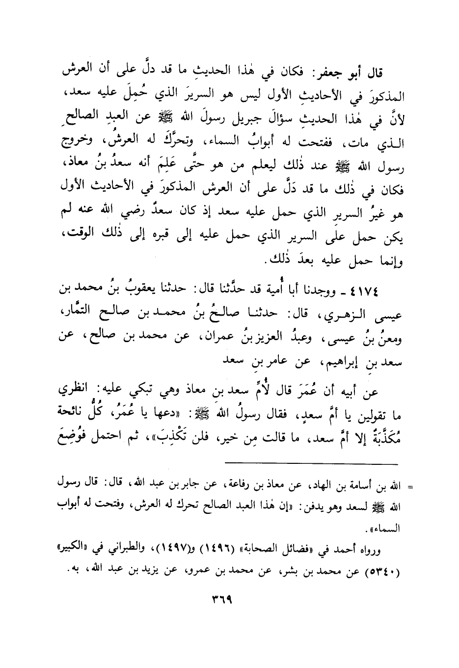4174 - وَوَجَدْنَا أَبَا أُمَيَّةَ قَدْ حَدَّثَنَا قَالَ: حَدَّثَنَا يَعْقُوبُ بْنُ مُحَمَّدِ بْنِ عِيسَى الزُّهْرِيُّ، قَالَ: حَدَّثَنَا صَالِحُ بْنُ مُحَمَّدِ بْنِ صَالِحٍ التَّمَّارُ، وَمَعْنُ بْنُ عِيسَى، وَعَبْدُ الْعَزِيزِ بْنُ عِمْرَانَ، عَنْ مُحَمَّدِ بْنِ صَالِحٍ، عَنْ سَعْدِ بْنِ إِبْرَاهِيمَ، عَنْ عَامِرِ بْنِ سَعْدٍ، عَنْ أَبِيهِ أَنَّ عُمَرَ، قَالَ لِأُمِّ سَعْدِ بْنِ مُعَاذٍ وَهِيَ تَبْكِي عَلَيْهِ: انْظُرِي مَا تَقُولِينَ يَا أُمَّ سَعْدٍ، فَقَالَ رَسُولُ اللهِ صَلَّى اللَّهُ عَلَيْهِ وَسَلَّمَ: " دَعْهَا يَا عُمَرُ، كُلُّ نَائِحَةٍ مُكَذَّبَةٌ إِلَّا أُمَّ سَعْدٍ، مَا قَالَتْ مِنْ خَيْرٍ، فَلَنْ تَكْذِبَ " ثُمَّ احْتُمِلَ فَوُضِعَ -[370]- فِي قَبْرِهِ، فَتَغَيَّرَ لَوْنُ النَّبِيِّ صَلَّى اللَّهُ عَلَيْهِ وَسَلَّمَ، فَقَالَ الْمُسْلِمُونَ: يَا رَسُولَ اللهِ، إِنْ كُنْتَ لَتَقْطَعُنَا، يَعْنُونَ فِي السُّرْعَةِ، قَالَ: " خَشِيتُ أَنْ تَسْبِقَنَا الْمَلَائِكَةُ إِلَى غُسْلِهِ كَمَا سَبَقَتْنَا إِلَى غُسْلِ حَنْظَلَةَ بْنِ أَبِي عَامِرٍ " قَالُوا: يَا رَسُولَ اللهِ، رَأَيْنَا لَوْنَكَ قَدْ تَغَيَّرَ حِينَ قَعَدْتَ عَلَى الْقَبْرِ، قَالَ: " ضُمَّ سَعْدٌ فِي الْقَبْرِ ضَمَّةً، وَلَوْ أُعْفِيَ مِنْهَا أَحَدٌ، أُعْفِيَ مِنْهَا سَعْدٌ " وَقَالَ النَّبِيُّ صَلَّى اللَّهُ عَلَيْهِ وَسَلَّمَ: " نَزَلَ الْأَرْضَ سَبْعُونَ أَلْفَ مَلَكٍ لِشُهُودِ سَعْدٍ، مَا نَزَلُوهَا قَطُّ، وَاسْتَبْشَرَ بِهِ جَمِيعُ أَهْلِ السَّمَاءِ، وَاهْتَزَّ لَهُ الْعَرْشُ "، قَالَ صَالِحٌ يَعْنِي ابْنَ مُحَمَّدٍ: قَالَ أَبِي: قَالَ رَجُلٌ لِسَعْدِ بْنِ إِبْرَاهِيمَ: إِنَّ الْعَرْشَ تَدَعُوهُ الْعَرَبُ السَّرِيرَ، وَإِنَّمَا يَعْنِي سَرِيرَ سَعْدِ بْنِ مُعَاذٍ، فَقَالَ سَعْدٌ: مَا بَلَغَ سَرِيرُ سَعْدِ بْنِ مُعَاذٍ أَنْ يَذْكُرَهُ رَسُولُ اللهِ صَلَّى اللَّهُ عَلَيْهِ وَسَلَّمَ -[371]- قَالَ أَبُو جَعْفَرٍ: فَكَانَ فِي هَذَا الْحَدِيثِ إِخْبَارُ رَسُولِ اللهِ صَلَّى اللَّهُ عَلَيْهِ وَسَلَّمَ بَعْدَ دَفْنِهِ سَعْدًا بِاهْتِزَازِ الْعَرْشِ لَهُ، فَاحْتُمِلَ أَنْ يَكُونَ ذَلِكَ الْعَرْشُ هُوَ الْعَرْشُ الَّذِي قَالَهُ ابْنُ عُمَرَ، وَأُسَيْدُ بْنُ الْحُضَيْرِ، وَاحْتَمَلَ أَنْ يَكُونَ هُوَ خِلَافَهُ -[372]- فَقَالَ قَائِلٌ: كَيْفَ يَكُونُ كَمَا قَالَهُ ابْنُ عُمَرَ وَأُسَيْدُ بْنُ حُضَيْرٍ، وَإِنَّمَا ذَلِكَ إِخْبَارٌ عَنْ سَرِيرٍ لَا نَفَسَ لَهُ، وَلَا يَكُونُ مِنْ مِثْلِهِ الِاهْتِزَازُ الَّذِي ذَكَرَاهُ عَنْهُ؟ فَكَانَ جَوَابَنَا لَهُ فِي ذَلِكَ أَنَّ السَّرِيرَ إِنْ كَانَ كَمَا قَالَ ابْنُ عُمَرَ وَأُسَيْدٌ، فَإِنَّهُ يَحْتَمِلُ أَنْ يَكُونَ عَزَّ وَجَلَّ فَهَّمَهُ بَعْدَ أَنْ حُمِلَ عَلَيْهِ سَعْدٌ مَكَانَهُ مِنَ اللهِ عَزَّ وَجَلَّ وَمَنْزِلَتَهُ مِنْهُ، فَصَارَ مِنْ أَهْلِ الْعِلْمِ وَالْمَعْرِفَةِ بِذَلِكَ، فَاهْتَزَّ لَهُ كَمَا ذَكَرَ ابْنُ عُمَرَ وَأُسَيْدٌ مِنَ اهْتِزَازِهِ، كَمَا أَلْهَمَ اللهُ عَزَّ وَجَلَّ الْخَشَبَةَ الَّتِي كَانَ رَسُولُ اللهِ صَلَّى اللَّهُ عَلَيْهِ وَسَلَّمَ يَخْطُبُ النَّاسَ عَلَيْهَا قَبْلَ أَنْ يَتَّخِذَ الْمِنْبَرَ، فَلَمَّا اتَّخَذَ الْمِنْبَرَ، وَتَحَوَّلَ إِلَيْهِ عَنْهَا، كَانَ مِنْهَا الْحَنِينُ الْمَرْوِيُّ فِي ذَلِكَ كَمَا سَنْذُكُرُهُ فِيمَا بَعْدُ مِنْ كِتَابِنَا هَذَا إِنْ شَاءَ اللهُ عَزَّ وَجَلَّ، وَكَانَ ذَلِكَ عَلَمًا عَظِيمًا مِنْ أَعْلَامِ النُّبُوَّةِ، وَفَضْلًا جَلِيلًا فَضَّلَ اللهُ بِهِ رَسُولَهُ، وَشَرَفًا كَبِيرًا شَرَّفَهُ بِهِ، وَأَلْهَمَهُ مَنْ أَلْهَمَهُ مِنْ جَلَالَةِ مَوْضِعِهِ مِنْهُ مَا أَلْهَمَهُ إِيَّاهُ مِمَّا ذُكِرَ فِي هَذ