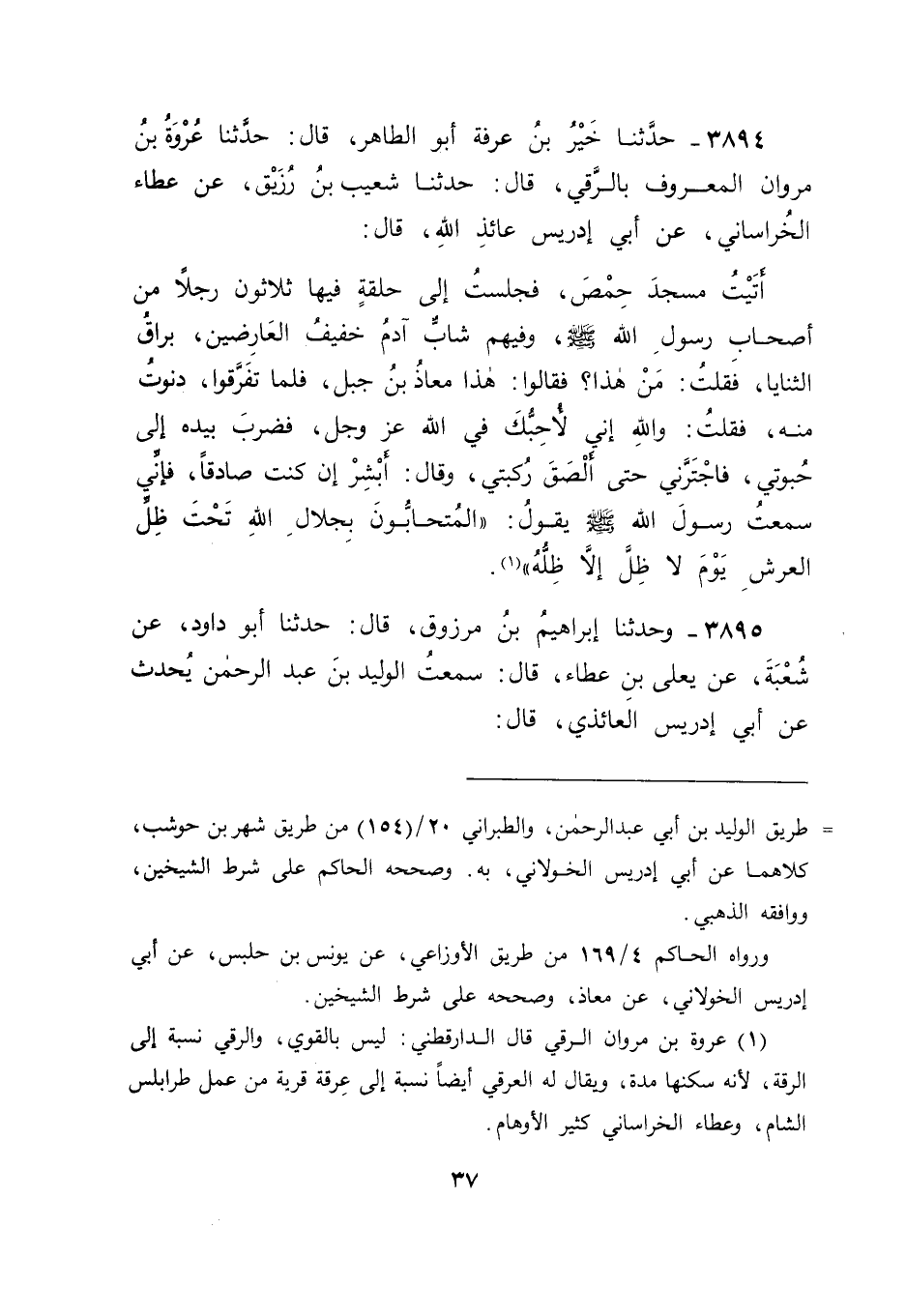 3894 - حَدَّثَنَا خَيْرُ بْنُ عَرَفَةَ أَبُو الطَّاهِرِ، قَالَ: حَدَّثَنَا عُرْوَةُ بْنُ مَرْوَانَ الْمَعْرُوفُ بِالْعِرْقِيِّ، قَالَ: حَدَّثَنَا شُعَيْبُ بْنُ زُرَيْقٍ، عَنْ عَطَاءٍ الْخُرَاسَانِيِّ، عَنْ أَبِي إِدْرِيسَ عَائِذِ اللهِ، قَالَ: أَتَيْتُ مَسْجِدَ حِمْصَ، فَجَلَسْتُ إِلَى حَلْقَةٍ فِيهَا ثَلَاثُونَ رَجُلًا مِنْ أَصْحَابِ رَسُولِ اللهِ صَلَّى اللَّهُ عَلَيْهِ وَسَلَّمَ، وَفِيهِمْ شَابٌّ آدَمُ، خَفِيفُ الْعَارِضَيْنِ، بَرَّاقُ الثَّنَايَا، فَقُلْتُ: مَنْ هَذَا؟ فَقَالُوا: هَذَا مُعَاذُ بْنُ جَبَلٍ، فَلَمَّا تَفَرَّقُوا، دَنَوْتُ مِنْهُ، فَقُلْتُ: وَاللهِ إِنِّي لَأُحِبُّكَ فِي اللهِ عَزَّ وَجَلَّ، فَضَرَبَ بِيَدِهِ إِلَى حُبْوَتِي، فَاجْتَرَّنِي حَتَّى أَلْصَقَ رُكْبَتَيَّ، وَقَالَ: أَبْشِرْ إِنْ كُنْتَ صَادِقًا، فَإِنِّي سَمِعْتُ رَسُولَ اللهِ صَلَّى اللَّهُ عَلَيْهِ وَسَلَّمَ يَقُولُ: " الْمُتَحَابُّونَ بِجِلَالِ اللهِ تَحْتَ ظِلِّ الْعَرْشِ، يَوْمَ لَا ظِلَّ إِلَّا ظِلُّهُ "