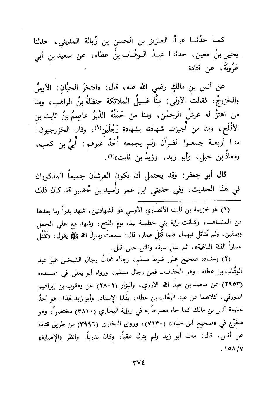 كَمَا حَدَّثَنَا عَبْدُ الْعَزِيزِ بْنُ الْحَسَنِ بْنِ زُبَالَةَ الْمَدِينِيُّ، حَدَّثَنَا يَحْيَى بْنُ مَعِينٍ، حَدَّثَنَا عَبْدُ الْوَهَّابِ بْنُ عَطَاءٍ، عَنْ سَعِيدِ بْنِ أَبِي عَرُوبَةَ، عَنْ قَتَادَةَ، عَنْ أَنَسِ بْنِ مَالِكٍ رَضِيَ اللهُ عَنْهُ، قَالَ: " افْتَخَرَ الْحَيَّانِ: الْأَوْسُ وَالْخَزْرَجُ، فَقَالَتِ الْأُولَى: مِنَّا غِسِّيلُ الْمَلَائِكَةِ حَنْظَلَةُ بْنُ الرَّاهِبِ، وَمِنَّا مَنِ اهْتَزَّ لَهُ عَرْشُ الرَّحْمَنِ، وَمِنَّا مَنْ حَمَتْهُ الدَّبْرُ عَاصِمُ بْنُ ثَابِتِ بْنِ الْأَقْلَحِ، وَمِنَّا مَنْ أُجِيزَتْ شَهَادَتُهُ بِشَهَادَةِ رَجُلَيْنِ، وَقَالَ الْخَزْرَجِيُّونَ: مِنَّا أَرْبَعَةٌ جَمَعُوا الْقُرْآنَ وَلَمْ يَجْمَعْهُ أَحَدٌ غَيْرَهُمْ: أُبَيُّ بْنُ كَعْبٍ، وَمُعَاذُ بْنُ جَبَلٍ، وَأَبُو زَيْدٍ، وَزَيْدُ بْنُ ثَابِتٍ " قَالَ أَبُو جَعْفَرٍ: وَقَدْ يَحْتَمِلُ أَنْ يَكُونَ الْعَرْشَانِ جَمِيعًا الْمَذْكُورَانِ فِي هَذَا الْحَدِيثِ، وَفِي حَدِيثَيِ ابْنِ عُمَرَ وَأُسَيْدِ بْنِ حُضَيْرٍ قَدْ كَانَ ذَلِكَ -[375]- مِنْهُمَا جَمِيعًا وَاللهُ أَعْلَمُ غَيْرَ أَنَّا نُصَدِّقُ بِمَا كَانَ مِنْ رَسُولِ اللهِ صَلَّى اللَّهُ عَلَيْهِ وَسَلَّمَ فِي ذَلِكَ وَنُؤْمِنُ بِهِ، وَقَدْ كَانَ أَهْلُ اللُّغَةِ يَذْهَبُونَ إِلَى أَنَّ الِاهْتِزَازَ هُوَ الِارْتِيَاحُ وَالسُّرُورُ، كَمَا يُقَالَ: فُلَانٌ إِذَا سُئِلَ اهْتَزَّ، أَيِ: اسْتَشْرَفَ لِذَلِكَ وَسُرَّ بِهِ، فَيَكُونُ اللهُ تَعَالَى أَلْهَمَ الْعَرْشَيْنِ مَوْضِعَ سَعْدٍ مِنْهُ، فَكَانَ مِنْهُمَا مَا كَانَ مِمَّا ذُكِرَ فِي هَذِهِ الْأَحَادِيثِ غَيْرَ أَنَّ بَعْضَهُمْ ذَهَبَ إِلَى أَنَّ ذَلِكَ الِاهْتِزَازَ الْمُضَافَ إِلَى الْعَرْشِ إِنَّمَا كَانَ مِنَ الْمَلَائِكَةِ الَّذِينَ يَحْمِلُونَهُ وَيَحُفُّونَ بِهِ، وَأُضِيفَ ذَلِكَ إِلَى الْعَرْشِ، وَإِنْ كَانُوا هُمُ الْمُرَادِينَ بِهِ، وَيَجْعَلُونَ ذَلِكَ كَمِثْلِ قَوْلِهِ عَزَّ وَجَلَّ: {فَمَا بَكَتْ عَلَيْهِمُ السَّمَاءُ وَالْأَرْضُ} [الدخان: 29] ، يَعْنِي: مَا بَكَى عَلَيْهِمْ أَهْلُ السَّمَاءِ وَلَا أَهْلُ الْأَرْضِ، وَكَمَا قَالَ فِيمَا حُكِيَ لَنَا عَمَّنْ حَكَى مِنْ عِبَادِهِ، قَوْلُهُ: {وَاسْأَلِ الْقَرْيَةَ الَّتِي كُنَّا فِيهَا وَالْعِيرَ الَّتِي أَقْبَلْنَا فِيهَا} [يوسف: 82]