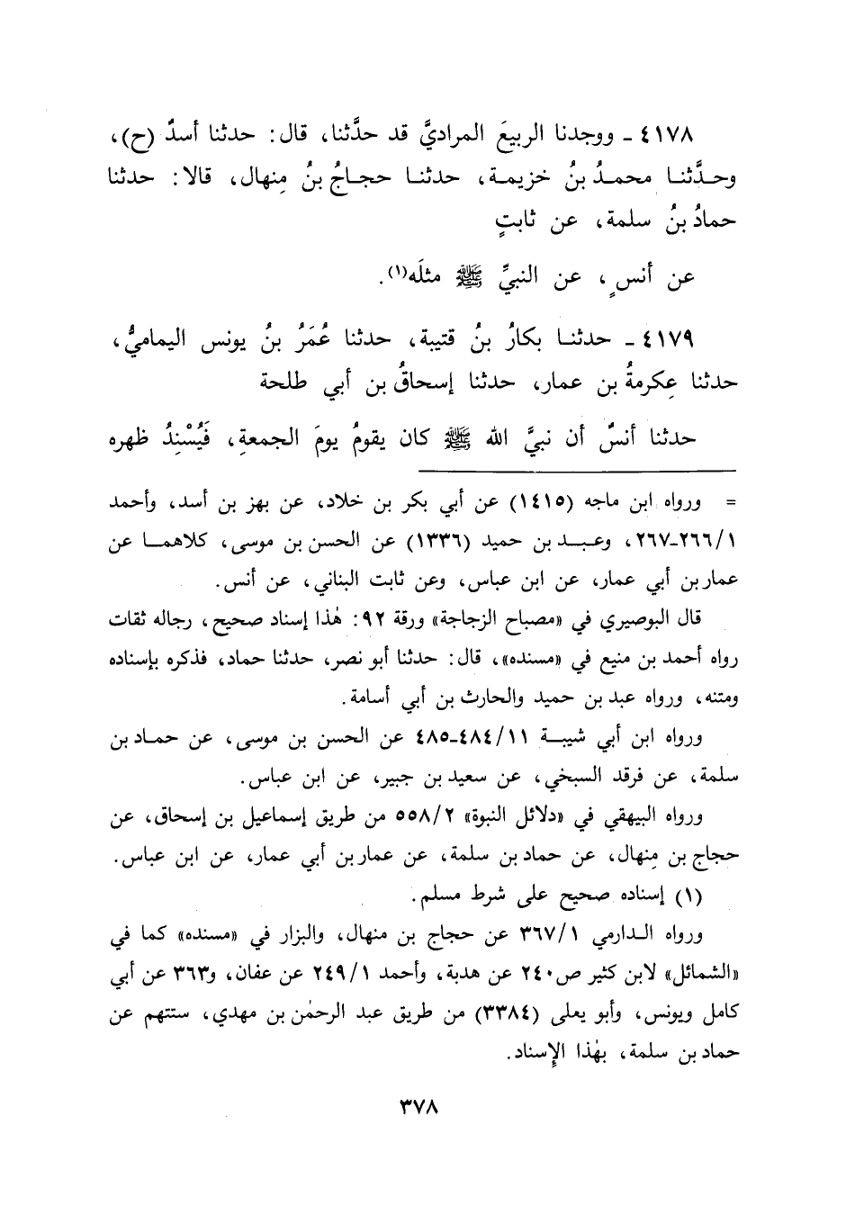 4179 - حَدَّثَنَا بَكَّارُ بْنُ قُتَيْبَةَ، حَدَّثَنَا عُمَرُ بْنُ يُونُسَ الْيَمَامِيُّ، حَدَّثَنَا عِكْرِمَةُ بْنُ عَمَّارٍ، حَدَّثَنَا إِسْحَاقُ بْنُ أَبِي طَلْحَةَ، حَدَّثَنَا أَنَسٌ أَنَّ نَبِيَّ اللهِ صَلَّى اللَّهُ عَلَيْهِ وَسَلَّمَ كَانَ يَقُومُ يَوْمَ الْجُمُعَةِ، فَيُسْنِدُ ظَهْرَهُ -[379]- إِلَى جِذْعٍ مَنْصُوبٍ فِي الْمَسْجِدِ، فَيَخْطُبُ النَّاسَ، فَجَاءَهُ رُومِيٌّ، فَقَالَ: أَصْنَعُ لَكَ شَيْئًا تَقْعُدُ عَلَيْهِ، وَكَأَنَّكَ قَائِمٌ، فَصَنَعَ لَهُ مِنْبَرًا لَهُ دَرَجَتَانِ، وَيَقْعُدُ عَلَى الثَّالِثَةِ، فَلَمَّا قَعَدَ رَسُولُ اللهِ صَلَّى اللَّهُ عَلَيْهِ وَسَلَّمَ عَلَى ذَلِكَ الْمِنْبَرِ، خَارَ الْجِذْعُ كَخُوَارِ الثَّوْرِ حَتَّى ارْتَجَّ الْمَسْجِدُ لِخُوَارِهِ حُزْنًا عَلَى رَسُولِ اللهِ صَلَّى اللَّهُ عَلَيْهِ وَسَلَّمَ، فَنَزَلَ إِلَيْهِ رَسُولُ اللهِ صَلَّى اللَّهُ عَلَيْهِ وَسَلَّمَ، فَالْتَزَمَهُ وَهُوَ يَخُورُ، فَلَمَّا الْتَزَمَهُ رَسُولُ اللهِ صَلَّى اللَّهُ عَلَيْهِ وَسَلَّمَ، سَكَتَ ثُمَّ قَالَ: " وَالَّذِي نَفْسُ مُحَمَّدٍ بِيَدِهِ، لَوْ لَمْ أَلْتَزِمْهُ لَمْ يَزَلْ هَكَذَا إِلَى يَوْمِ الْقِيَامَةِ " تَحَزُّنًا عَلَى رَسُولِ اللهِ، فَأَمَرَ بِهِ نَبِيُّ اللهِ صَلَّى اللَّهُ عَلَيْهِ وَسَلَّمَ فَدُفِنَ "
