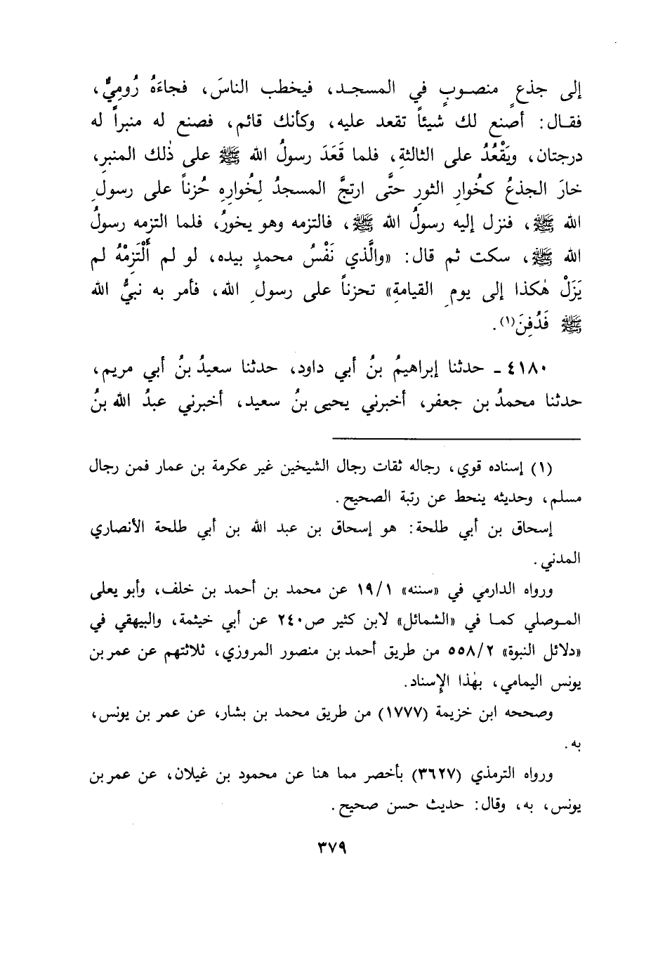 4180 - حَدَّثَنَا إِبْرَاهِيمُ بْنُ أَبِي دَاوُدَ، حَدَّثَنَا سَعِيدُ بْنُ أَبِي مَرْيَمَ، حَدَّثَنَا مُحَمَّدُ بْنُ جَعْفَرٍ، أَخْبَرَنِي يَحْيَى بْنُ سَعِيدٍ، أَخْبَرَنِي عَبْدُ اللهِ بْنُ -[380]- حَفْصِ بْنِ أَنَسٍ أَنَّهُ سَمِعَ جَابِرَ بْنَ عَبْدِ اللهِ، يَقُولُ: كَانَ جِذْعٌ يَقُومُ إِلَيْهِ النَّبِيُّ صَلَّى اللَّهُ عَلَيْهِ وَسَلَّمَ، فَلَمَّا وَضَعَ الْمِنْبَرَ، سَمِعْنَا لِلْجِذْعِ مِثْلَ أَصْوَاتِ الْعِشَارِ حَتَّى نَزَلَ إِلَيْهِ النَّبِيُّ صَلَّى اللَّهُ عَلَيْهِ وَسَلَّمَ، وَوَضَعَ يَدَهُ عَلَيْهِ " -[381]-