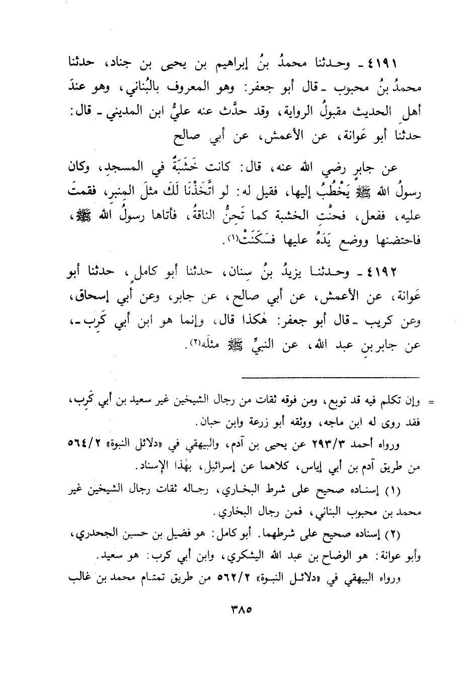 4191 - وَحَدَّثَنَا مُحَمَّدُ بْنُ إِبْرَاهِيمَ بْنِ يَحْيَى بْنِ جُنَادٍ، حَدَّثَنَا مُحَمَّدُ بْنُ مَحْبُوبٍ قَالَ أَبُو جَعْفَرٍ: وَهُوَ الْمَعْرُوفُ بِالْبُنَانِيِّ، وَهُوَ عِنْدَ أَهْلِ الْحَدِيثِ مَقْبُولُ الرِّوَايَةِ، وَقَدْ حَدَّثَ عَنْهُ عَلِيُّ بْنُ الْمَدِينِيِّ، قَالَ: حَدَّثَنَا أَبُو عَوَانَةَ، عَنِ الْأَعْمَشِ، عَنْ أَبِي صَالِحٍ، عَنْ جَابِرٍ رَضِيَ اللهُ عَنْهُ، قَالَ: " كَانَتْ خَشَبَةٌ فِي الْمَسْجِدِ وَكَانَ رَسُولُ اللهِ صَلَّى اللَّهُ عَلَيْهِ وَسَلَّمَ يَخْطُبُ إِلَيْهَا، فَقِيلَ لَهُ: " لَوِ اتَّخَذْنَا لَكَ مِثْلَ الْمِنْبَرِ، فَقُمْتَ عَلَيْهِ، فَفَعَلَ، فَحَنَّتِ الْخَشَبَةُ كَمَا تَحِنُّ النَّاقَةُ، فَأَتَاهَا رَسُولُ اللهِ صَلَّى اللَّهُ عَلَيْهِ وَسَلَّمَ، فَاحْتَضَنَهَا وَوَضَعَ يَدَهُ عَلَيْهَا فَسَكَنَتْ "