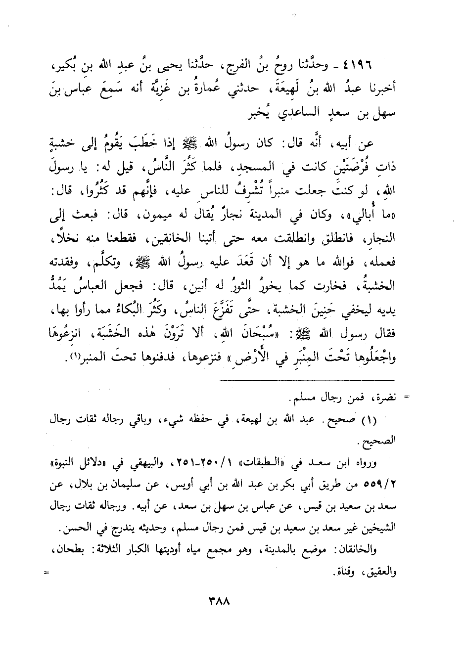 4196 - وَحَدَّثَنَا رَوْحُ بْنُ الْفَرَجِ، حَدَّثَنَا يَحْيَى بْنُ عَبْدِ اللهِ بْنِ بُكَيْرٍ، أَخْبَرَنَا عَبْدُ اللهِ بْنُ لَهِيعَةَ، حَدَّثَنِي عُمَارَةُ بْنُ غَزِيَّةَ، أَنَّهُ سَمِعَ عَبَّاسَ بْنَ سَهْلِ بْنِ سَعْدٍ السَّاعِدِيَّ، يُخْبِرُ عَنْ أَبِيهِ أَنَّهُ قَالَ: " كَانَ رَسُولُ اللهِ صَلَّى اللَّهُ عَلَيْهِ وَسَلَّمَ إِذَا خَطَبَ يَقُومُ إِلَى خَشَبَةٍ ذَاتِ فُرْضَتَيْنِ كَانَتْ فِي الْمَسْجِدِ، فَلَمَّا كَثُرَ النَّاسُ، قِيلَ لَهُ: يَا رَسُولَ اللهِ، لَوْ كُنْتَ جَعَلْتَ مِنْبَرًا تُشْرِفُ لِلنَّاسِ عَلَيْهِ، فَإِنَّهُمْ قَدْ كَثُرُوا، قَالَ: " مَا أُبَالِي " وَكَانَ فِي الْمَدِينَةِ نَجَّارٌ يُقَالُ لَهُ: مَيْمُونٌ، قَالَ: فَبَعَثَ إِلَى النَّجَّارِ، فَانْطَلَقَ وَانْطَلَقْتُ مَعَهُ حَتَّى أَتَيْنَا الْخَانِقَيْنِ، فَقَطَعْنَا مِنْهُ نَخْلًا، فَعَمِلَهُ، فَوَاللهِ مَا هُوَ إِلَّا أَنْ قَعَدَ عَلَيْهِ رَسُولُ اللهِ صَلَّى اللَّهُ عَلَيْهِ وَسَلَّمَ، وَتَكَلَّمَ، وَفَقَدَتْهُ الْخَشَبَةُ، فَخَارَتْ كَمَا يَخُورُ الثَّوْرُ لَهُ أَنِينٌ، قَالَ: فَجَعَلَ الْعَبَّاسُ يَمُدُّ يَدَيْهِ لِيُخْفِيَ حَنِينَ الْخَشَبَةِ، حَتَّى تَفَزَّعَ النَّاسُ، وَكَثُرَ الْبُكَاءُ مِمَّا رَأَوْا بِهَا، فَقَالَ رَسُولُ اللهِ صَلَّى اللَّهُ عَلَيْهِ وَسَلَّمَ: " سُبْحَانَ اللهِ، أَلَا تَرَوْنَ هَذِهِ الْخَشَبَةَ، انْزِعُوهَا وَاجْعَلُوهَا تَحْتَ الْمِنْبَرِ فِي الْأَرْضِ " فَنَزَعُوهَا، فَدَفَنُوهَا تَحْتَ الْمِنْبَرِ " -[389]- فَفِي هَذِهِ الْآثَارِ مَا ذُكِرَ فِيهَا مِمَّا كَانَ رَسُولُ اللهِ صَلَّى اللَّهُ عَلَيْهِ وَسَلَّمَ يَخْطُبُ إِلَيْهِ -[390]- حِينَ تَنَحَّى عَنْهُ إِلَى الْمِنْبَرِ مِنَ الْحَنِينِ إِلَيْهِ، وَمِمَّا سِوَى ذَلِكَ مِمَّا ذُكِرَ فِي هَذِهِ الْآثَارِ لِمَا أَحْدَثَهُ اللهُ فِيهِ حَتَّى أَسْمَعَ النَّاسَ مِنْهُ مَا أَسْمَعَهُمْ مِنْهُ مِمَّا يَكُونُ مِنْ ذَوِي الْأَرْوَاحِ مِنْ بَنِي آدَمَ وَمِمَّا سِوَاهُمْ، وَفِي هَذِهِ الْآثَارِ فِي الْجِذْعِ مَا ذُكِرَ فِيهَا مِنْهُ مِنْ دَفْنِهِ بِأَمْرِ رَسُولِ اللهِ صَلَّى اللَّهُ عَلَيْهِ وَسَلَّمَ، وَمِنْ أَخْذِ أُبَيٍّ إِيَّاهُ، وَأَنَّهُ لَمْ يَزَلْ عِنْدَهُ حَتَّى صَارَ رُفَاتًا، وَمِنْ ذِكْرِ الْمَوْضِعِ الَّذِي دُفِنَ فِيهِ، وَأَنَّهُ تَحْتَ مِنْبَرِ رَسُولِ اللهِ صَلَّى اللَّهُ عَلَيْهِ وَسَلَّمَ، وَلَيْسَ ذَلِكَ بِاخْتِلَافٍ؛ لِأَنَّهُ قَدْ يَجُوزُ أَنْ يَكُونَ أَخْذُ أُبَيٍّ إِيَّاهُ بَعْدَمَا دُفِنَ، لِيَكُونَ عِنْدَهُ عَلَى حَالٍ أَصْوَنَ لَهُ مِنَ الدَّفْنِ، فَلَمْ يُمْنَعْ مِنْ ذَلِكَ لِهَذَا الْمَعْنَى، فَلَمْ يَزَلْ عِنْدَهُ حَتَّى بَلِيَ، وَصَارَ رُفَاتًا، وَاللهُ أَعْلَمُ بِحَقِيقَةِ مَا كَانَ فِي ذَلِكَ غَيْرَ أَنَّ فِي هَذِهِ الْآثَارِ أَنَّ اللهَ تَعَالَى أَحْدَثَ فِي ذَلِكَ الْجِذْعِ مَا أَحْدَثَهُ فِيهِ مِمَّا وَقَفَ عَلَيْهِ النَّاسُ مِنْهُ مِمَّا لَمْ يَكُنْ مَوْهُومًا مِنْ مِثْلِهِ حَتَّى أَحْدَثَهُ اللهُ عَزَّ وَجَلَّ فِيهِ، وَجَعَلَهُ عَلَمًا مِنْ أَعْلَامِ نُبُوَّةِ نَبِيِّهِ صَلَّى اللَّهُ عَلَيْهِ وَسَلَّمَ وَفَضِيلَتِهِ، لِيَكُونَ ذَلِكَ تَنْبِيهًا لِلنَّاسِ عَلَى مَعْرِفَةِ مَوْضِعِهِ مِنْهُ جَلَّ وَعَزَّ، وَكَذَلِكَ مَا كَانَ مِنْهُ فِي حِرَاءَ لَمَّا تَحَرَّكَ وَهُوَ عَلَيْهِ، وَمَنْ سِوَاهُ مِنْ أَصْحَابِهِ، مِنْهُمْ أَبُو بَكْرٍ وَعُمَرُ رَضِيَ اللهُ عَنْهُمَا، وَمِنْ قَوْلِهِ لَهُ لَمَّا رَجَفَ بِهِمْ: " اسْكُنْ حِرَاءُ، فَإِنَّمَا عَلَيْكَ نَبِيٌّ أَوْ صِدِّيقٌ أَوْ شَهِيدٌ "، وَسَنَذْكُرُ ذَلِكَ الْبَابَ وَمِمَّا رُوِيَ فِيهِ بَعْدُ مِنْ كِتَابِنَا هَذَا إِنْ شَاءَ اللهُ عَزَ