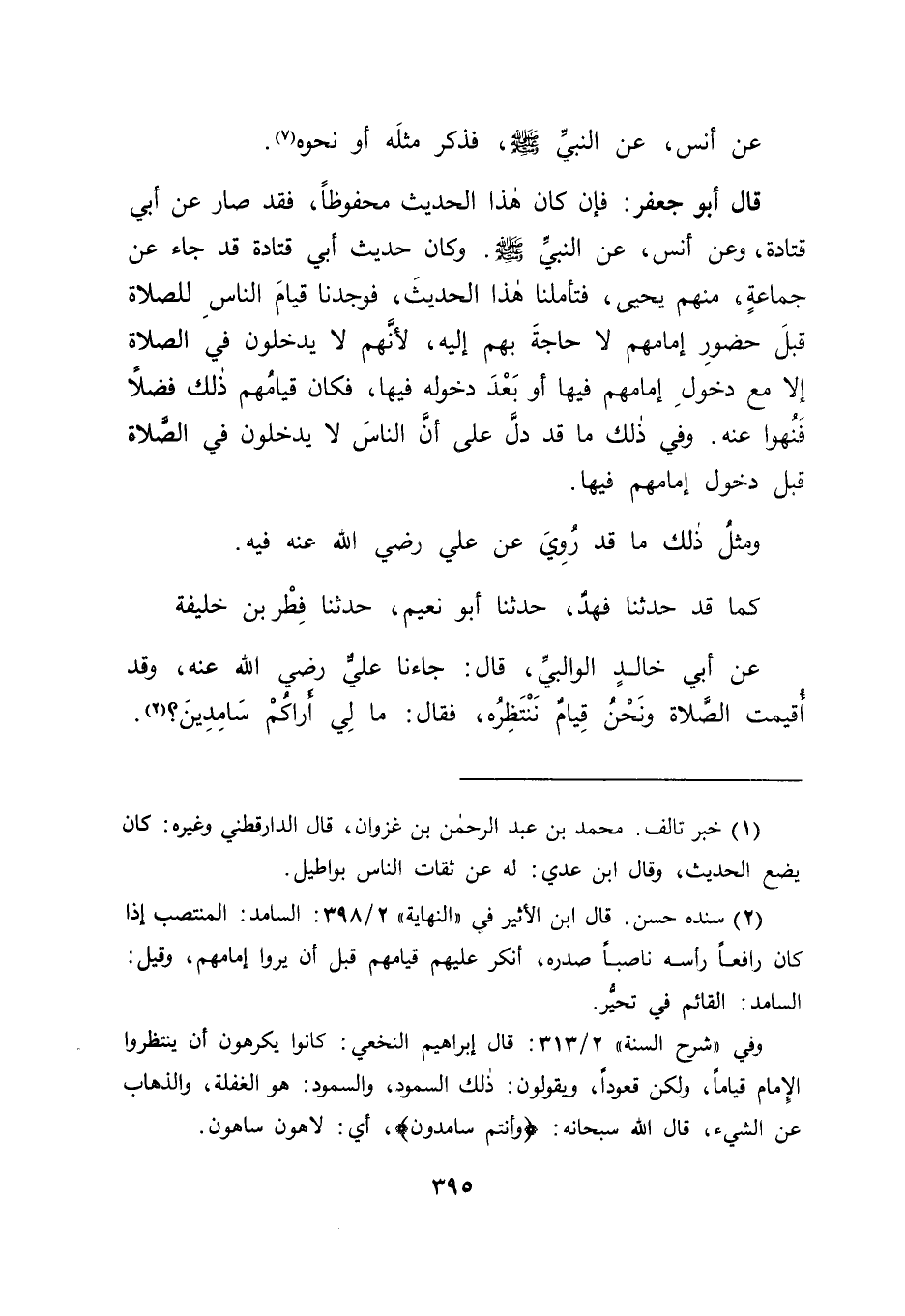 كَمَا قَدْ حَدَّثَنَا فَهْدٌ، حَدَّثَنَا أَبُو نُعَيْمٍ، حَدَّثَنَا فِطْرُ بْنُ خَلِيفَةَ، عَنْ أَبِي خَالِدٍ الْوَالِبِيِّ، قَالَ: جَاءَنَا عَلِيٌّ رَضِيَ اللهُ عَنْهُ، وَقَدْ أُقِيمَتِ الصَّلَاةُ وَنَحْنُ قِيَامٌ نَنْتَظِرُهُ، فَقَالَ: " مَا لِي أَرَاكُمْ سَامِدِينَ؟ " -[396]- قَالَ أَبُو جَعْفَرٍ: وَالسُّمُودُ عِنْدَ أَهْلِ اللُّغَةِ: اللهْوُ، كَذَلِكَ قَالَ أَبُو عُبَيْدَةَ كَمَا حَدَّثَنَا وَلَّادٌ، قَالَ: حَدَّثَنَا الْمَصَادِرِيُّ عَنْهُ، وَكَذَلِكَ قَالَ الْفَرَّاءُ، فَنُهُوا أَنْ لَا يَكُونُوا لَاهِينَ وَاللهُ الْمُوَفِّقُ