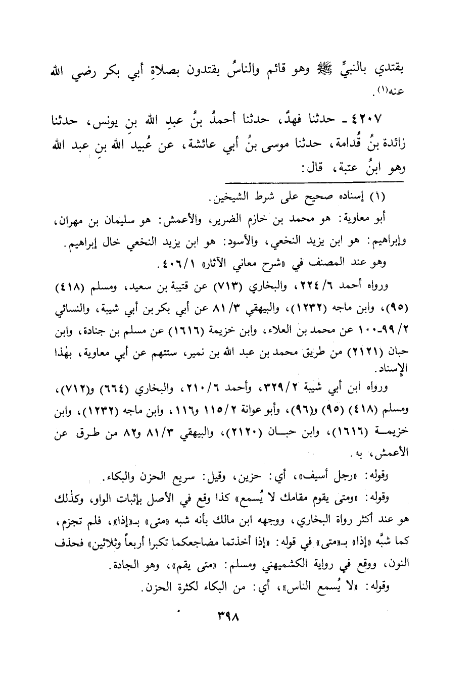 4207 - حَدَّثَنَا فَهْدٌ، حَدَّثَنَا أَحْمَدُ بْنُ عَبْدِ اللهِ بْنِ يُونُسَ، حَدَّثَنَا زَائِدَةُ بْنُ قُدَامَةَ، حَدَّثَنَا مُوسَى بْنُ أَبِي عَائِشَةَ، عَنْ عُبَيْدِ اللهِ بْنِ عَبْدِ اللهِ وَهُوَ ابْنُ عُتْبَةَ، قَالَ: -[399]- دَخَلْتُ عَلَى عَائِشَةَ رَضِيَ اللهُ عَنْهَا، فَقُلْتُ: " أَلَا تُحَدِّثِينِي عَنْ مَرَضِ رَسُولِ اللهِ صَلَّى اللَّهُ عَلَيْهِ وَسَلَّمَ، قَالَتْ: بَلَى، " كَانَ النَّاسُ عُكُوفًا فِي الْمَسْجِدِ يَنْتَظِرُونَ رَسُولَ اللهِ صَلَّى اللَّهُ عَلَيْهِ وَسَلَّمَ لِصَلَاةِ الْعِشَاءِ الْآخِرَةِ، فَأَرْسَلَ رَسُولُ اللهِ صَلَّى اللَّهُ عَلَيْهِ وَسَلَّمَ إِلَى أَبِي بَكْرٍ أَنْ يُصَلِّيَ بِالنَّاسِ، فَكَانَ يُصَلِّي بِهِمْ تِلْكَ الْأَيَّامَ، ثُمَّ إِنَّ رَسُولَ اللهِ صَلَّى اللَّهُ عَلَيْهِ وَسَلَّمَ وَجَدَ فِي نَفْسِهِ خِفَّةً، فَخَرَجَ يُهَادَى بَيْنَ رَجُلَيْنِ لِصَلَاةِ الظُّهْرِ وَأَبُو بَكْرٍ يُصَلِّي بِالنَّاسِ، فَلَمَّا رَآهُ أَبُو بَكْرٍ رَضِيَ اللهُ عَنْهُ ذَهَبَ لِيَتَأَخَّرَ، فَأَوْمَأَ إِلَيْهِ أَنْ لَا تَتَأَخَّرَ، وَقَالَ لَهُمَا: " أَجْلِسَانِي إِلَى جَنْبِهِ " فَأَجْلَسَاهُ إِلَى جَنْبِ أَبِي بَكْرٍ، فَجَعَلَ أَبُو بَكْرٍ رَضِيَ اللهُ عَنْهُ يُصَلِّي وَهُوَ قَائِمٌ بِصَلَاةِ رَسُولِ اللهِ صَلَّى اللَّهُ عَلَيْهِ وَسَلَّمَ وَالنَّاسُ يُصَلُّونَ بِصَلَاةِ أَبِي بَكْرٍ رَضِيَ اللهُ عَنْهُ، وَالنَّبِيُّ صَلَّى اللَّهُ عَلَيْهِ وَسَلَّمَ قَاعِدٌ، قَالَ عُبَيْدُ اللهِ: فَدَخَلْتُ عَلَى ابْنِ عَبَّاسٍ رَضِيَ اللهُ عَنْهُ، فَعَرَضْتُ حَدِيثَهَا عَلَيْهِ، فَمَا أَنْكَرَ مِنْ ذَلِكَ شَيْئًا " قَالَ أَبُو جَعْفَرٍ: فَفِي هَذَيْنِ الْحَدِيثَيْنِ أَنَّ أَبَا بَكْرٍ رَضِيَ اللهُ عَنْهُ كَانَ يُصَلِّي بِصَلَاةِ رَسُولِ اللهِ صَلَّى اللَّهُ عَلَيْهِ وَسَلَّمَ، وَفِي الْحَدِيثِ الْأَوَّلِ مِنْهُمَا أَنَّ رَسُولَ اللهِ صَلَّى اللَّهُ عَلَيْهِ وَسَلَّمَ كَانَ يُصَلِّي بِالنَّاسِ وَأَبُو بَكْرٍ رَضِيَ اللهُ عَنْهُ يَقْتَدِي بِهِ، وَهُوَ قَائِمٌ، وَالنَّاسُ يُصَلُّونَ، يَعْنِي بِصَلَاةِ أَبِي بَكْرٍ رَضِيَ اللهُ عَنْهُ -[400]- وَفِي الْحَدِيثِ الثَّانِي مِنْهُمَا أَنَّ أَبَا بَكْرٍ رَضِيَ اللهُ عَنْهُ جَعَلَ يُصَلِّي وَهُوَ قَائِمٌ بِصَلَاةِ النَّبِيِّ صَلَّى اللَّهُ عَلَيْهِ وَسَلَّمَ وَالنَّاسُ يُصَلُّونَ بِصَلَاةِ أَبِي بَكْرٍ رَضِيَ اللهُ عَنْهُ فَتَأَمَّلْنَا هَذَيْنِ الْحَدِيثَيْنِ لِنَعْلَمَ مَنْ كَانَ الْإِمَامَ فِي تِلْكَ الصَّلَاةِ مِنْ رَسُولِ اللهِ صَلَّى اللَّهُ عَلَيْهِ وَسَلَّمَ وَمِنْ أَبِي بَكْرٍ إِنْ شَاءَ اللهُ، فَكَانَ فِي الْحَدِيثِ الْأَوَّلِ مِنْهُمَا مَا قَدْ دَلَّ أَنَّ رَسُولَ اللهِ صَلَّى اللَّهُ عَلَيْهِ وَسَلَّمَ كَانَ هُوَ الْإِمَامَ فِيهَا، وَأَنَّ أَبَا بَكْرٍ رَضِيَ اللهُ عَنْهُ عَادَ مَأْمُومًا مُصَلِّيًا بِصَلَاةِ رَسُولِ اللهِ صَلَّى اللَّهُ عَلَيْهِ وَسَلَّمَ، وَإِذَا كَانَ كَذَلِكَ، كَانَ النَّاسُ جَمِيعًا فِي تِلْكَ الصَّلَاةِ مُصَلِّينَ بِصَلَاةِ رَسُولِ اللهِ صَلَّى اللَّهُ عَلَيْهِ وَسَلَّمَ لَا بِصَلَاةِ أَبِي بَكْرٍ رَضِيَ اللهُ عَنْهُ وَكَانَ فِي الْحَدِيثِ الثَّانِي مِنْهُمَا أَنَّ أَبَا بَكْرٍ رَضِيَ اللهُ عَنْهُ جَعَلَ يُصَلِّي بِهِمْ وَهُوَ قَائِمٌ يُصَلِّي بِصَلَاةِ النَّبِيِّ صَلَّى اللَّهُ عَلَيْهِ وَسَلَّمَ، وَالنَّاسُ يُصَلُّونَ بِصَلَاةِ أَبِي بَكْرٍ رَضِيَ اللهُ عَنْهُ، وَالنَّبِيُّ صَلَّى اللَّهُ عَلَيْهِ وَسَلَّمَ قَاعِدٌ، وَفِي هَذَا الْحَدِيثِ مُوَافَقَةُ ابْنِ عَبَّاسٍ عَائِشَةَ عَلَى مَا فِيهِ وَإِذَا كَانُوا يُصَلُّونَ بِصَلَاةِ أَبِي بَكْرٍ كَانَ فِي ذَلِكَ مَا قَدْ دَلَّ عَلَى 