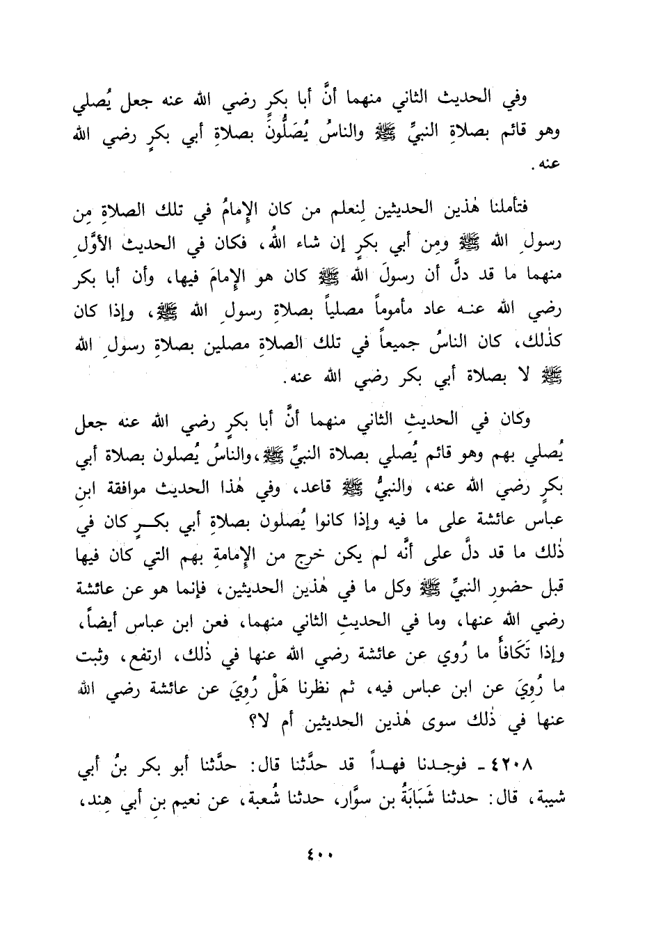 4208 - فَوَجَدْنَا فَهْدًا قَدْ حَدَّثَنَا قَالَ: حَدَّثَنَا أَبُو بَكْرِ بْنُ أَبِي شَيْبَةَ، قَالَ: حَدَّثَنَا شَبَابَةُ بْنُ سَوَّارٍ، حَدَّثَنَا شُعْبَةُ، عَنْ نُعَيْمِ بْنِ أَبِي هِنْدٍ، -[401]- عَنْ أَبِي وَائِلٍ، عَنْ مَسْرُوقٍ، عَنْ عَائِشَةَ رَضِيَ اللهُ عَنْهَا، قَالَتْ: " صَلَّى رَسُولُ اللهِ صَلَّى اللَّهُ عَلَيْهِ وَسَلَّمَ فِي مَرَضِهِ الَّذِي تُوُفِّيَ فِيهِ خَلْفَ أَبِي بَكْرٍ رَضِيَ اللهُ عَنْهُ قَاعِدًا "