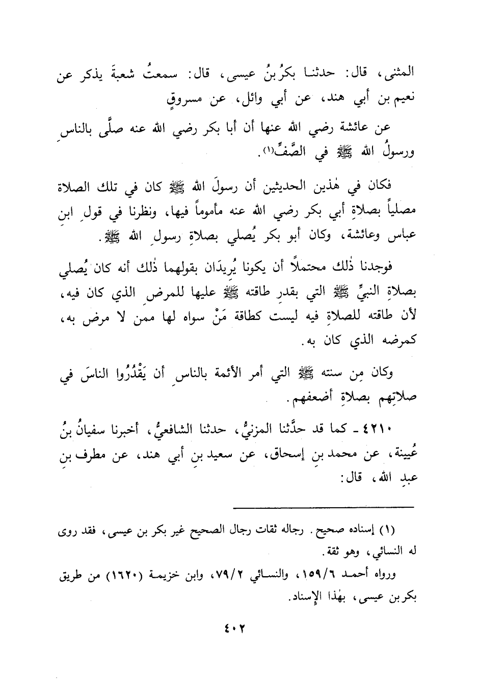 4210 - كَمَا قَدْ حَدَّثَنَا الْمُزَنِيُّ، حَدَّثَنَا الشَّافِعِيُّ، أَخْبَرَنَا سُفْيَانُ بْنُ عُيَيْنَةَ، عَنْ مُحَمَّدِ بْنِ إِسْحَاقَ، عَنْ سَعِيدِ بْنِ أَبِي هِنْدٍ، عَنْ مُطَرِّفِ بْنِ عَبْدِ اللهِ، قَالَ: -[403]- سَمِعْتُ عُثْمَانَ بْنَ أَبِي الْعَاصِ، قَالَ: " أَمَرَنِي رَسُولُ اللهِ صَلَّى اللَّهُ عَلَيْهِ وَسَلَّمَ أَنْ أَؤُمَّ النَّاسَ، وَأَنْ أَقْدُرَهُمْ بِأَضْعَفِهِمْ، فَإِنَّ فِيهِمُ الْكَبِيرَ، وَالسَّقِيمَ، وَالضَّعِيفَ، وَذَا الْحَاجَةِ " فَكَانَتْ صَلَاةُ أَبِي بَكْرٍ بِصَلَاةِ النَّبِيِّ صَلَّى اللَّهُ عَلَيْهِ وَسَلَّمَ إِنَّمَا هِيَ تَقْدِيرُهُ إِيَّاهَا، وَصَلَاتُهُ بِالنَّاسِ مِثْلُهَا، وَتَرْكُهُ الْمُجَاوَزَةَ بِطَاقَتِهِ فِيهَا إِلَى مَا هُوَ فَوْقَ ذَلِكَ، فَكَانَتْ تِلْكَ صَلَاتَهُ بِصَلَاتِهِ لَا بِمَا سِوَى ذَلِكَ وَكَانَ هَذَا أَوْلَى مَا حُمِلَ عَلَيْهِ هَذَا الْمَعْنَى؛ لِأَنَّ النَّاسَ فِي تِلْكَ الصَّلَاةِ لَمْ يَكُنْ إِمَامُهُمْ فِيهَا إِلَّا إِمَامٌ وَاحِدٌ، لَا إِمَامَانِ، وَلَمَّا كَانَ فِيهَا أَنَّ أَبَا بَكْرٍ كَانَ هُوَ الْإِمَامَ بِالنَّاسِ فِيهَا غَيْرَ النَّبِيِّ صَلَّى اللَّهُ عَلَيْهِ وَسَلَّمَ، وَجَبَ أَنْ يَكُونَ هُوَ الْإِمَامَ فِيهَا لِلنَّبِيِّ صَلَّى اللَّهُ عَلَيْهِ وَسَلَّمَ أَيْضًا، وَقَدْ حَقَّقَ ذَلِكَ حَدِيثُ مَسْرُوقٍ عَنْ عَائِشَةَ رَضِيَ اللهُ عَنْهَا أَنَّ -[404]- رَسُولَ اللهِ صَلَّى اللَّهُ عَلَيْهِ وَسَلَّمَ كَانَ فِي تِلْكَ الصَّلَاةِ خَلْفَ أَبِي بَكْرٍ وَقَدْ رُوِيَ حَدِيثُ مُوسَى بْنِ أَبِي عَائِشَةَ مِنْ غَيْرِ طَرِيقِ زَائِدَةَ بِمَعْنًى زَائِدٍ عَلَى مَا فِي حَدِيثِ زَائِدَةَ