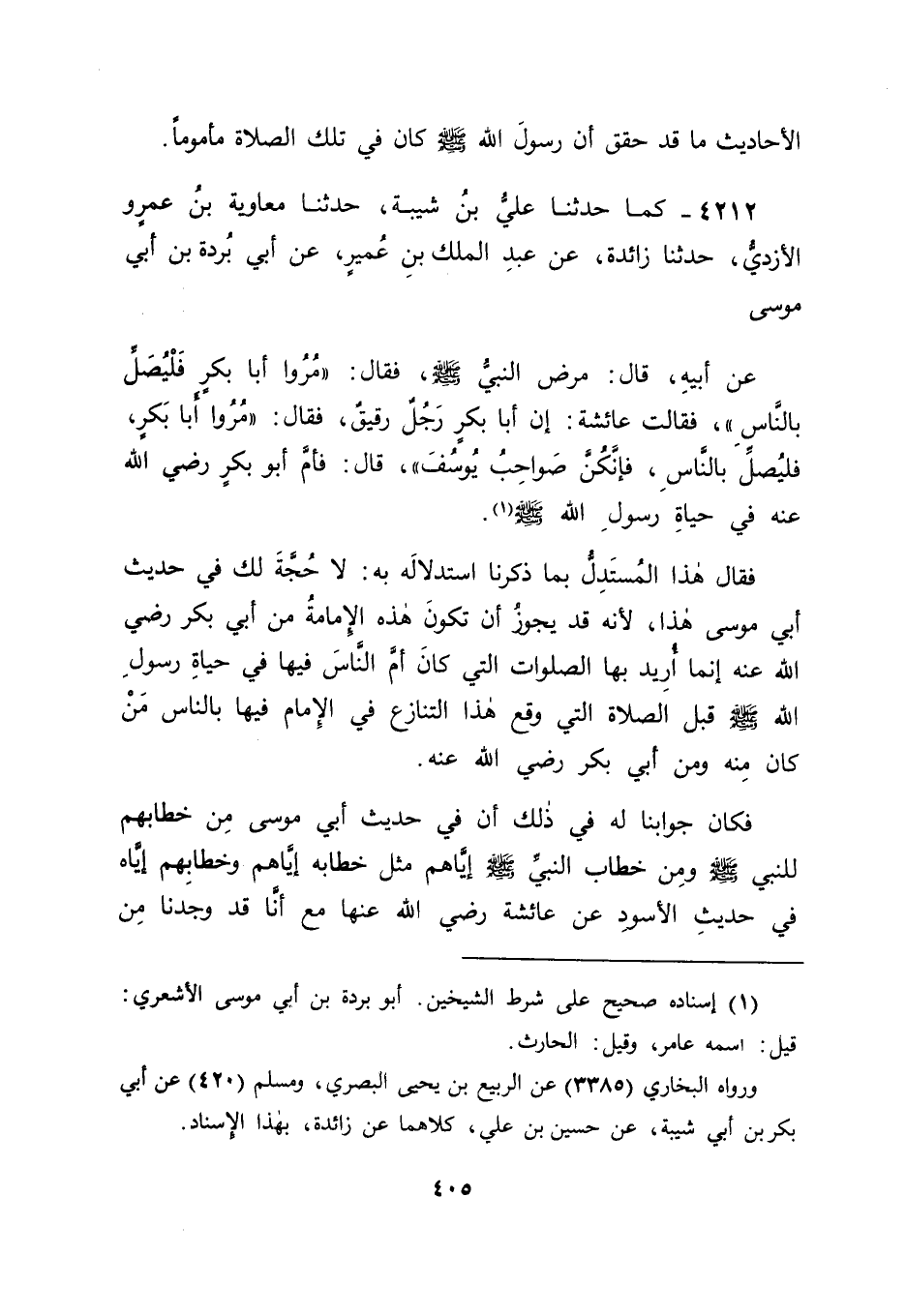 4212 - كَمَا حَدَّثَنَا عَلِيُّ بْنُ شَيْبَةَ، حَدَّثَنَا مُعَاوِيَةُ بْنُ عَمْرٍو الْأَزْدِيُّ، حَدَّثَنَا زَائِدَةُ، عَنْ عَبْدِ الْمَلِكِ بْنِ عُمَيْرٍ، عَنْ أَبِي بُرْدَةَ بْنِ أَبِي مُوسَى، عَنْ أَبِيهِ، قَالَ: " مَرِضَ النَّبِيُّ صَلَّى اللَّهُ عَلَيْهِ وَسَلَّمَ، فَقَالَ: " مُرُوا أَبَا بَكْرٍ فَلْيُصَلِّ بِالنَّاسِ " فَقَالَتْ عَائِشَةُ: إِنَّ أَبَا بَكْرٍ رَجُلٌ رَقِيقٌ، فَقَالَ: " مُرُوا أَبَا بَكْرٍ، فَلْيُصَلِّ بِالنَّاسِ، فَإِنَّكُنَّ صَوَاحِبُ يُوسُفَ " قَالَ: فَأَمَّ أَبُو بَكْرٍ رَضِيَ اللهُ عَنْهُ فِي حَيَاةِ رَسُولِ اللهِ صَلَّى اللَّهُ عَلَيْهِ وَسَلَّمَ " فَقَالَ هَذَا الْمُسْتَدِلُّ بِمَا ذَكَرْنَا اسْتِدْلَالَهُ بِهِ: لَا حُجَّةَ لَكَ فِي حَدِيثِ أَبِي مُوسَى هَذَا؛ لِأَنَّهُ قَدْ يَجُوزُ أَنْ تَكُونَ هَذِهِ الْإِمَامَةُ مِنْ أَبِي بَكْرٍ رَضِيَ اللهُ عَنْهُ إِنَّمَا أُرِيدَ بِهَا الصَّلَوَاتُ الَّتِي كَانَ أَمَّ النَّاسَ فِيهَا فِي حَيَاةِ رَسُولِ اللهِ صَلَّى اللَّهُ عَلَيْهِ وَسَلَّمَ قَبْلَ الصَّلَاةِ الَّتِي وَقَعَ هَذَا التَّنَازُعُ فِي الْإِمَامِ فِيهَا بِالنَّاسِ مَنْ كَانَ مِنْهُ وَمِنْ أَبِي بَكْرٍ رَضِيَ اللهُ عَنْهُ فَكَانَ جَوَابَنَا لَهُ فِي ذَلِكَ: أَنَّ فِي حَدِيثِ أَبِي مُوسَى مِنْ خِطَابِهِمْ لِلنَّبِيِّ صَلَّى اللَّهُ عَلَيْهِ وَسَلَّمَ وَمِنْ خِطَابِ النَّبِيِّ صَلَّى اللَّهُ عَلَيْهِ وَسَلَّمَ إِيَّاهُمْ مِثْلَ خِطَابِهِ إِيَّاهُمْ وَخِطَابِهِمْ إِيَّاهُ فِي حَدِيثِ الْأَسْوَدِ عَنْ عَائِشَةَ رَضِيَ اللهُ عَنْهَا مَعَ أَنَّا قَدْ وَجَدْنَا مِنْ -[406]- أَصْحَابِ رَسُولِ اللهِ صَلَّى اللَّهُ عَلَيْهِ وَسَلَّمَ سِوَى ابْنِ عَبَّاسٍ، وَسِوَى عَائِشَةَ، وَسِوَى أَبِي مُوسَى وَهُوَ أَنَسُ بْنُ مَالِكٍ قَدْ حَقَّقَ أَنَّ الْإِمَامَ كَانَ فِي تِلْكَ الصَّلَاةِ أَبُو بَكْرٍ رَضِيَ اللهُ عَنْهُ