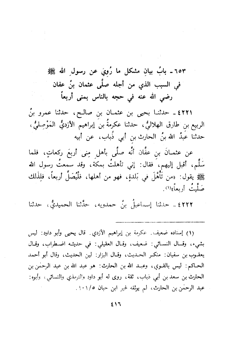 4221 - حَدَّثَنَا يَحْيَى بْنُ عُثْمَانَ بْنِ صَالِحٍ، حَدَّثَنَا عَمْرُو بْنُ الرَّبِيعِ بْنِ طَارِقٍ الْهِلَالِيُّ، حَدَّثَنَا عِكْرِمَةُ بْنُ إِبْرَاهِيمَ الْأَزْدِيُّ الْمَوْصِلِيُّ، حَدَّثَنَا عَبْدُ اللهِ بْنُ الْحَارِثِ بْنِ أَبِي ذُبَابٍ، عَنْ أَبِيهِ، عَنْ عُثْمَانَ بْنِ عَفَّانَ أَنَّهُ صَلَّى بِأَهْلِ مِنًى أَرْبَعَ رَكَعَاتٍ، فَلَمَّا سَلَّمَ، أَقْبَلَ إِلَيْهِمْ، فَقَالَ: " إِنِّي تَأَهَّلْتُ بِمَكَّةَ، وَقَدْ سَمِعْتُ رَسُولَ اللهِ صَلَّى اللَّهُ عَلَيْهِ وَسَلَّمَ يَقُولُ: " مَنْ تَأَهَّلَ فِي بَلْدَةٍ، فَهُوَ مِنْ أَهْلِهَا، فَلْيُصَلِّ أَرْبَعًا " فَلِذَلِكَ صَلَّيْتُ أَرْبَعًا "