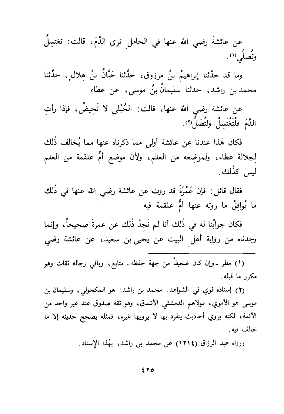 وَمَا قَدْ حَدَّثَنَا إِبْرَاهِيمُ بْنُ مَرْزُوقٍ، حَدَّثَنَا حَبَّانُ بْنُ هِلَالٍ، حَدَّثَنَا مُحَمَّدُ بْنُ رَاشِدٍ، حَدَّثَنَا سُلَيْمَانُ بْنُ مُوسَى، عَنْ عَطَاءٍ، عَنْ عَائِشَةَ رَضِيَ اللهُ عَنْهَا، قَالَتْ: " الْحُبْلَى لَا تَحِيضُ، فَإِذَا رَأَتِ الدَّمَ فَلْتَغْتَسِلْ وَلْتُصَلِّ " فَكَانَ هَذَا عِنْدَنَا عَنْ عَائِشَةَ أَوْلَى مِمَّا ذَكَرْنَاهُ عَنْهَا مِمَّا يُخَالِفُ ذَلِكَ، لِجَلَالَةِ عَطَاءٍ، وَلِمَوْضِعِهِ مِنَ الْعِلْمِ؛ وَلِأَنَّ مَوْضِعَ أُمِّ عَلْقَمَةَ مِنَ الْعِلْمِ لَيْسَ كَذَلِكَ فَقَالَ قَائِلٌ: فَإِنَّ عَمْرَةَ قَدْ رَوَتْ عَنْ عَائِشَةَ رَضِيَ اللهُ عَنْهَا فِي ذَلِكَ مَا يُوَافِقُ مَا رَوَتْهُ عَنْهَا أُمُّ عَلْقَمَةَ فِيهِ، فَكَانَ جَوَابَنَا لَهُ فِي ذَلِكَ أَنَّا لَمُ نَجِدْ ذَلِكَ عَنْ عَمْرَةَ صَحِيحًا، وَإِنَّمَا وَجَدْنَاهُ مِنْ رِوَايَةِ أَهْلِ الْبَيْتِ عَنْ يَحْيَى بْنِ سَعِيدٍ، عَنْ عَائِشَةَ رَضِيَ -[426]- اللهُ عَنْهَا بِلَا ذِكْرٍ لِعَمْرَةَ فِيهِ