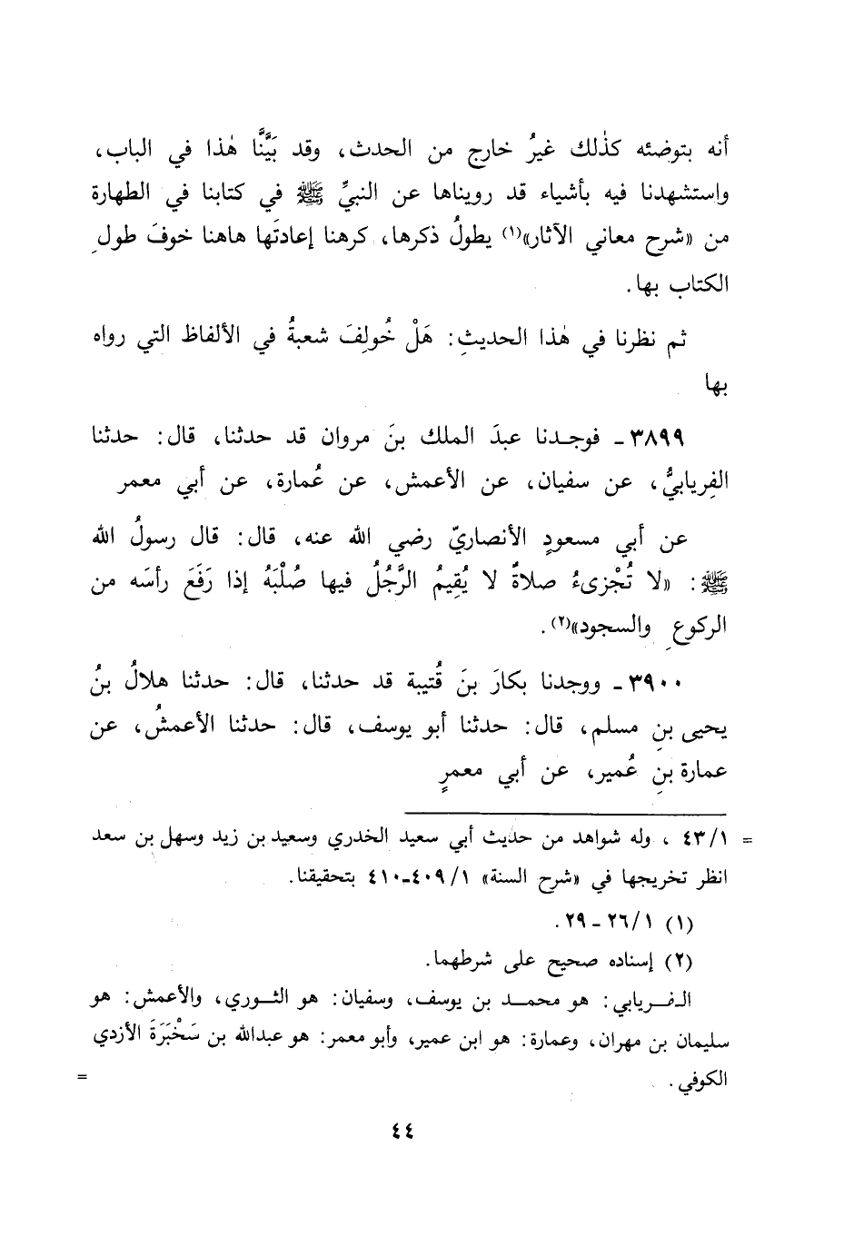 3900 - وَوَجَدْنَا بَكَّارَ بْنَ قُتَيْبَةَ قَدْ حَدَّثَنَا، قَالَ حَدَّثَنَا هِلَالُ بْنُ يَحْيَى بْنِ مُسْلِمٍ، قَالَ: حَدَّثَنَا أَبُو يُوسُفَ، قَالَ: حَدَّثَنَا الْأَعْمَشُ، عَنْ عُمَارَةَ بْنِ عُمَيْرٍ، عَنْ أَبِي مَعْمَرٍ، -[45]- عَنْ أَبِي مَسْعُودٍ الْأَنْصَارِيِّ، قَالَ: قَالَ رَسُولُ اللهِ صَلَّى اللَّهُ عَلَيْهِ وَسَلَّمَ: " لَا تُجْزِئُ صَلَاةٌ لَا يُقِيمُ الرَّجُلُ فِيهَا ظَهْرَهُ فِي الرُّكُوعِ وَالسُّجُودِ " فَتَأَمَّلْنَا مَا رَوَى الثَّوْرِيُّ وَأَبُو يُوسُفَ هَذَا الْحَدِيثَ عَلَيْهِ عَنِ الْأَعْمَشِ هَلْ يُخَالِفُ مَعْنَاهُ مَعْنَى مَا رَوَاهُ عَلَيْهِ شُعْبَةُ عَنْهُ أَمْ لَا؟ فَوَجَدْنَا قَوْلَهُ: " لَا تُجْزِئُ صَلَاةٌ لَا يُقِيمُ الرَّجُلُ فِيهَا صُلْبَهُ إِذَا رَفَعَ رَأْسَهُ مِنَ الرُّكُوعِ وَالسُّجُودِ " قَدْ يَحْتَمِلُ أَنْ يَكُونَ أُرِيدَ بِهِ: لَا تُجْزِئُهُ الْإِجْزَاءَ الَّذِي هُوَ أَعْلَى مَرَاتِبِ الْإِحْسَانِ، وَهُوَ أَوْلَى مَا حُمِلَ عَلَيْهِ حَتَّى تَتَّفِقَ مَعَانِي الرِّوَايَاتِ الَّتِي رُوِيَ عَلَيْهَا، وَلَا تَخْتَلِفُ ثُمَّ نَظَرْنَا: هَلْ رَوَى هَذَا الْحَدِيثَ عَنِ النَّبِيِّ صَلَّى اللَّهُ عَلَيْهِ وَسَلَّمَ غَيْرُ أَبِي مَسْعُودٍ أَمْ لَا؟