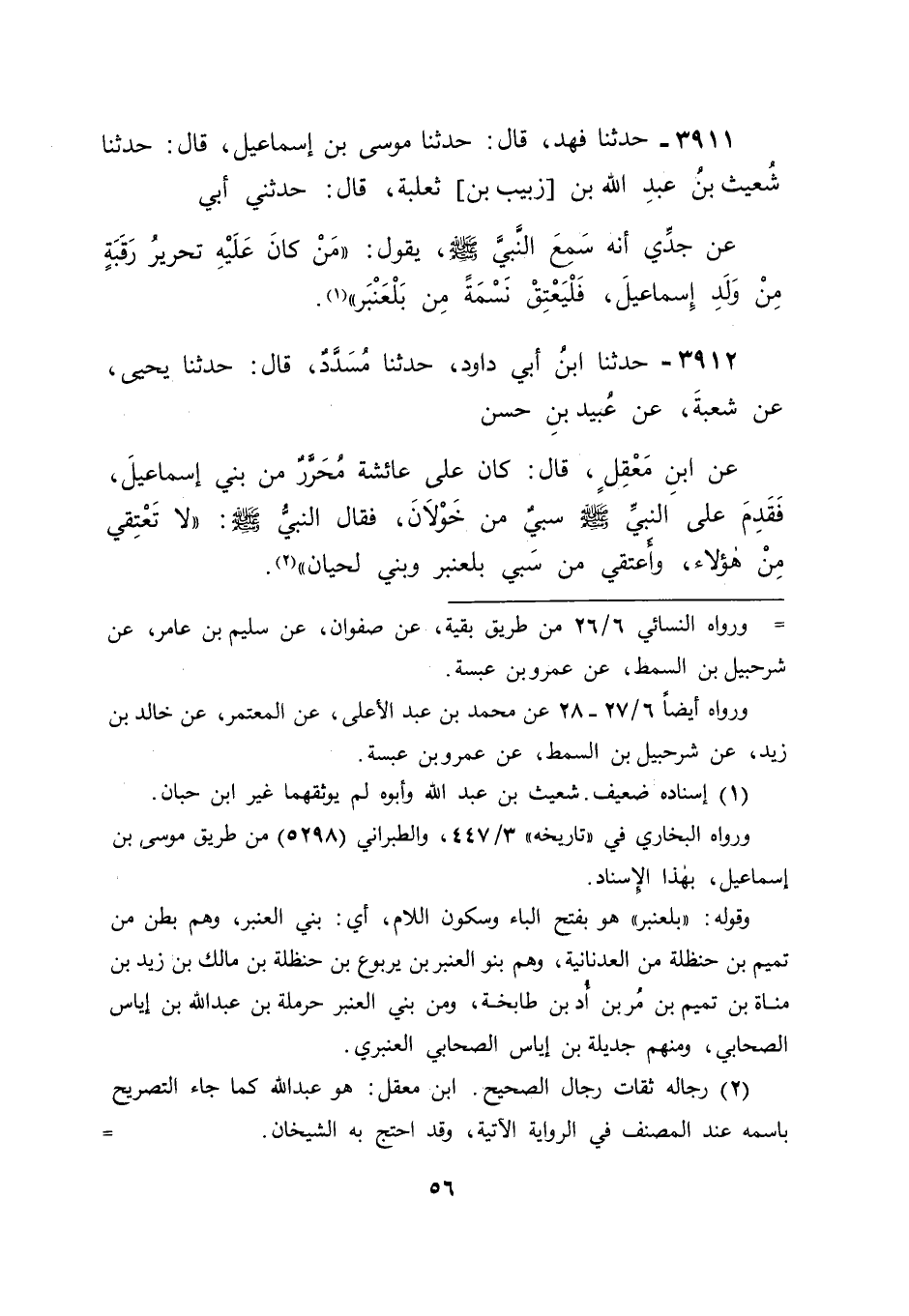3912 - حَدَّثَنَا ابْنُ أَبِي دَاوُدَ، حَدَّثَنَا مُسَدَّدٌ، قَالَ: حَدَّثَنَا يَحْيَى، عَنْ شُعْبَةَ، عَنْ عُبَيْدِ بْنِ حَسَنٍ، عَنِ ابْنِ مَعْقِلٍ، قَالَ: كَانَ عَلَى عَائِشَةَ مُحَرَّرٌ مِنْ بَنِي إِسْمَاعِيلَ، فَقَدِمَ عَلَى النَّبِيِّ صَلَّى اللَّهُ عَلَيْهِ وَسَلَّمَ سَبْيٌ مِنْ خَوْلَانَ، فَقَالَ النَّبِيُّ صَلَّى اللَّهُ عَلَيْهِ وَسَلَّمَ: " لَا تَعْتِقِي مِنْ هَؤُلَاءِ، وَأَعْتِقِي مِنْ سَبْيِ بَلْعَنْبَرٍ وَبَنِي لِحْيَانَ " -[57]-