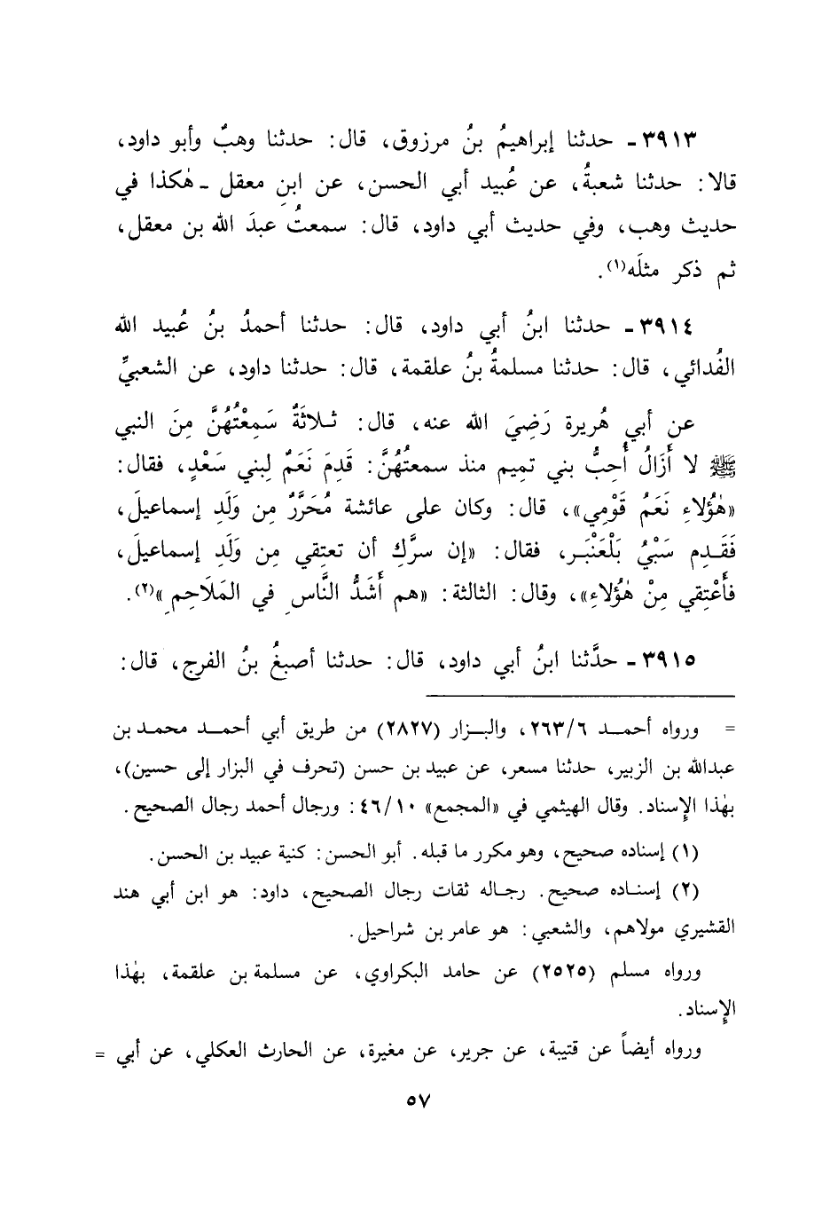 3914 - حَدَّثَنَا ابْنُ أَبِي دَاوُدَ، قَالَ: حَدَّثَنَا أَحْمَدُ بْنُ عُبَيْدِ اللهِ الْفِدَائِيُّ، قَالَ: حَدَّثَنَا مَسْلَمَةُ بْنُ عَلْقَمَةَ، قَالَ: حَدَّثَنَا دَاوُدُ، عَنِ الشَّعْبِيِّ، عَنْ أَبِي هُرَيْرَةَ رَضِيَ اللهُ عَنْهُ، قَالَ: ثَلَاثَةٌ سَمِعْتُهُنَّ مِنَ النَّبِيِّ صَلَّى اللَّهُ عَلَيْهِ وَسَلَّمَ لَا أَزَالُ أُحِبُّ بَنِي تَمِيمٍ مُنْذُ سَمِعْتُهُنَّ: قَدِمَ نَعَمٌ لِبَنِي سَعْدٍ، فَقَالَ: " هَؤُلَاءِ نَعَمُ قَوْمِي " قَالَ: وَكَانَ عَلَى عَائِشَةَ مُحَرَّرٌ مِنْ وَلَدِ إِسْمَاعِيلَ، فَقَدِمَ سَبْيُ بَلْعَنْبَرٍ، فَقَالَ: " إِنْ سَرَّكِ أَنْ تَعْتِقِي مِنْ وَلَدِ إِسْمَاعِيلَ، فَأَعْتِقِي مِنْ هَؤُلَاءِ " وَقَالَ الثَّالِثَةَ: " هُمْ أَشَدُّ النَّاسِ فِي الْمَلَاحِمِ "