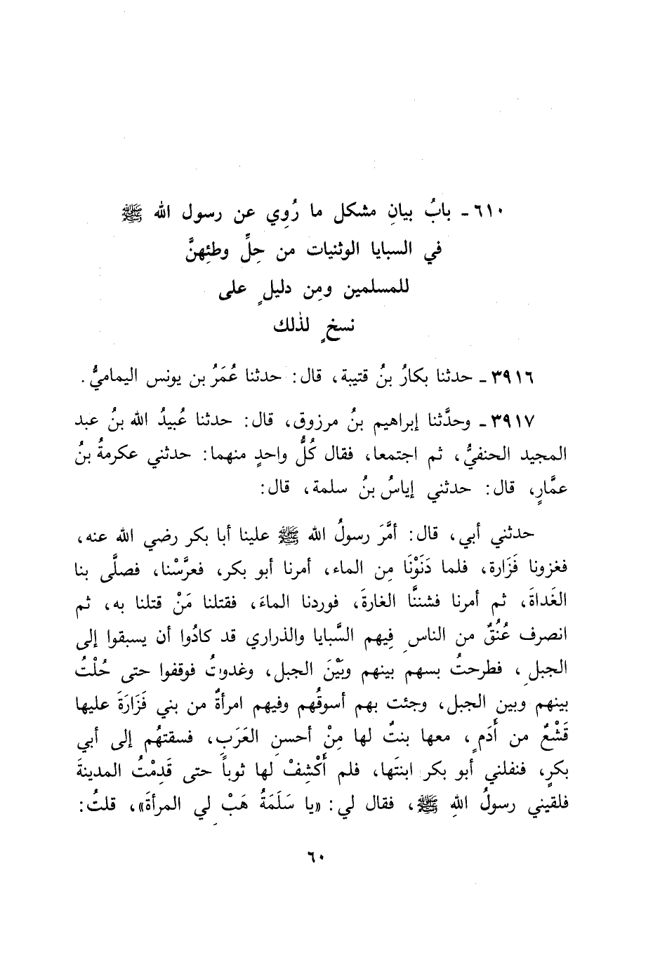 3917 - وَحَدَّثَنَا إِبْرَاهِيمُ بْنُ مَرْزُوقٍ، قَالَ: حَدَّثَنَا عُبَيْدُ اللهِ بْنُ عَبْدِ الْمَجِيدِ الْحَنَفِيُّ، ثُمَّ اجْتَمَعَا، فَقَالَ كُلُّ وَاحِدٍ مِنْهُمَا: حَدَّثَنِي عِكْرِمَةُ بْنُ عَمَّارٍ، قَالَ: حَدَّثَنِي إِيَّاسُ بْنُ سَلَمَةَ، قَالَ: حَدَّثَنِي أَبِي، قَالَ: " أَمَّرَ رَسُولُ اللهِ صَلَّى اللَّهُ عَلَيْهِ وَسَلَّمَ عَلَيْنَا أَبَا بَكْرٍ رَضِيَ اللهُ عَنْهُ، فَغَزَوْنَا فَزَارَةَ، فَلَمَّا دَنَوْنَا مِنَ الْمَاءِ، أَمَرَنَا أَبُو بَكْرٍ فَعَرَّسْنَا، فَصَلَّى بِنَا الْغَدَاةَ، ثُمَّ أَمَرَنَا فَشَنَنَّا الْغَارَةَ، فَوَرَدْنَا الْمَاءَ، فَقَتَلْنَا مَنْ قَتَلْنَا بِهِ، ثُمَّ انْصَرَفَ عُنُقٌ مِنَ النَّاسِ فِيهِمُ السَّبَايَا وَالذَّرَارِيُّ قَدْ كَادُوا أَنْ يَسْبِقُوا إِلَى الْجَبَلِ، فَطَرَحْتُ بِسَهْمٍ بَيْنَهُمْ وَبَيْنَ الْجَبَلِ، وَغَدَوْتُ فَوَقَفُوا حَتَّى حُلْتُ بَيْنَهُمْ وَبَيْنَ الْجَبَلِ، وَجِئْتُ بِهِمْ أَسُوقُهُمْ وَفِيهِمُ امْرَأَةٌ مِنْ بَنِي فَزَارَةَ عَلَيْهَا قَشْعٌ مِنْ أَدَمٍ، مَعَهَا بِنْتٌ لَهَا مِنْ أَحْسَنِ الْعَرَبِ، فَسُقْتُهُمْ إِلَى أَبِي بَكْرٍ، فَنَفَّلَنِي أَبُو بَكْرٍ ابْنَتَهَا، فَلَمْ أَكْشِفْ لَهَا ثَوْبًا حَتَّى قَدِمْتُ الْمَدِينَةَ فَلَقِيَنِي رَسُولُ اللهِ صَلَّى اللَّهُ عَلَيْهِ وَسَلَّمَ، فَقَالَ لِي: " يَا سَلَمَةُ، هَبْ لِيَ الْمَرْأَةَ " قُلْتُ: -[61]- يَا نَبِيَّ اللهِ، وَاللهِ لَقَدْ أَعْجَبَتْنِي، وَمَا كَشَفْتُ لَهَا ثَوْبًا، فَسَكَتَ حَتَّى كَانَ مِنَ الْغَدِ لَقِيَنِي، فَقَالَ لِي: " يَا سَلَمَةُ، هَبْ لِيَ الْمَرْأَةَ لِلَّهِ أَبُوكَ " فَقُلْتُ: وَاللهِ مَا كَشَفْتُ لَهَا ثَوْبًا، هِيَ لَكَ يَا رَسُولَ اللهِ، فَبَعَثَ بِهَا رَسُولُ اللهِ صَلَّى اللَّهُ عَلَيْهِ وَسَلَّمَ إِلَى مَكَّةَ فَدَى بِهَا أَسْرَى مِنَ الْمُسْلِمِينَ كَانُوا فِي أَيْدِي الْمُشْرِكِينَ " فَفِي هَذَا الْحَدِيثِ قَوْلُ سَلَمَةَ لِرَسُولِ اللهِ صَلَّى اللَّهُ عَلَيْهِ وَسَلَّمَ لَمَّا اسْتَوْهَبَهُ الْمَرْأَةَ: " وَاللهِ لَقَدْ أَعْجَبَتْنِي وَمَا كَشَفْتُ لَهَا ثَوْبًا "، وَتَرْكُ رَسُولِ اللهِ صَلَّى اللَّهُ عَلَيْهِ وَسَلَّمَ إِنْكَارَ ذَلِكَ عَلَيْهِ، فَفِي ذَلِكَ مَا قَدْ دَلَّ عَلَى أَنَّ وَطْأَهَا قَدْ كَانَ حِينَئِذٍ يَحِلُّ لَهُ، وَفِي مُفَادَاةِ رَسُولِ اللهِ صَلَّى اللَّهُ عَلَيْهِ وَسَلَّمَ بِهَا وَرَدِّهَا إِلَى الْمُشْرِكِينَ مَا قَدْ دَلَّ عَلَى ثُبُوتِهَا عَلَى مَا كَانَتْ عَلَيْهِ، وَعَلَى أَنَّهُ لَمْ يَكُنْ مِنْهَا إِسْلَامٌ حَلَّ بِهِ لِسَلَمَةَ وَطْؤُهَا