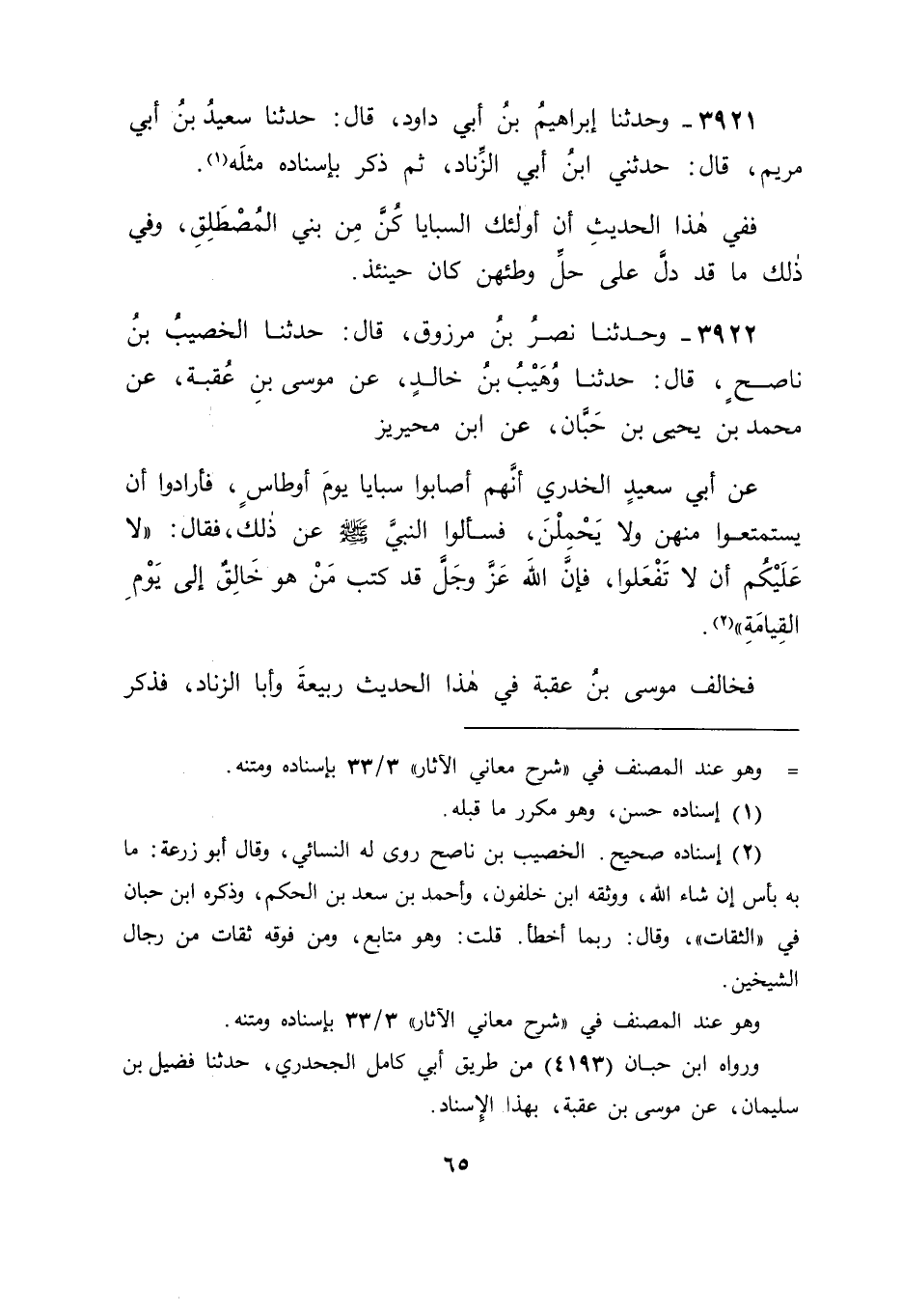 3922 - وَحَدَّثَنَا نَصْرُ بْنُ مَرْزُوقٍ، قَالَ: حَدَّثَنَا الْخَصِيبُ بْنُ نَاصِحٍ، قَالَ: حَدَّثَنَا وُهَيْبُ بْنُ خَالِدٍ، عَنْ مُوسَى بْنِ عُقْبَةَ، عَنْ مُحَمَّدِ بْنِ يَحْيَى بْنِ حَبَّانَ، عَنِ ابْنِ مُحَيْرِيزٍ، عَنْ أَبِي سَعِيدٍ الْخُدْرِيِّ: " أَنَّهُمْ أَصَابُوا سَبَايَا يَوْمَ أَوْطَاسٍ، فَأَرَادُوا أَنْ يَسْتَمْتِعُوا مِنْهُنَّ وَلَا يَحْمِلْنَ، فَسَأَلُوا النَّبِيَّ صَلَّى اللَّهُ عَلَيْهِ وَسَلَّمَ عَنْ ذَلِكَ، فَقَالَ: " لَا عَلَيْكُمُ أَنْ لَا تَفْعَلُوا، فَإِنَّ اللهَ عَزَّ وَجَلَّ قَدْ كَتَبَ مَنْ هُوَ خَالِقٌ إِلَى يَوْمِ الْقِيَامَةِ " فَخَالَفَ مُوسَى بْنُ عُقْبَةَ فِي هَذَا الْحَدِيثِ رَبِيعَةَ وَأَبَا الزِّنَادِ، فَذَكَرَ -[66]- فِيهِ أَنَّ أُولَئِكَ السَّبَايَا مِنْ سَبَايَا أَوْطَاسٍ، وَقَالَ فِيهِ رَبِيعَةُ وَأَبُو الزِّنَادِ: إِنَّهُنَّ مِنْ بَنِي الْمُصْطَلِقِ، وَذَلِكَ اخْتِلَافٌ شَدِيدٌ؛ لِأَنَّ غَزْوَةَ بَنِي الْمُصْطَلِقِ كَانَتْ فِي سِتٍّ مِنَ الْهِجْرَةِ، وَغَزْوَةَ أَوْطَاسٍ وَهِيَ غَزْوَةُ حُنَيْنٍ كَانَتْ بَعْدَهَا بِسَنَتَيْنِ، وَكَانَتْ فِي سَنَةِ ثَمَانٍ مِنَ الْهِجْرَةِ فَنَظَرْنَا فِي حَقِيقَةِ ذَلِكَ مِنْ رِوَايَةِ غَيْرِهِمْ مَا هِيَ؟