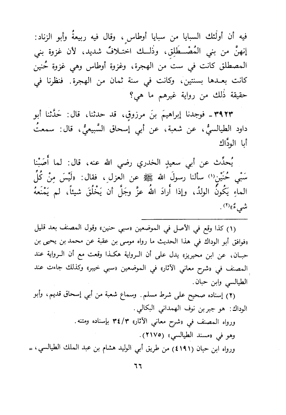 3923 - فَوَجَدْنَا إِبْرَاهِيمَ بْنَ مَرْزُوقٍ، قَدْ حَدَّثَنَا، قَالَ: حَدَّثَنَا أَبُو دَاوُدَ الطَّيَالِسِيُّ، عَنْ شُعْبَةَ، عَنْ أَبِي إِسْحَاقَ السَّبِيعِيِّ، قَالَ: سَمِعْتُ أَبَا الْوَدَّاكِ، يُحَدِّثُ عَنْ أَبِي سَعِيدٍ الْخُدْرِيِّ رَضِيَ اللهُ عَنْهُ، قَالَ: " لَمَّا أَصَبْنَا سَبْيَ حُنَيْنٍ سَأَلْنَا رَسُولَ اللهِ صَلَّى اللَّهُ عَلَيْهِ وَسَلَّمَ عَنِ الْعَزْلِ، فَقَالَ: " لَيْسَ مِنْ كُلِّ الْمَاءِ يَكُونُ الْوَلَدُ، وَإِذَا أَرَادَ اللهُ عَزَّ وَجَلَّ أَنْ يَخْلُقَ شَيْئًا، لَمْ يَمْنَعْهُ شَيْءٌ " -[67]-